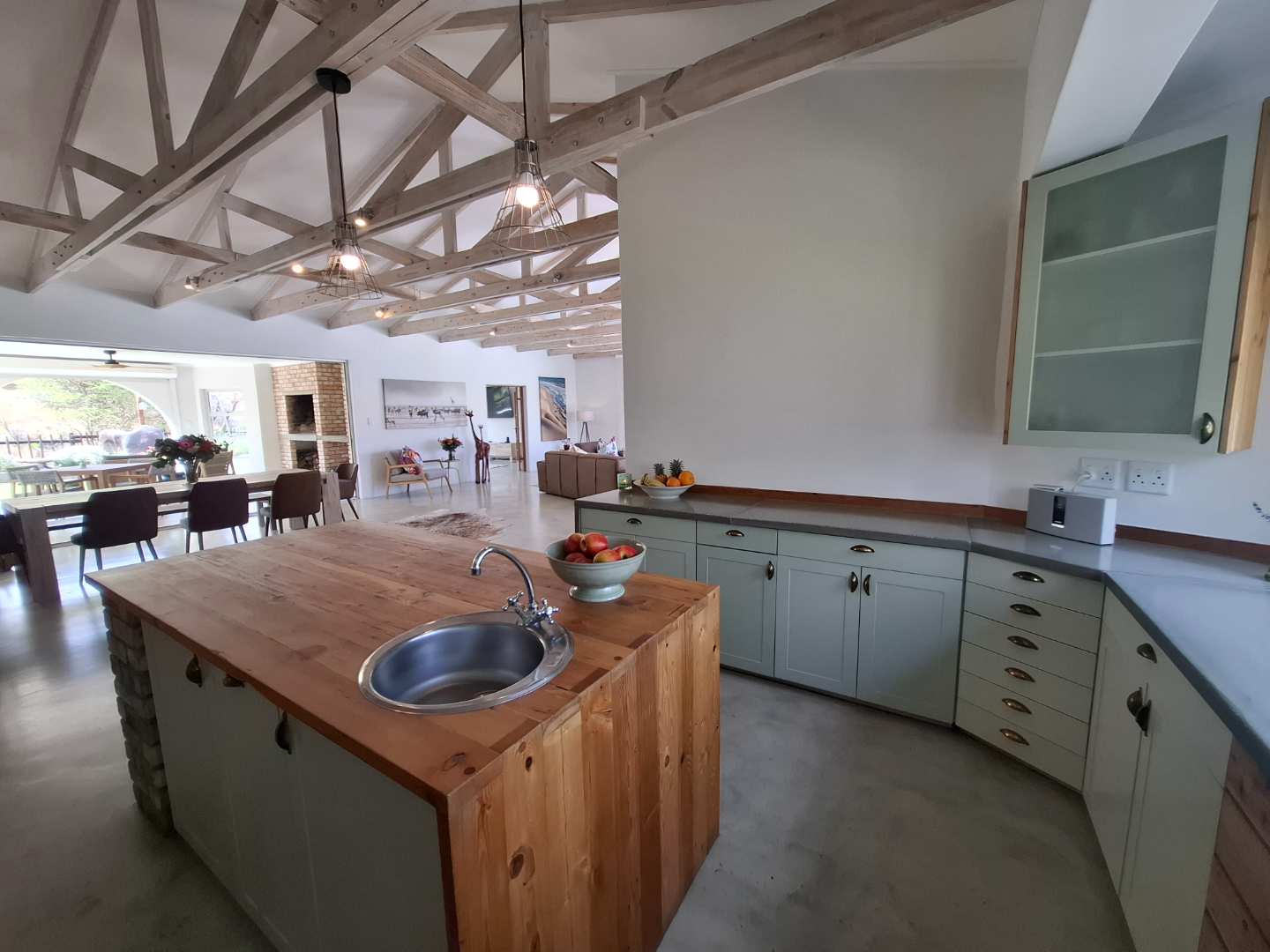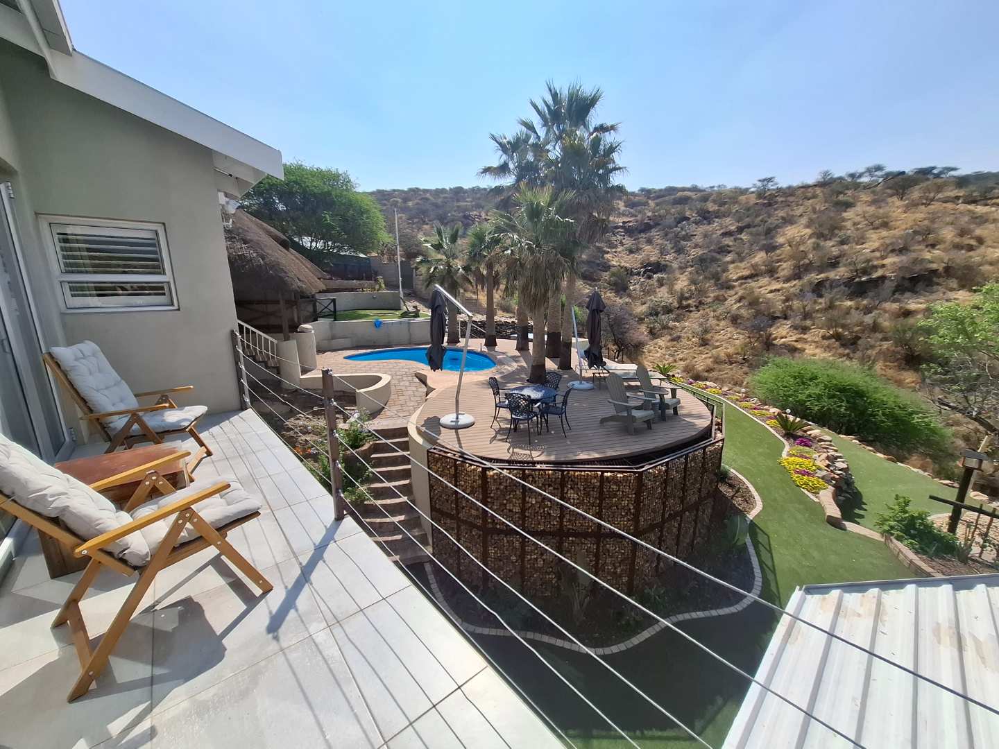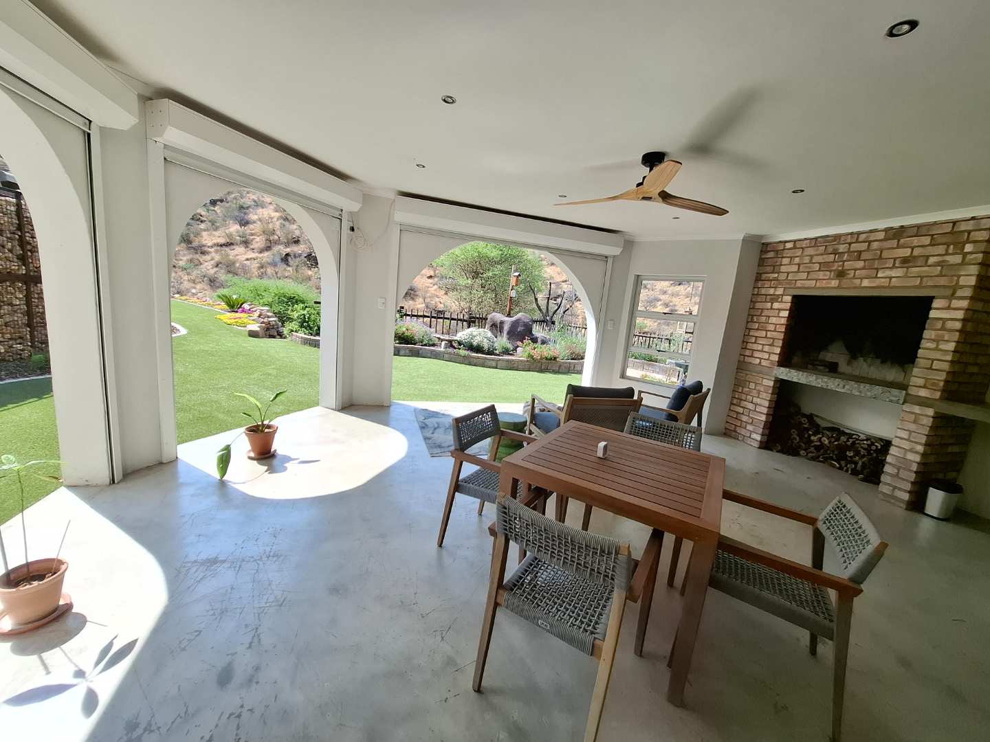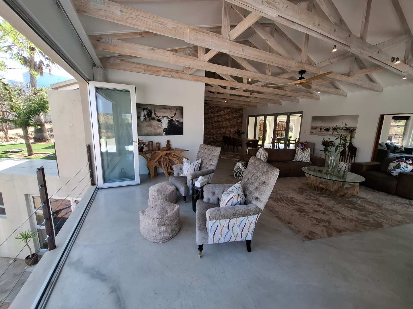 Set in a quiet cul-de-sac and meticulously maintained to exacting German standards, this move-in-ready residence offers the perfect blend of luxury, privacy, and functionality. Elevated to take full advantage of the panoramic views, the home boasts top-quality, earthy finishes throughout. The property features four generously sized bedrooms and three full bathrooms, with two en-suite bedrooms. The master suite is truly exceptional—stack-away doors on both sides open up to unparalleled views, creating an atmosphere that rivals the most luxurious honeymoon suite. The en-suite bathroom is equally impressive, offering a double vanity, oversized shower, freestanding bath, and a walk-in dressing room. An upstairs study also enjoys sweeping vistas, while a guest cloakroom adds convenience on the ground floor. The farm-style kitchen is the heart of the home, equipped with a freestanding gas stove and a spacious scullery/laundry area. Expansive, open-plan living areas are air-conditioned and centered around a cozy fireplace. Stack-away doors open fully to the outdoors, allowing for seamless indoor-outdoor flow and an immersive connection with nature. A separate TV room provides a dedicated space for family entertainment. The covered patio, featuring a large built-in BBQ, overlooks a beautifully landscaped garden and expansive deck surrounding a heated pool—ideal for sundowners, weekend gatherings, or relaxed family time. Mature palm trees add to the tranquil ambiance. For guests, a fifth bedroom in African tented style—complete with its own en-suite bathroom—offers a unique and luxurious retreat. Additional features include: Staff quarters (easily repurposed as a gym), Four garages with a workshop, Multiple storerooms, Wine cellar. Security is outstanding, with a state-of-the-art alarm system, electric fencing, CCTV surveillance, American shutters, and more.