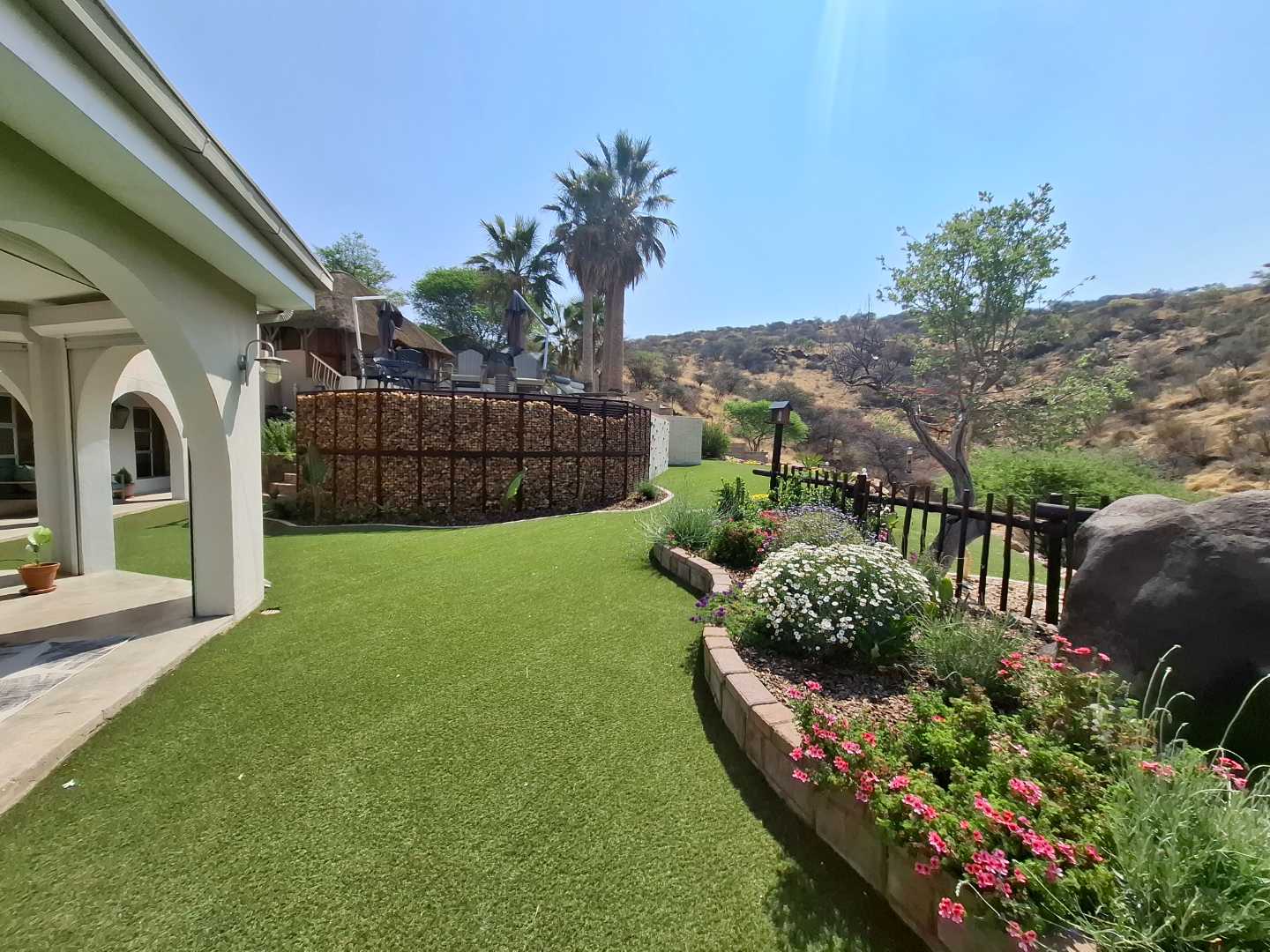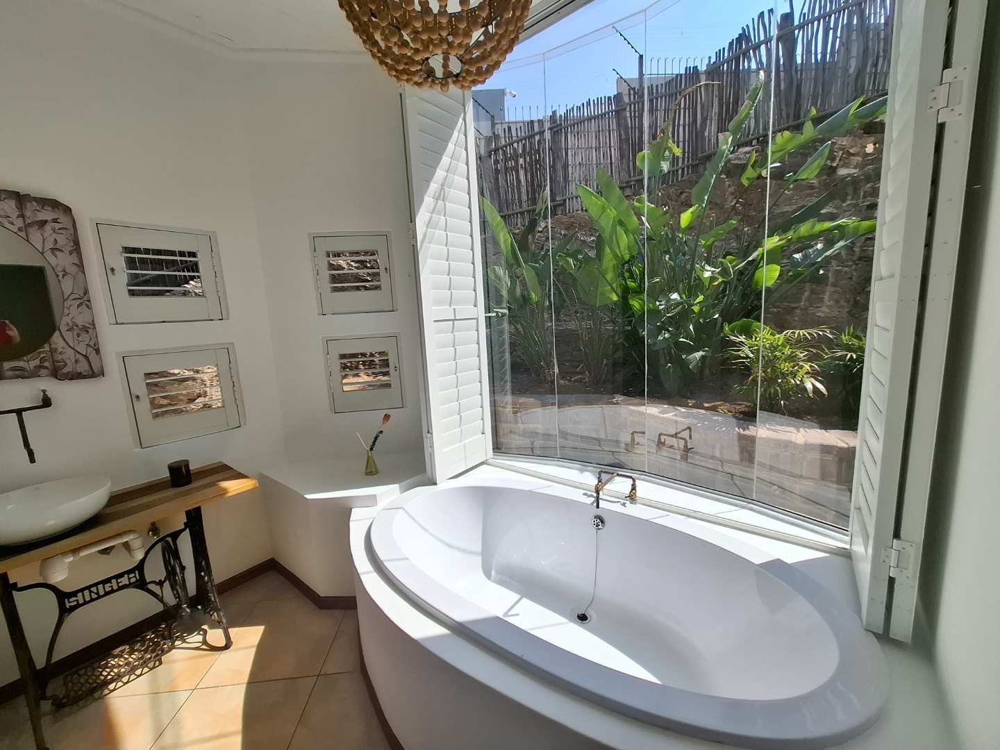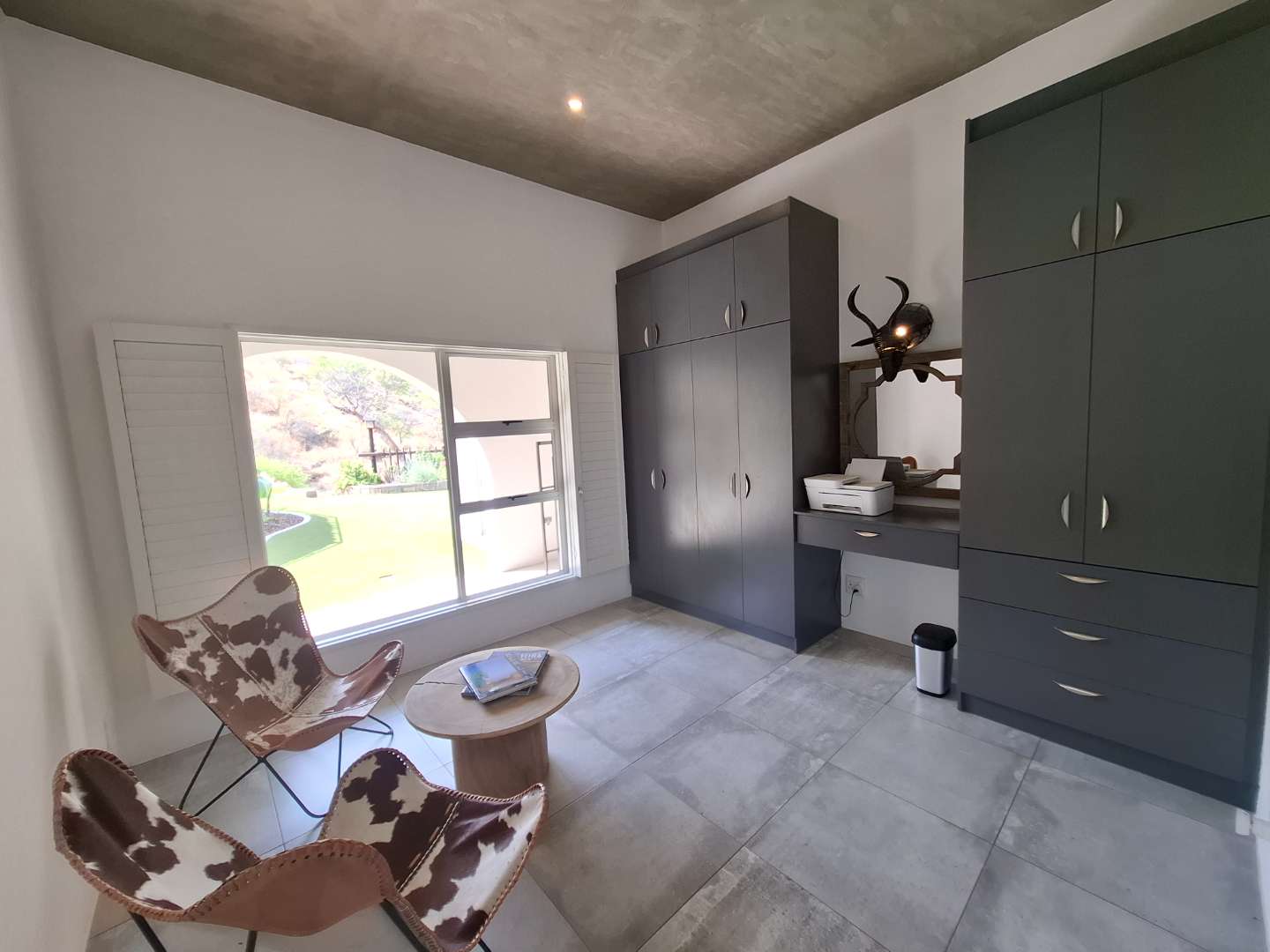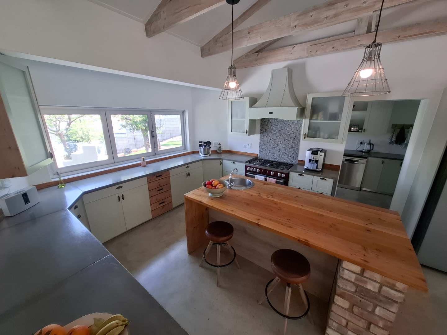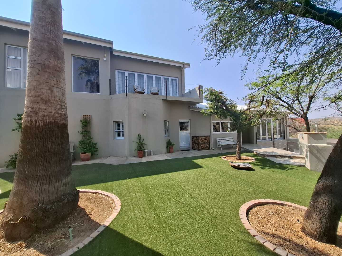 Set in a quiet cul-de-sac and meticulously maintained to exacting German standards, this move-in-ready residence offers the perfect blend of luxury, privacy, and functionality. Elevated to take full advantage of the panoramic views, the home boasts top-quality, earthy finishes throughout. The property features four generously sized bedrooms and three full bathrooms, with two en-suite bedrooms. The master suite is truly exceptional—stack-away doors on both sides open up to unparalleled views, creating an atmosphere that rivals the most luxurious honeymoon suite. The en-suite bathroom is equally impressive, offering a double vanity, oversized shower, freestanding bath, and a walk-in dressing room. An upstairs study also enjoys sweeping vistas, while a guest cloakroom adds convenience on the ground floor. The farm-style kitchen is the heart of the home, equipped with a freestanding gas stove and a spacious scullery/laundry area. Expansive, open-plan living areas are air-conditioned and centered around a cozy fireplace. Stack-away doors open fully to the outdoors, allowing for seamless indoor-outdoor flow and an immersive connection with nature. A separate TV room provides a dedicated space for family entertainment. The covered patio, featuring a large built-in BBQ, overlooks a beautifully landscaped garden and expansive deck surrounding a heated pool—ideal for sundowners, weekend gatherings, or relaxed family time. Mature palm trees add to the tranquil ambiance. For guests, a fifth bedroom in African tented style—complete with its own en-suite bathroom—offers a unique and luxurious retreat. Additional features include: Staff quarters (easily repurposed as a gym), Four garages with a workshop, Multiple storerooms, Wine cellar. Security is outstanding, with a state-of-the-art alarm system, electric fencing, CCTV surveillance, American shutters, and more.