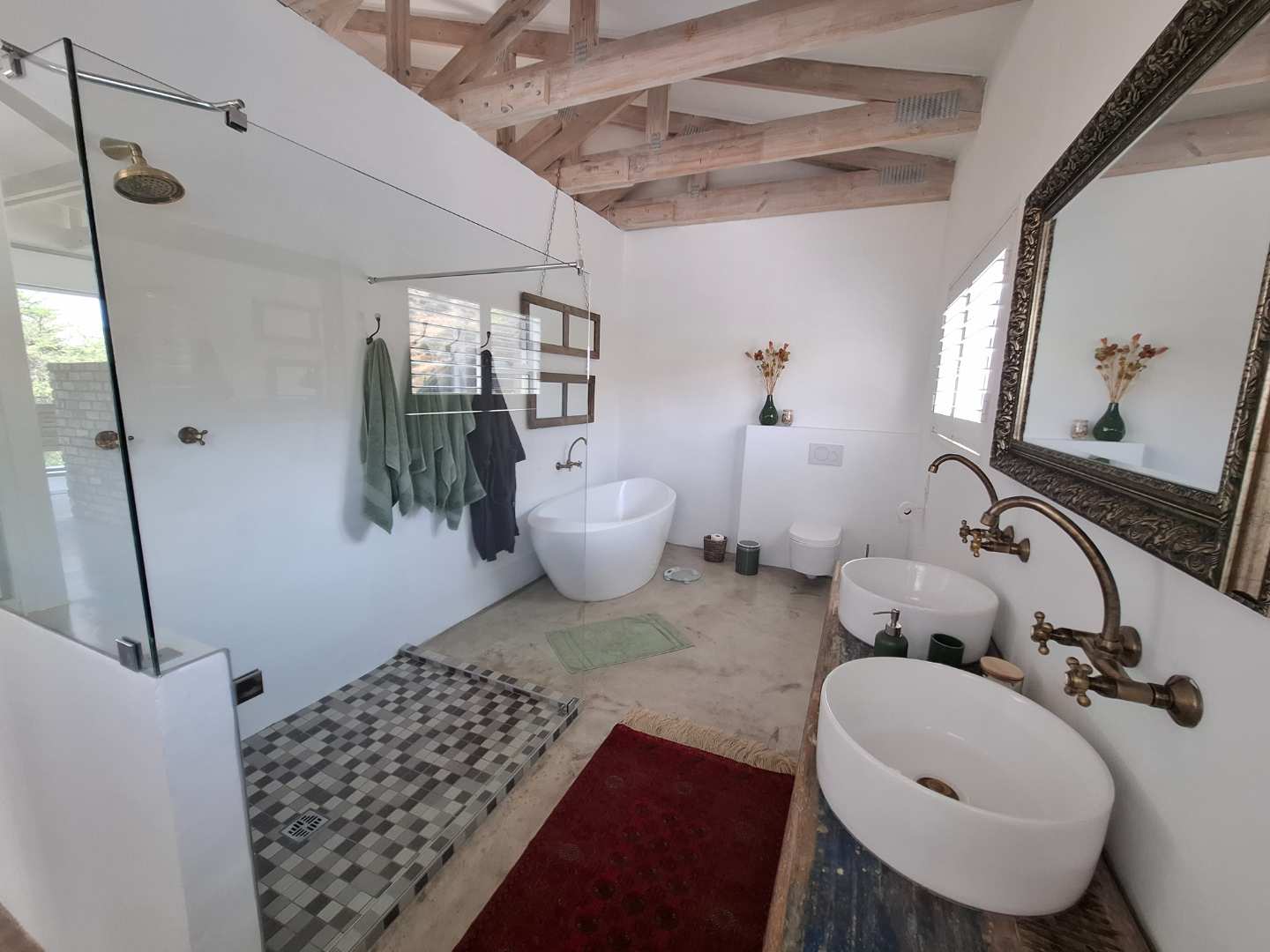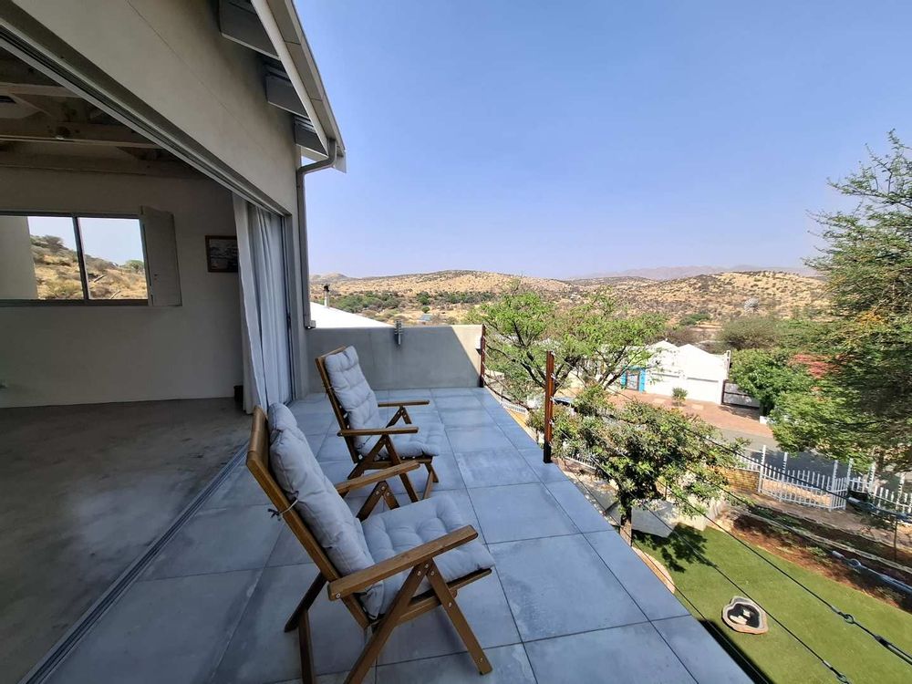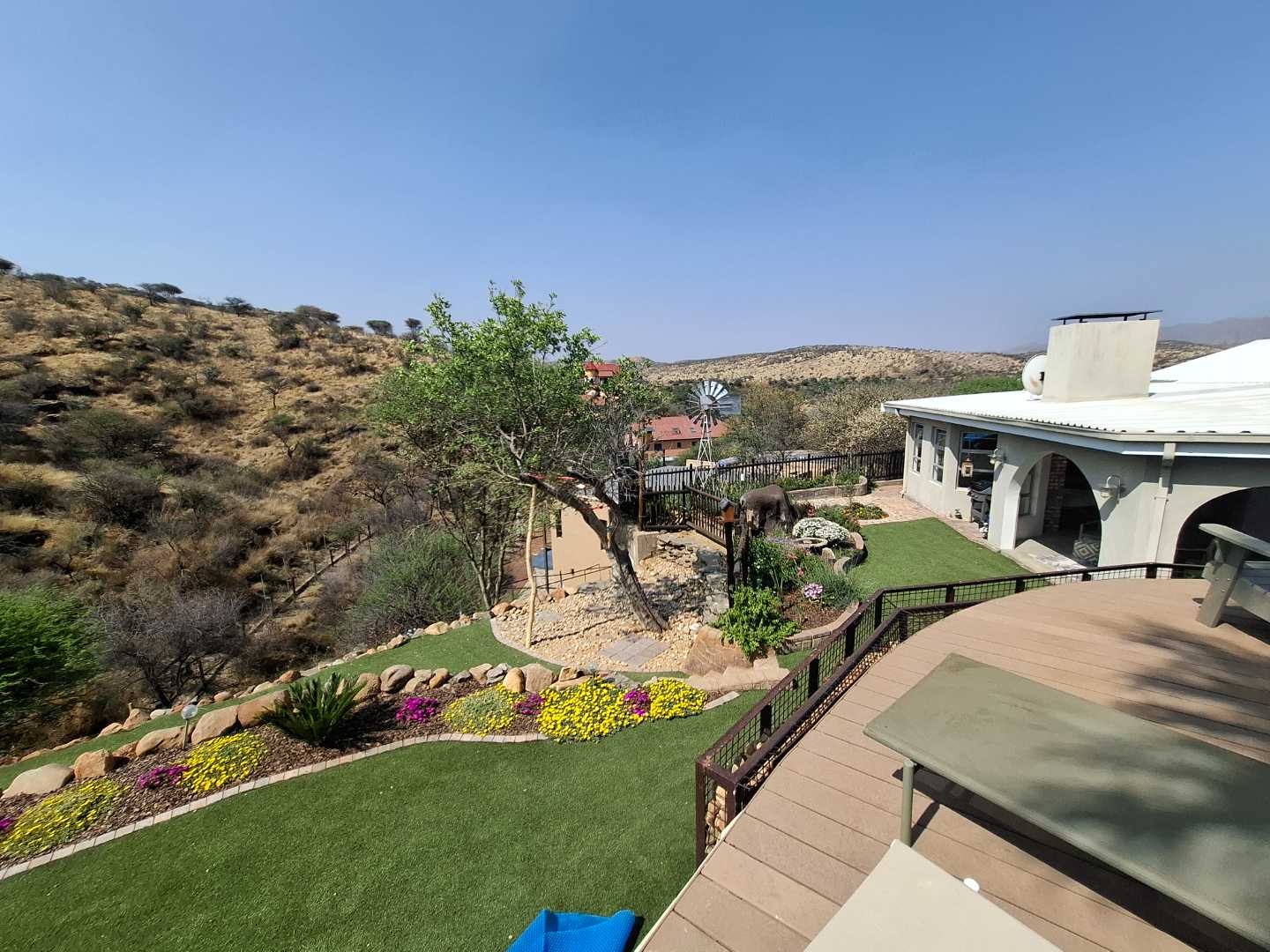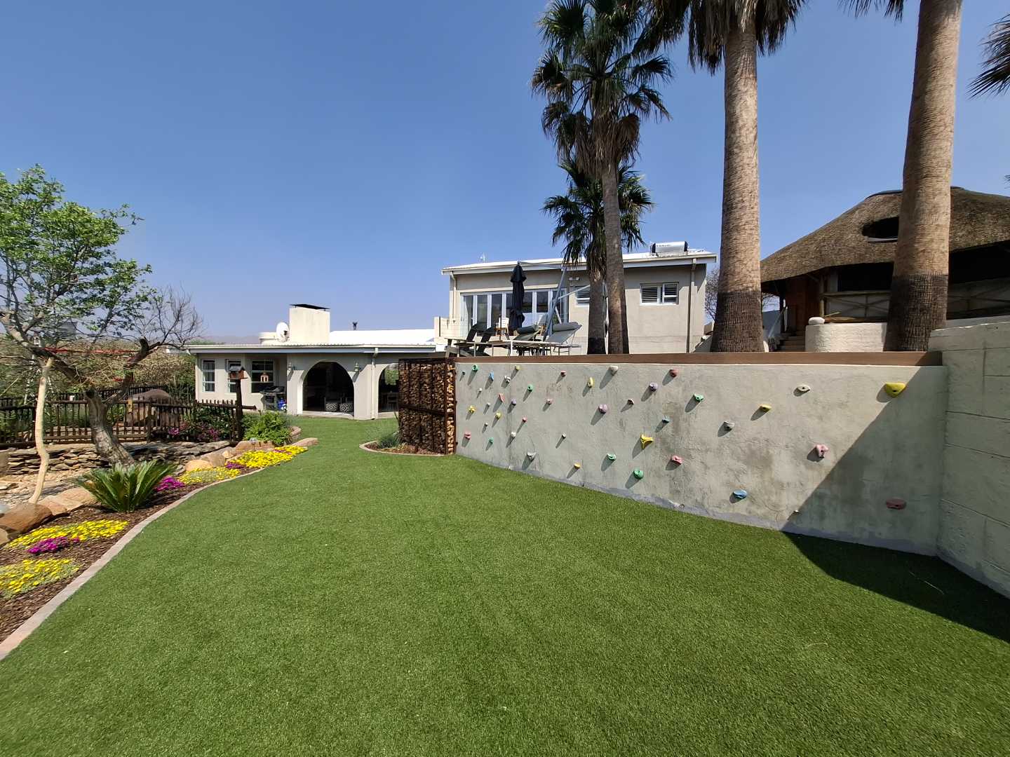 Set in a quiet cul-de-sac and meticulously maintained to exacting German standards, this move-in-ready residence offers the perfect blend of luxury, privacy, and functionality. Elevated to take full advantage of the panoramic views, the home boasts top-quality, earthy finishes throughout. The property features four generously sized bedrooms and three full bathrooms, with two en-suite bedrooms. The master suite is truly exceptional—stack-away doors on both sides open up to unparalleled views, creating an atmosphere that rivals the most luxurious honeymoon suite. The en-suite bathroom is equally impressive, offering a double vanity, oversized shower, freestanding bath, and a walk-in dressing room. An upstairs study also enjoys sweeping vistas, while a guest cloakroom adds convenience on the ground floor. The farm-style kitchen is the heart of the home, equipped with a freestanding gas stove and a spacious scullery/laundry area. Expansive, open-plan living areas are air-conditioned and centered around a cozy fireplace. Stack-away doors open fully to the outdoors, allowing for seamless indoor-outdoor flow and an immersive connection with nature. A separate TV room provides a dedicated space for family entertainment. The covered patio, featuring a large built-in BBQ, overlooks a beautifully landscaped garden and expansive deck surrounding a heated pool—ideal for sundowners, weekend gatherings, or relaxed family time. Mature palm trees add to the tranquil ambiance. For guests, a fifth bedroom in African tented style—complete with its own en-suite bathroom—offers a unique and luxurious retreat. Additional features include: Staff quarters (easily repurposed as a gym), Four garages with a workshop, Multiple storerooms, Wine cellar. Security is outstanding, with a state-of-the-art alarm system, electric fencing, CCTV surveillance, American shutters, and more.