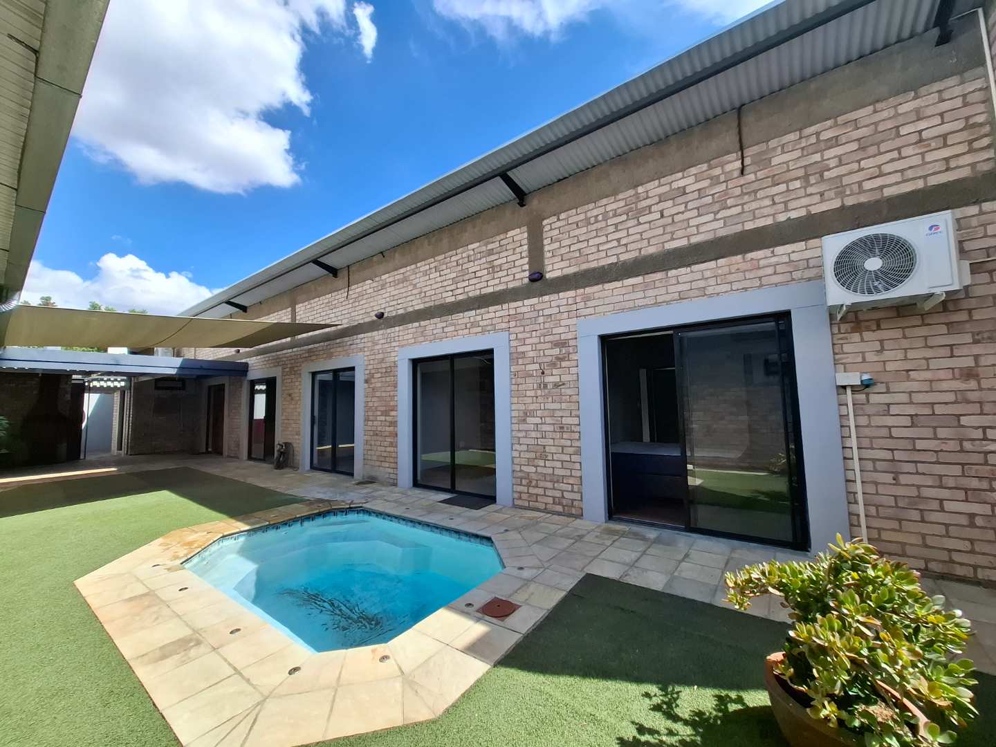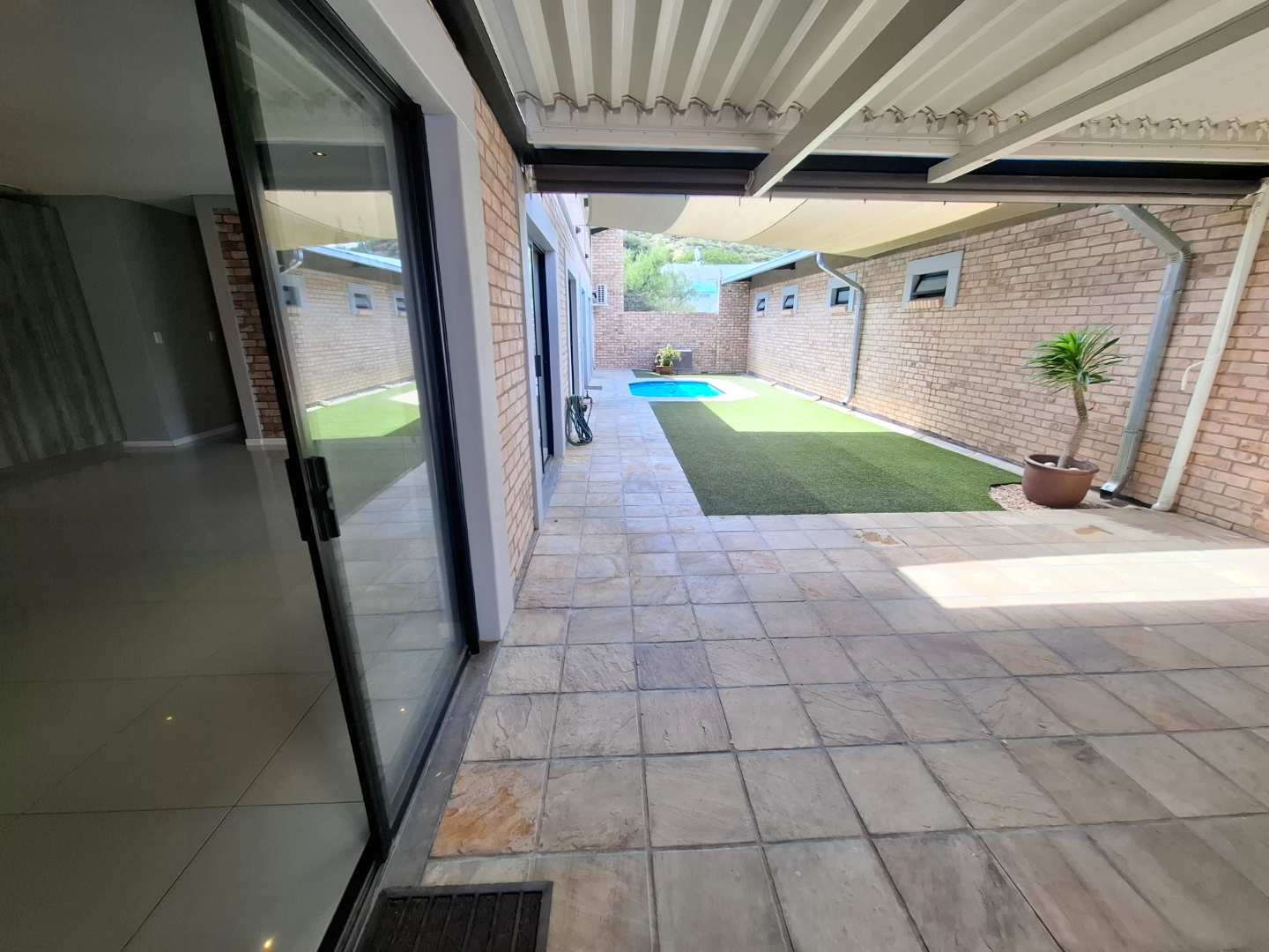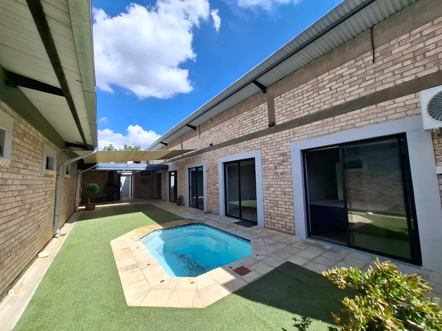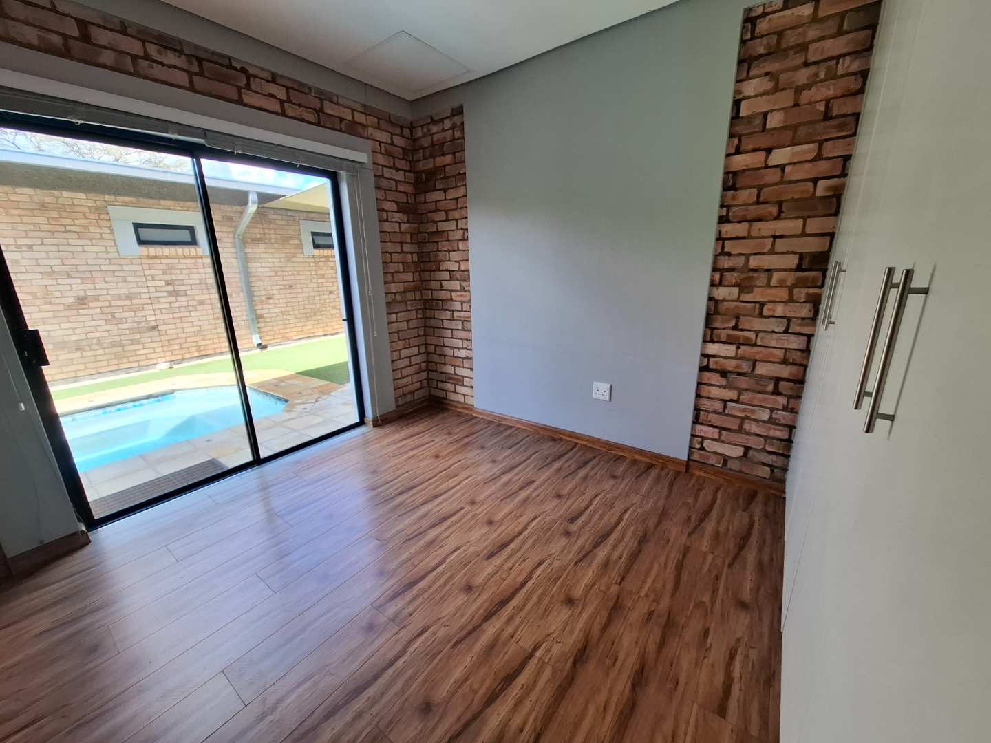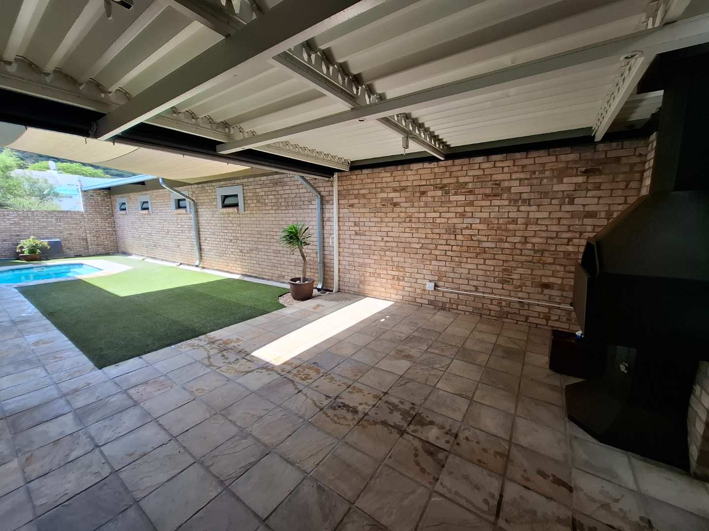 The open-plan living area is designed for seamless indoor-outdoor living, opening out to a private pool and entertainment area. This space is perfect for entertaining, with an adjustable louvre roof and built-in braai, allowing you to enjoy outdoor meals and relaxation in any weather. The living area itself is air-conditioned and features extra built-in cupboards for additional storage.
