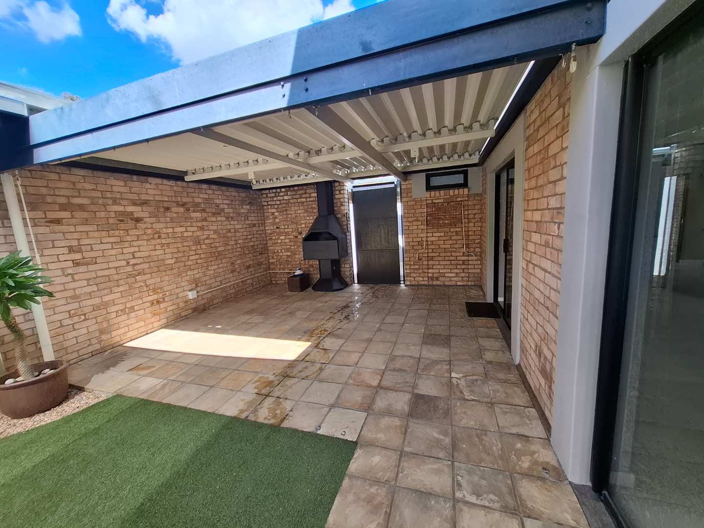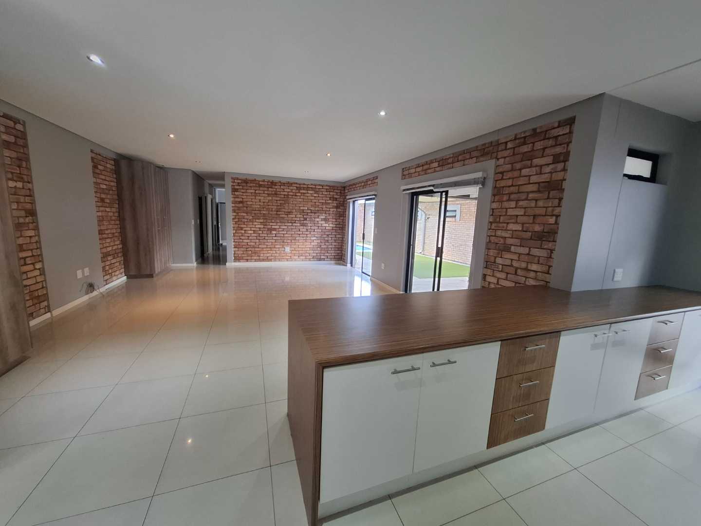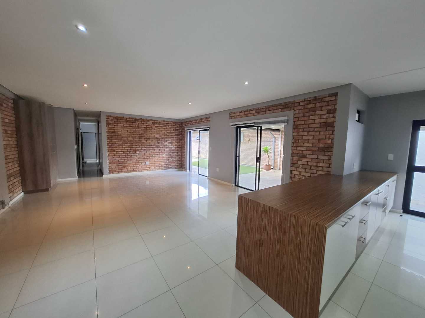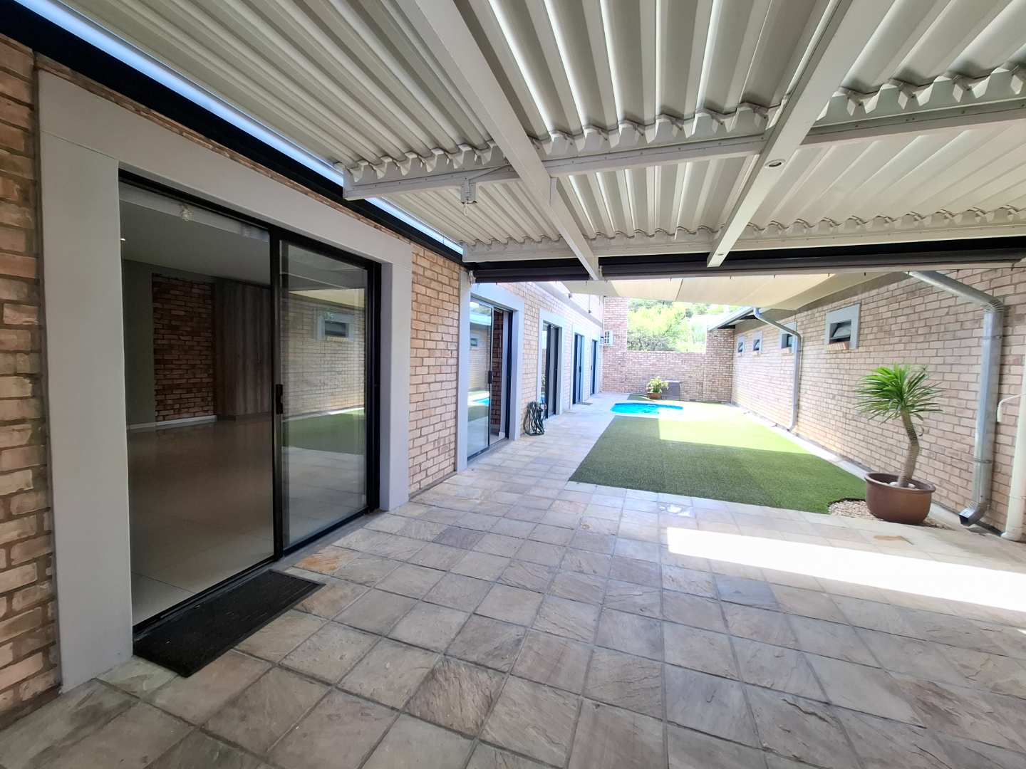 The open-plan living area is designed for seamless indoor-outdoor living, opening out to a private pool and entertainment area. This space is perfect for entertaining, with an adjustable louvre roof and built-in braai, allowing you to enjoy outdoor meals and relaxation in any weather. The living area itself is air-conditioned and features extra built-in cupboards for additional storage.