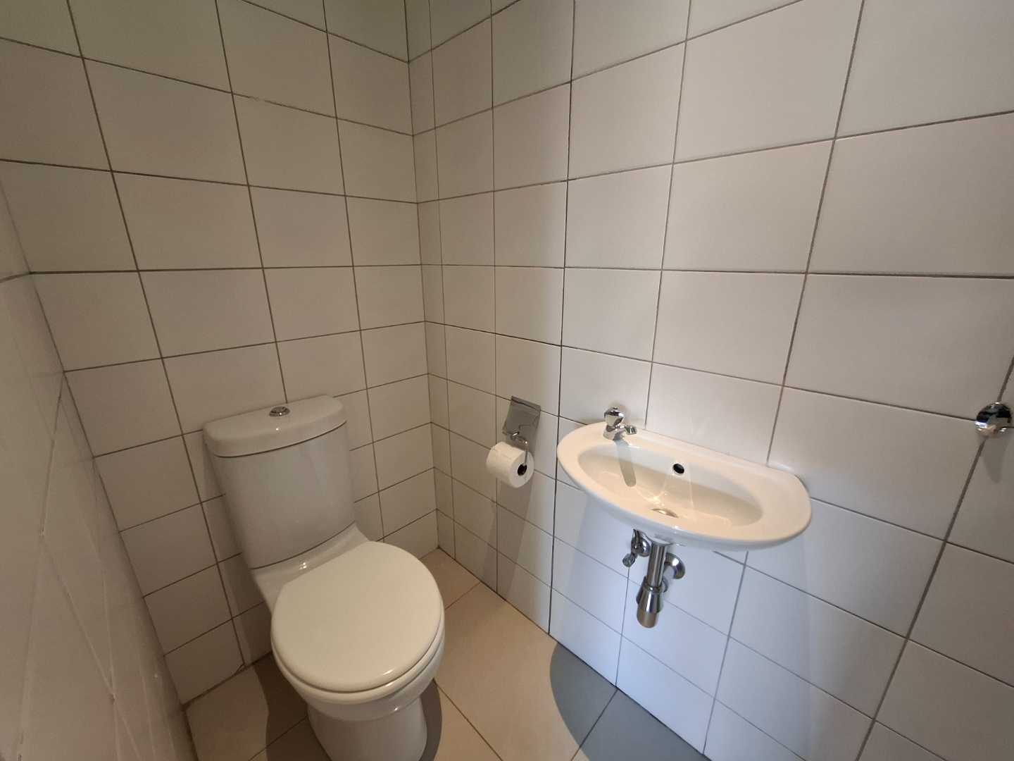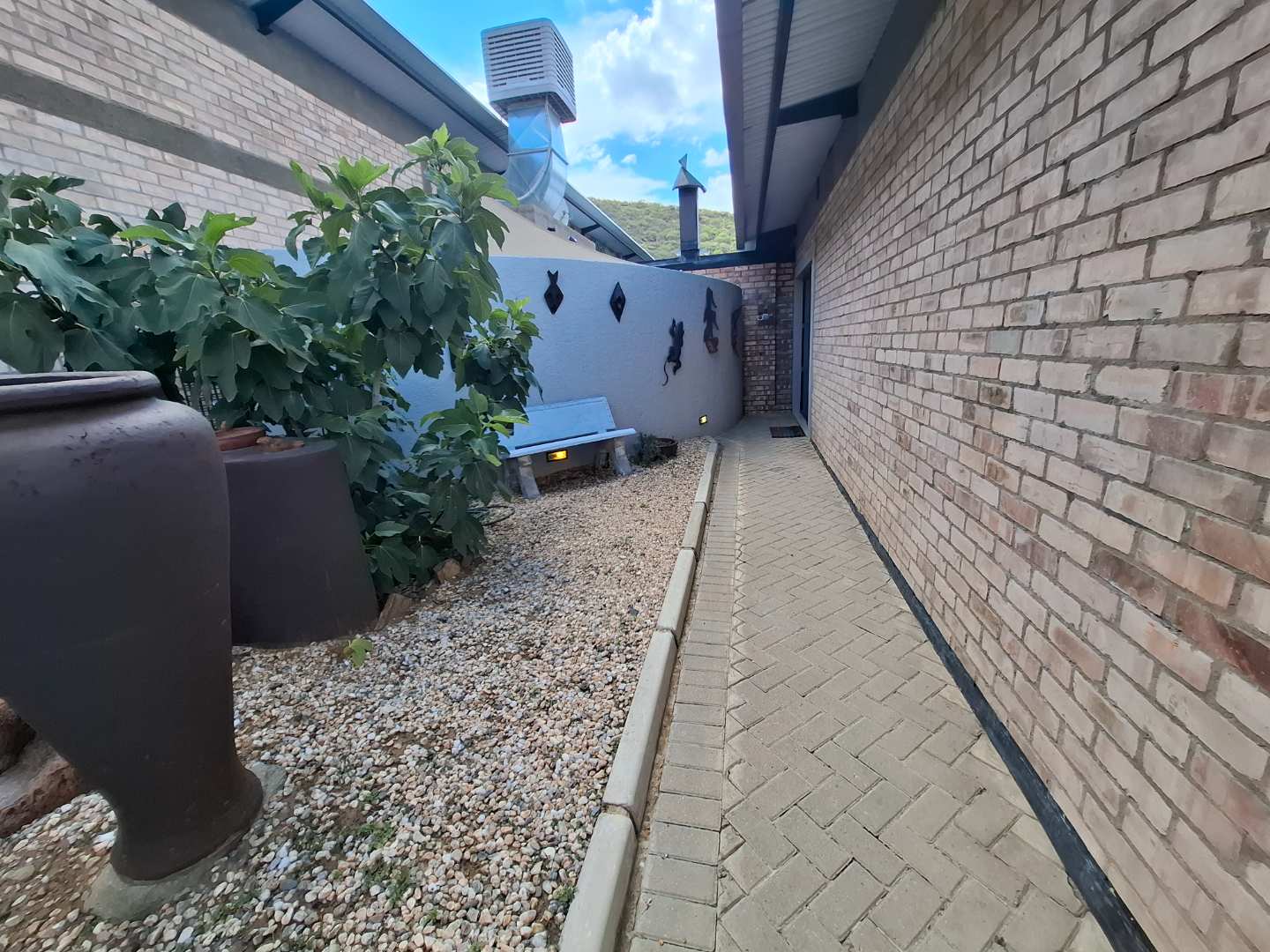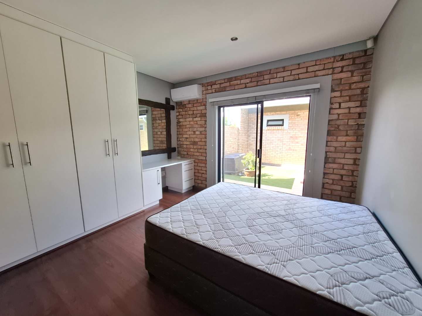 The townhouse features three spacious bedrooms, all with built-in cupboards and each opening up to the tranquil garden. The master bedroom boasts air-conditioning for year-round comfort and an en-suite bathroom with a luxurious double basin. There are two bathrooms in total, with the second bathroom conveniently serving the other two bedrooms.