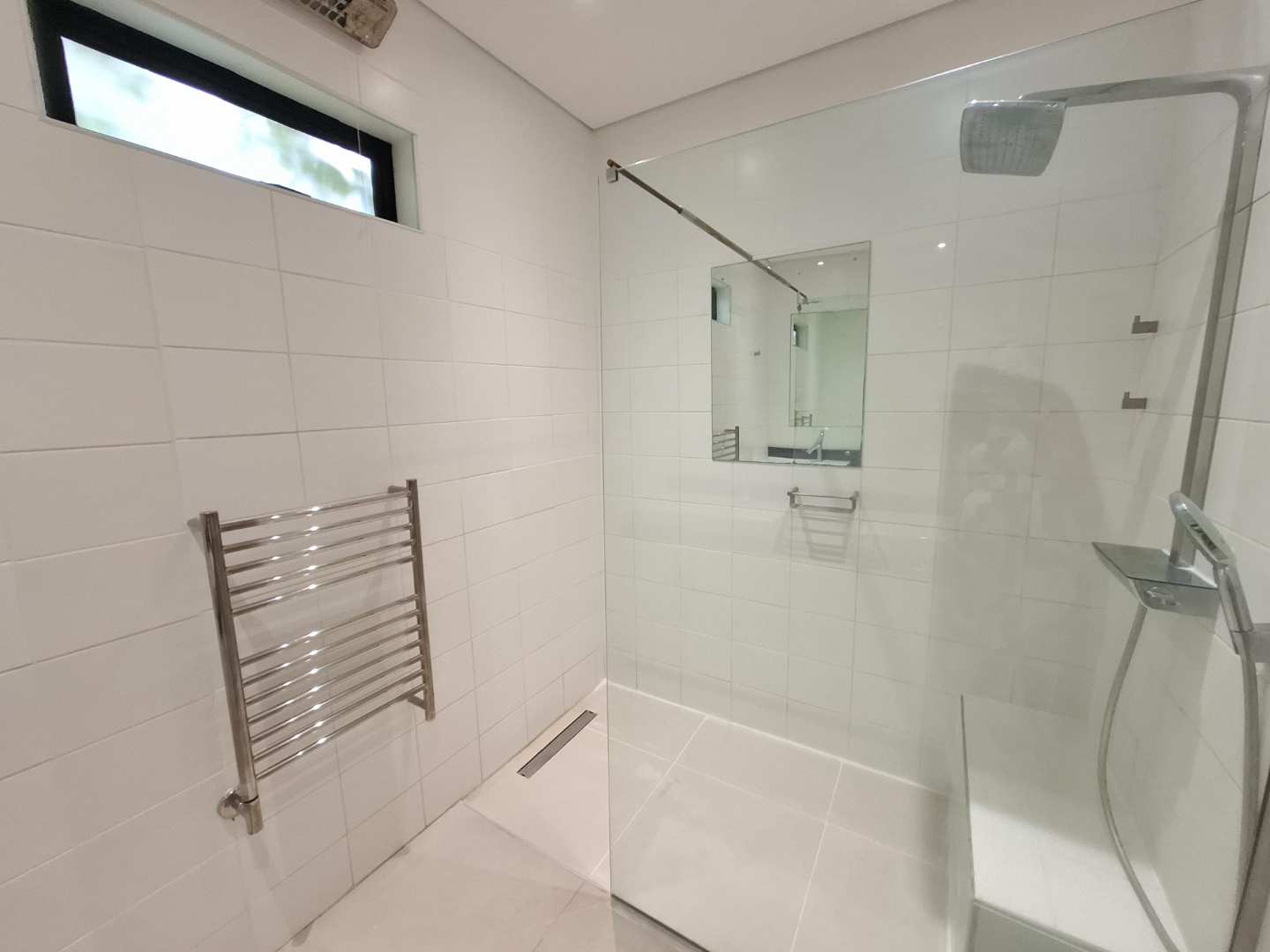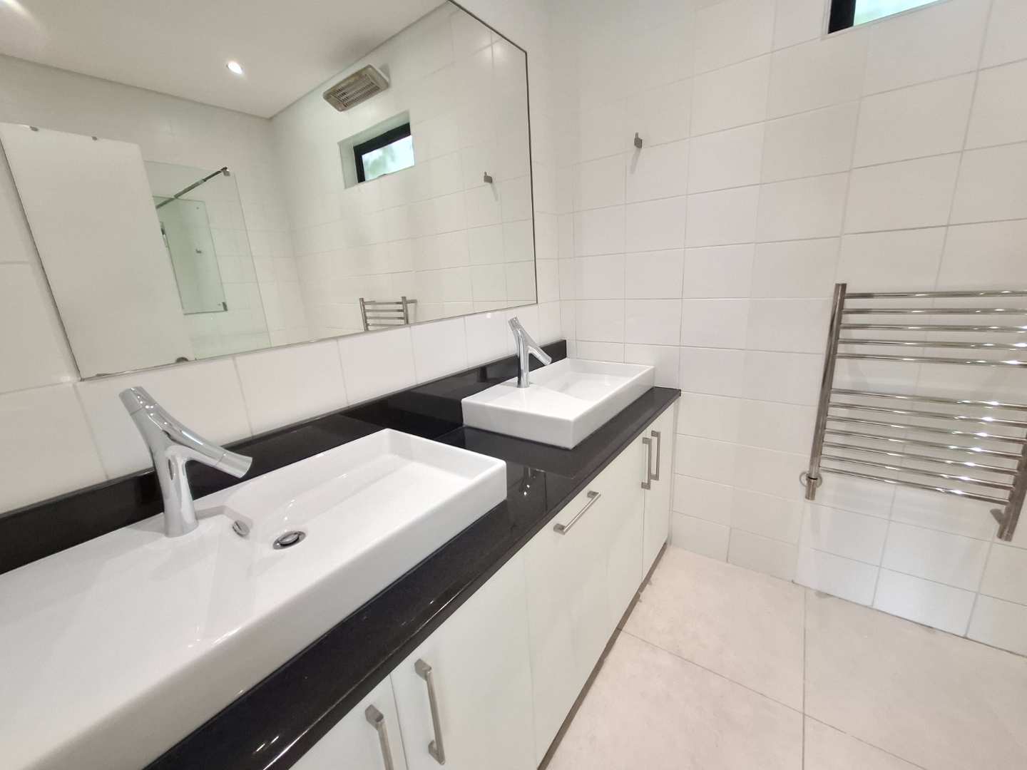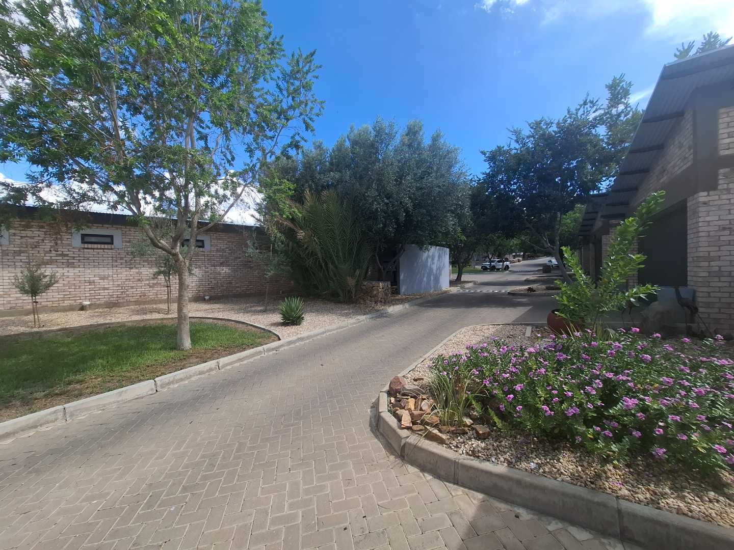 The townhouse features three spacious bedrooms, all with built-in cupboards and each opening up to the tranquil garden. The master bedroom boasts air-conditioning for year-round comfort and an en-suite bathroom with a luxurious double basin. There are two bathrooms in total, with the second bathroom conveniently serving the other two bedrooms.