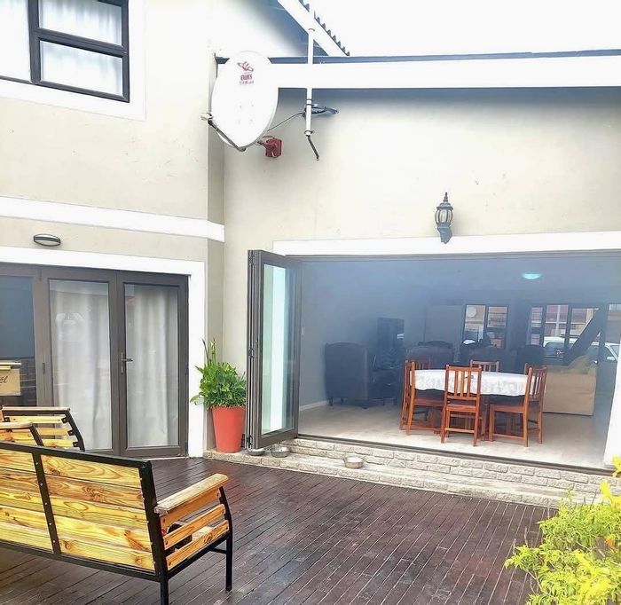 Entertain in a private courtyard with fire pit and open-plan lounge/dining with built-in braai in a quiet neighbourhood; well-fitted kitchen, alarm, paving — 3 beds, 2 baths, double garage.