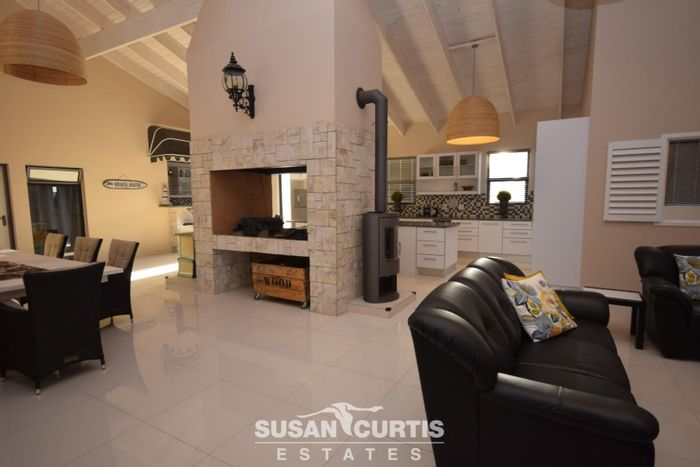 Fringed by Namib dunes with distant sea glimpses, this tranquil home offers open-plan living with fireplace, built-in BBQ and bar, sunroom, three ensuite bedrooms and four garages.