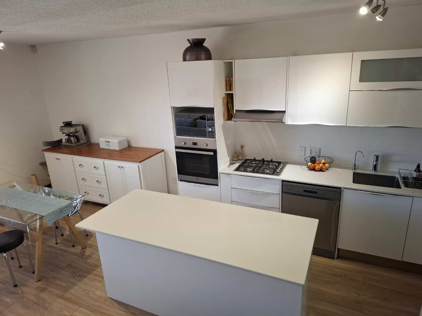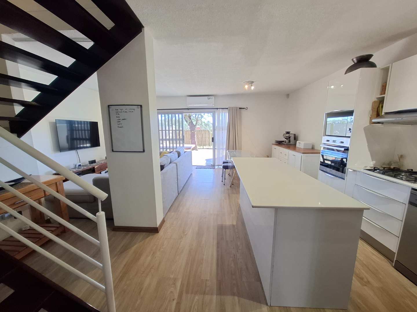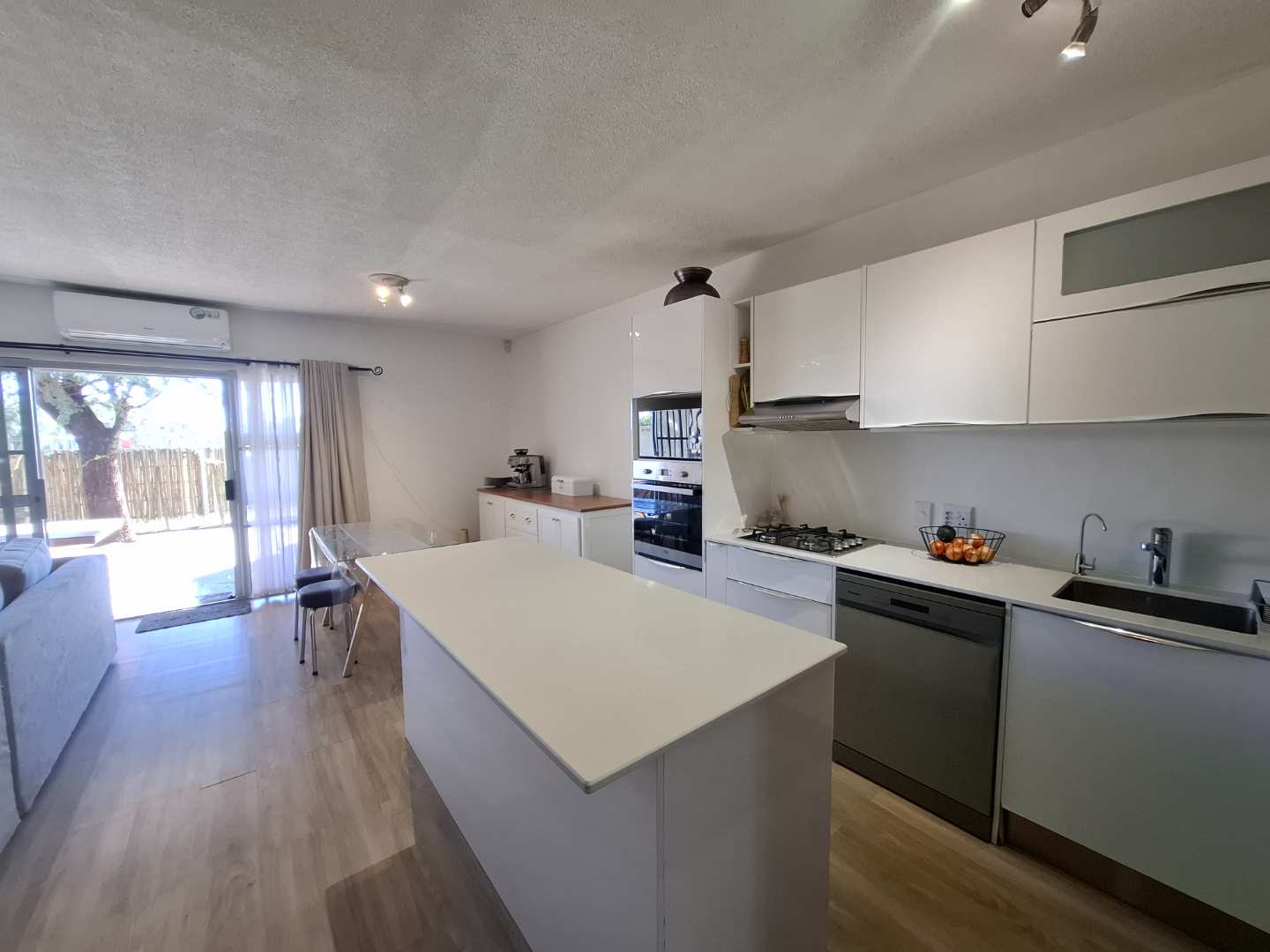The open-plan living area is air-conditioned and flows seamlessly onto a generous, pet-friendly garden through sliding doors. A fully grown thorn tree adds natural charm and shade, creating a peaceful outdoor retreat. The kitchen is a chef’s dream, featuring sleek Caesarstone countertops and a modern gas stove. Additional highlights include a separate laundry room and a guest toilet downstairs.