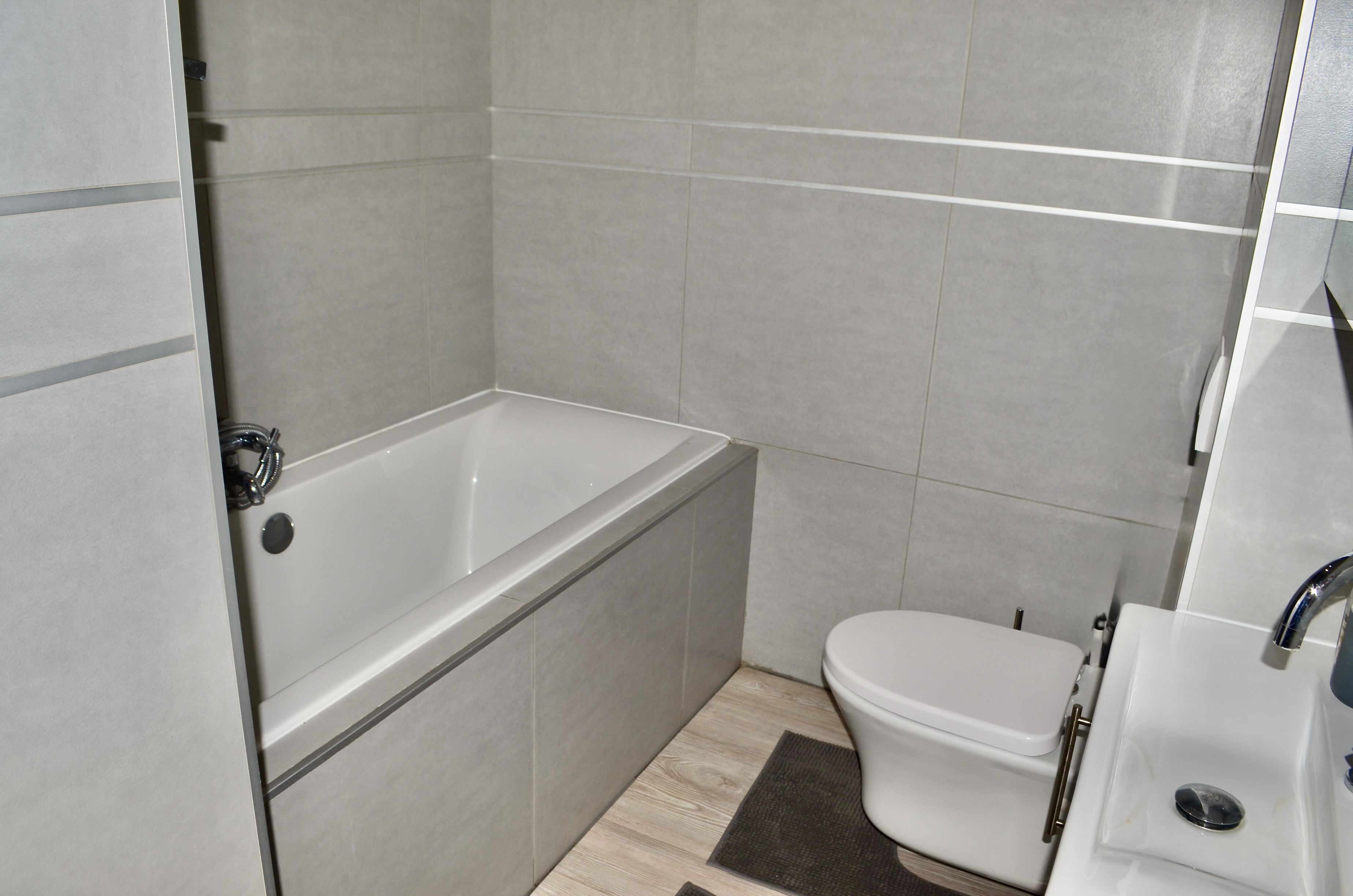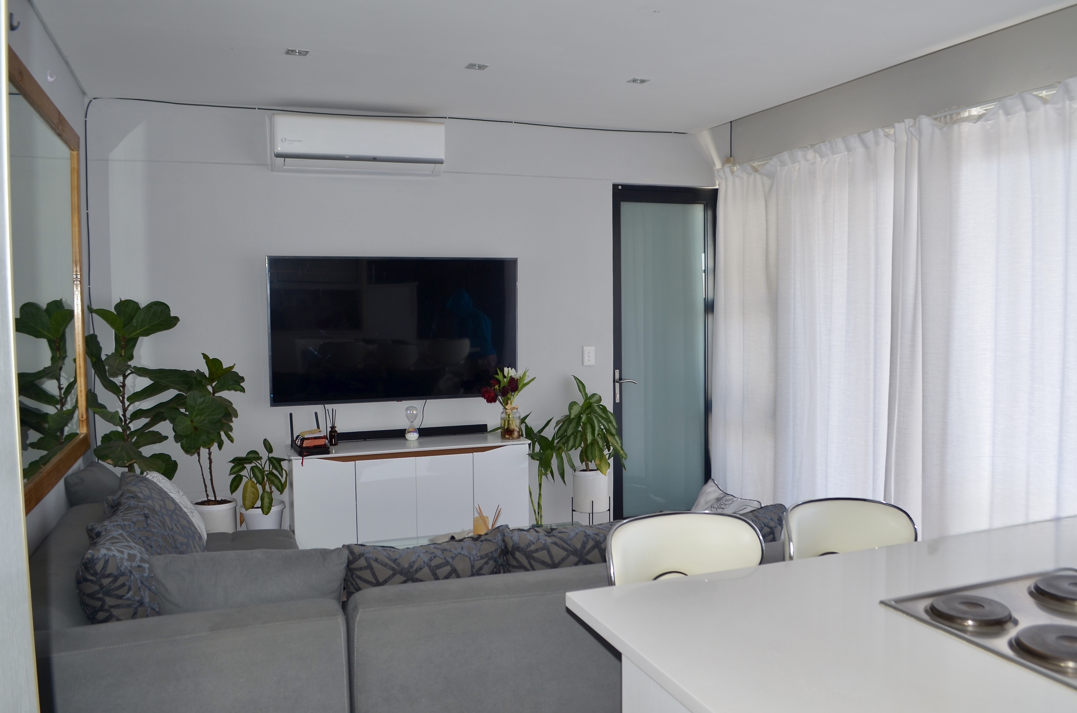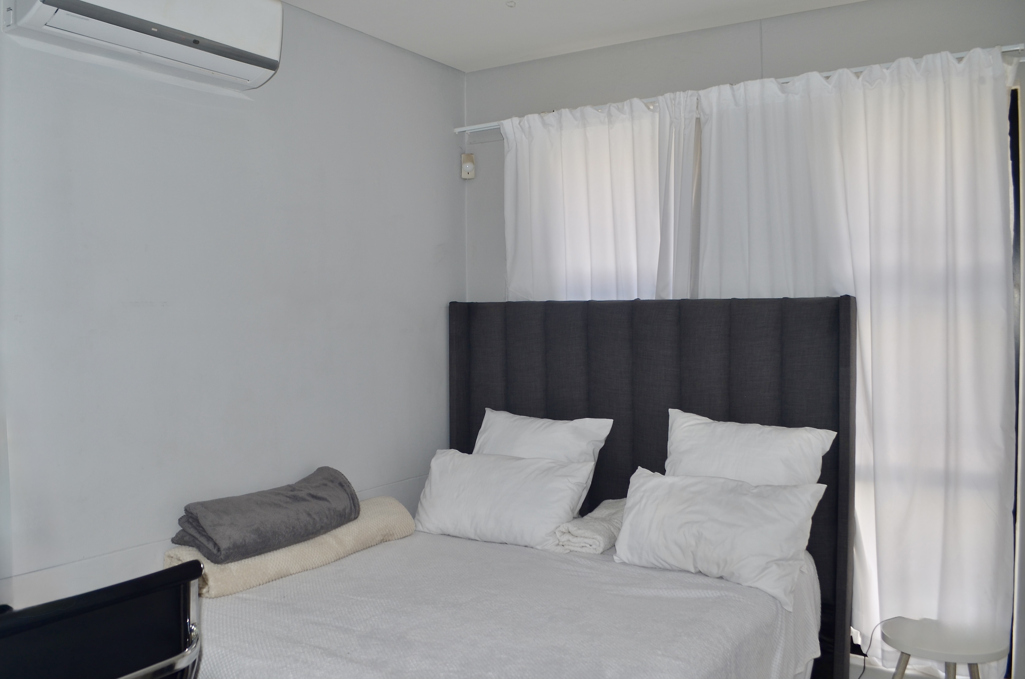 This home boasts two spacious bedrooms with high-quality built-in cupboards. The main bedroom features an en-suite bathroom with a shower, toilet, and wash basin, as well as its own air-conditioner for year-round comfort. The second bathroom is equipped with a bath, toilet, and wash basin, catering to both family and guests.