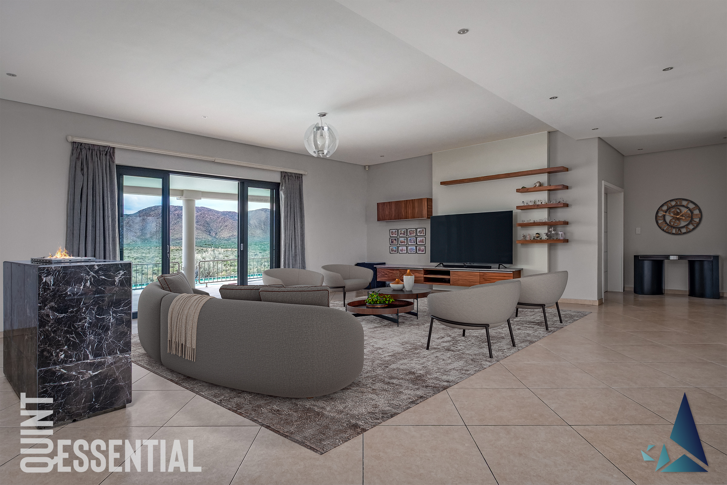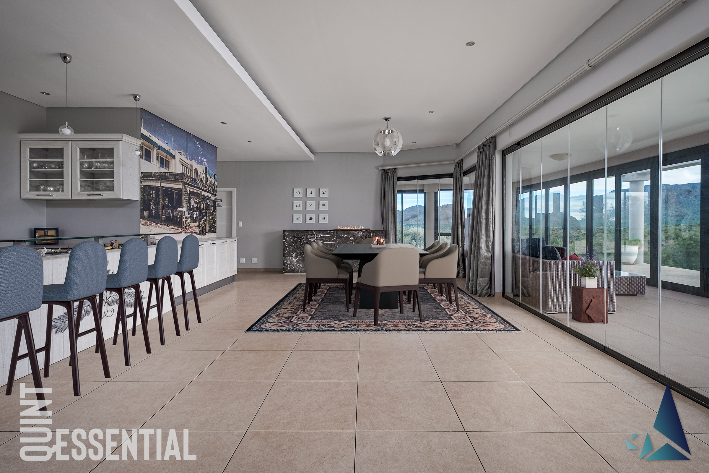 Open plan Lounge and Dining with fitted bar and multiple gas fireplaces