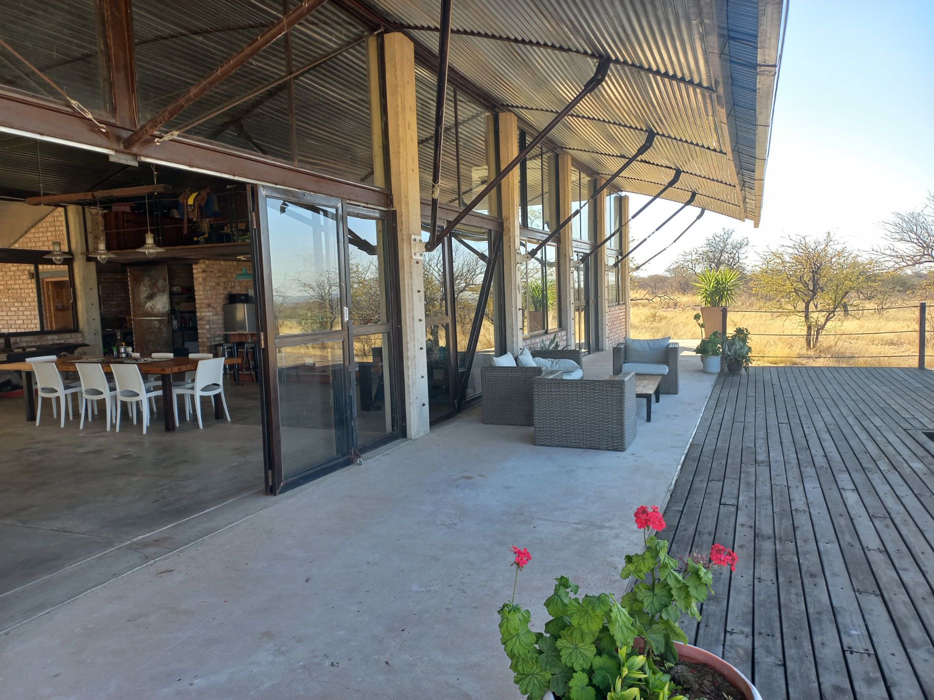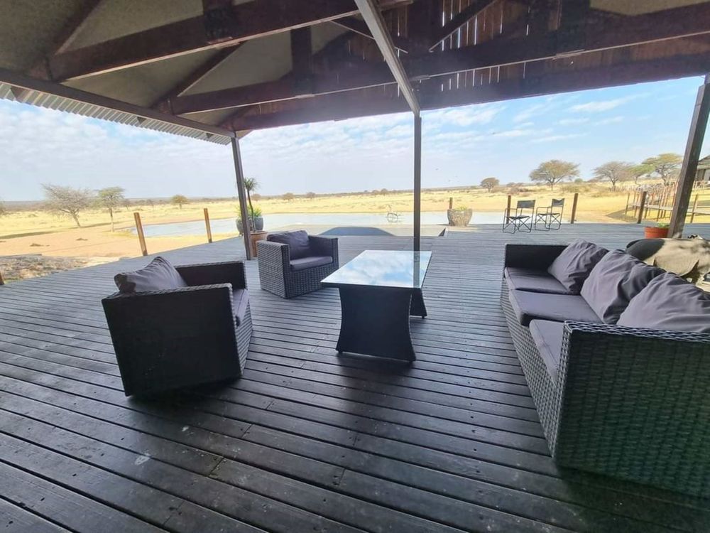 Large outside deck with fireplace and a gorgeous view over a water-hole.