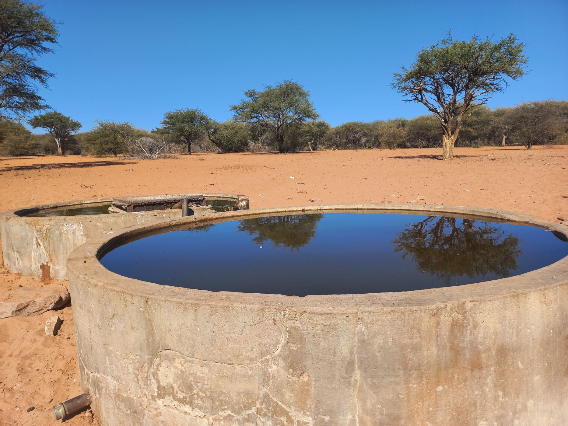 Typical African Savana vegetation ranging from sand dunes, dry river-beds, with large acacia trees and some rocky outcrops.