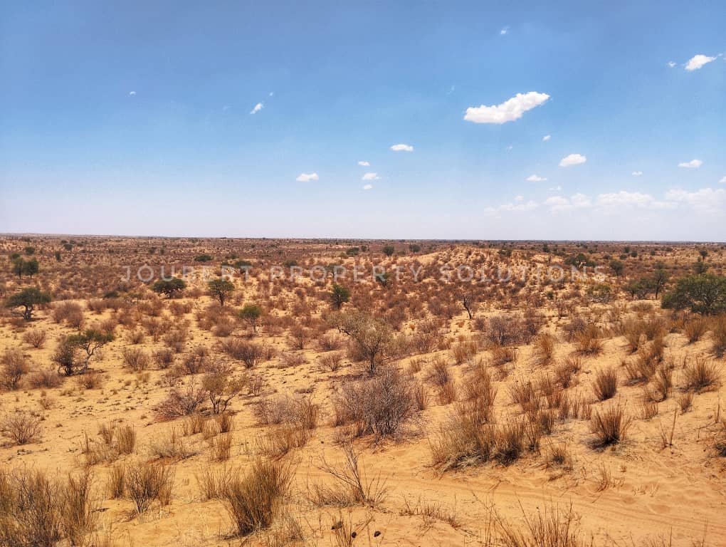 Landscapes include level grass/bush plains, elevated areas, Kalahari sand dunes, dry riverbeds, etc.