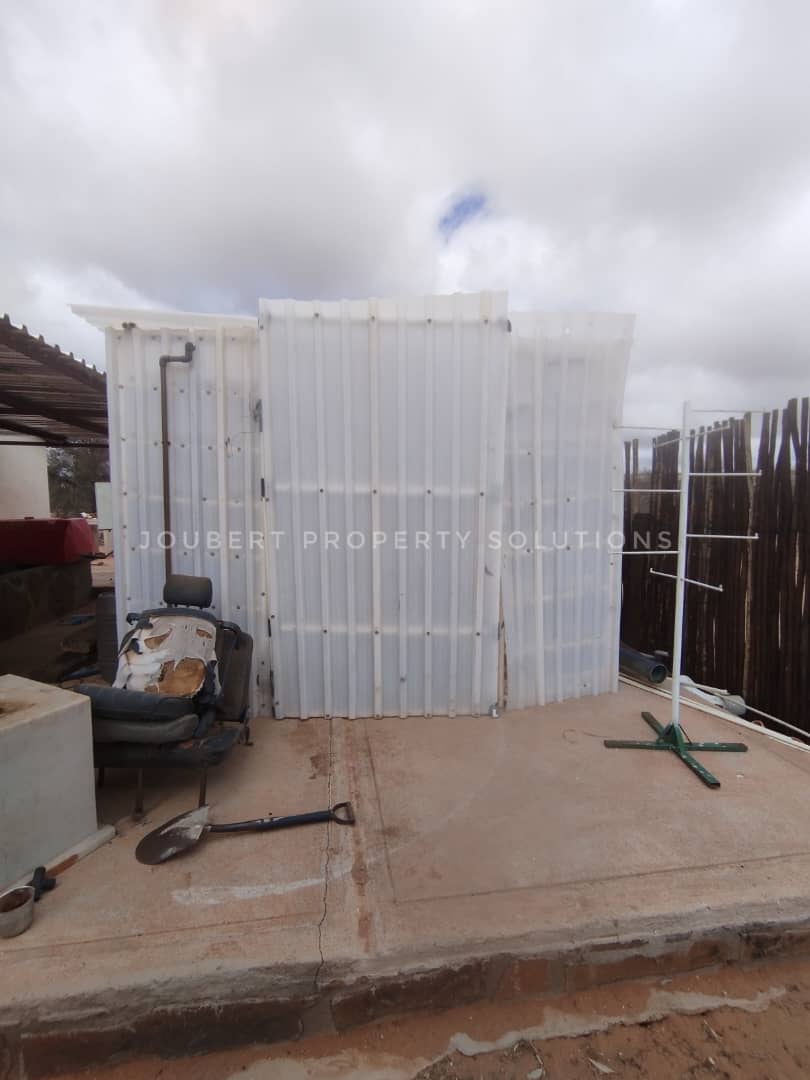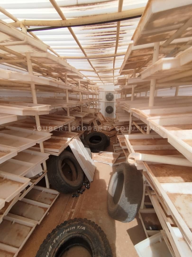 study, kitchen, pantry, 4 bedrooms, 2 bathrooms, gun safe, closed covered back stoep, large covered back stoep (102m2) , fenced yard, 4 Kva solar setup, backup generator, vegetable tunnel, Hydrophonic room (needs some attention), Poultry pens, various fruit trees and many more