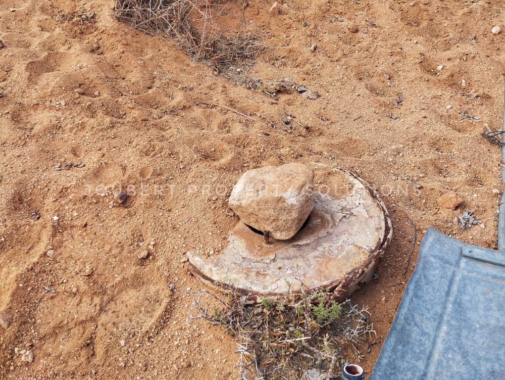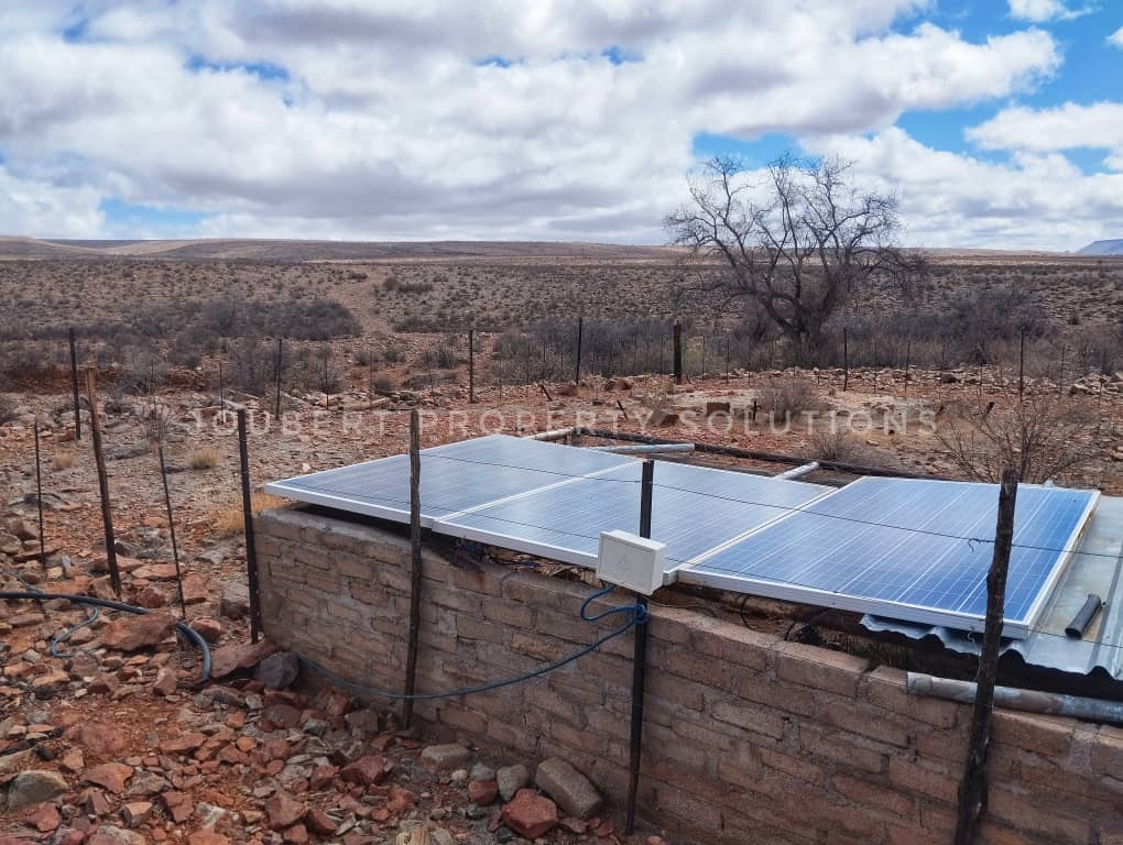 3 Installed boreholes (2 solar submersible pumps, 1 windmill), supplying water at a depth of ±24 - 75m, to 12 reservoirs (11 PVC tanks, 1 cement dam), ensuring a constant water supply to all inner camps.