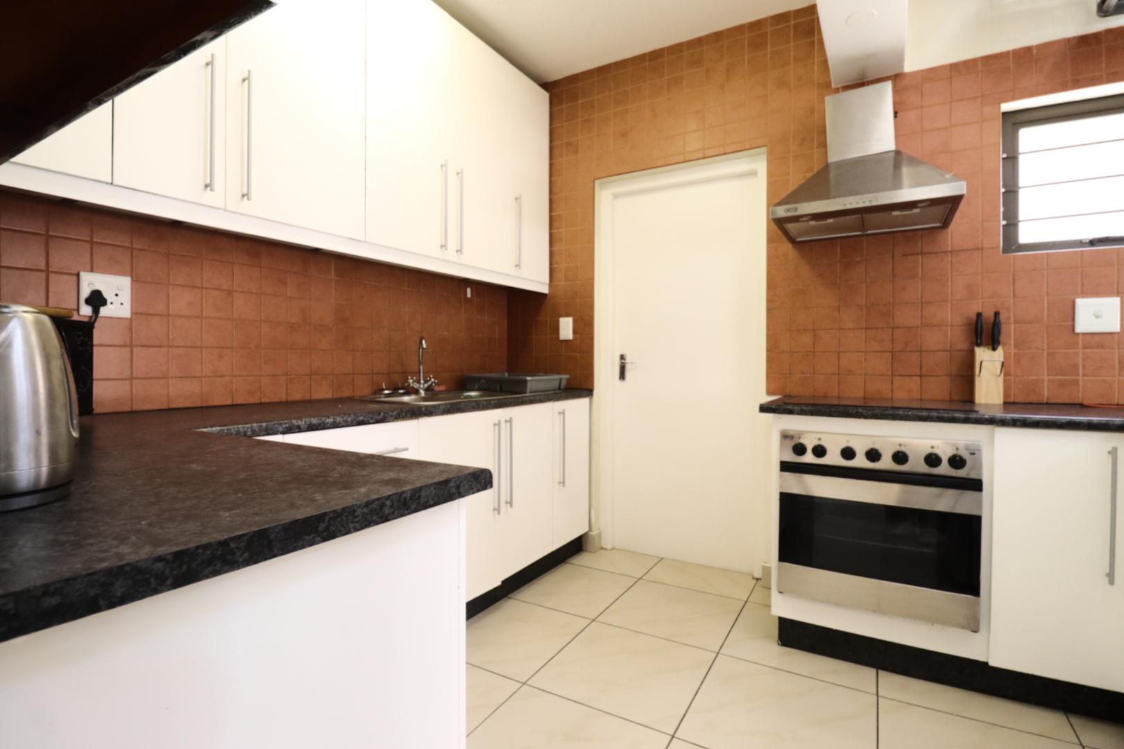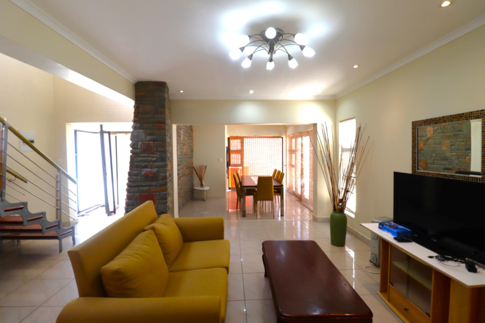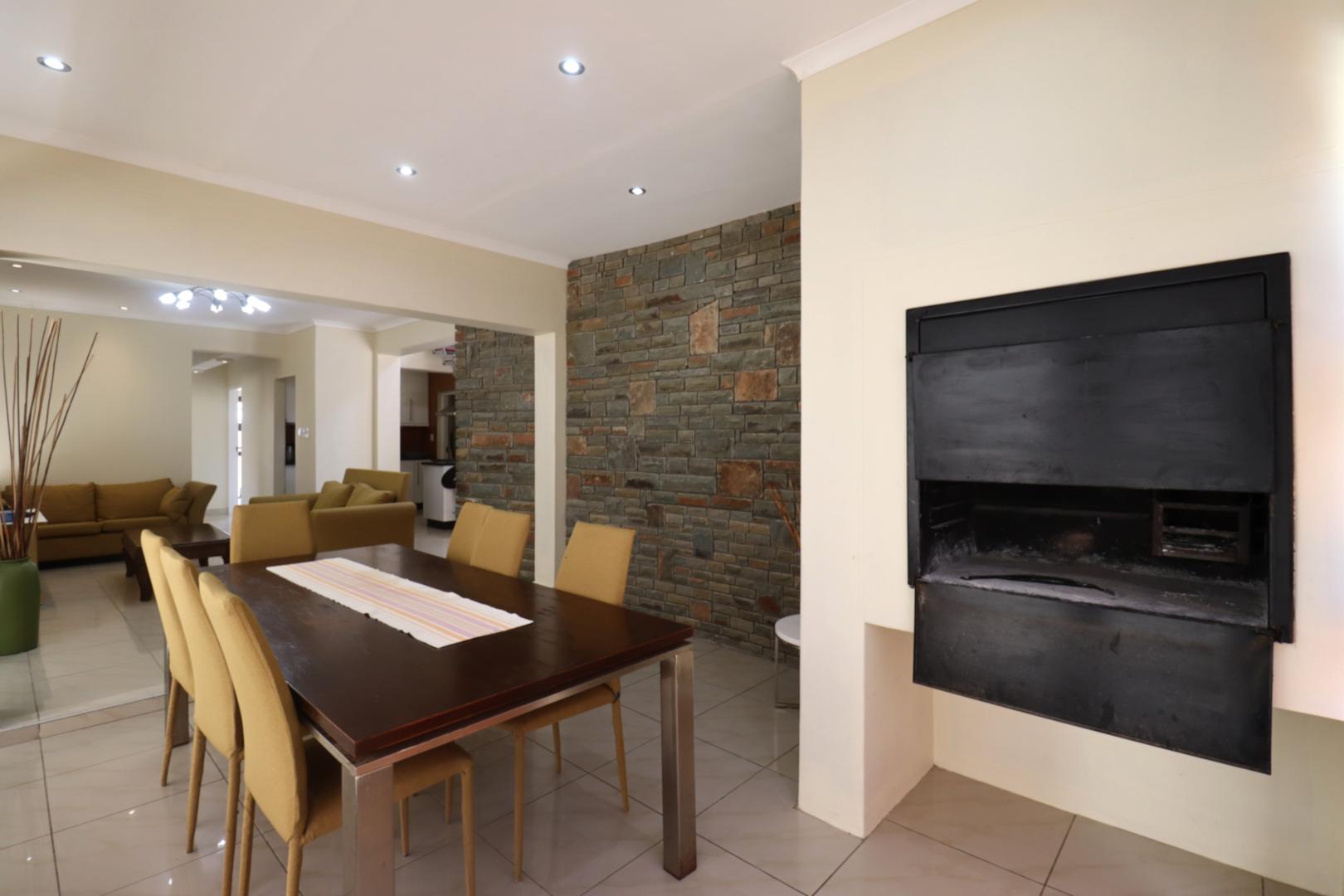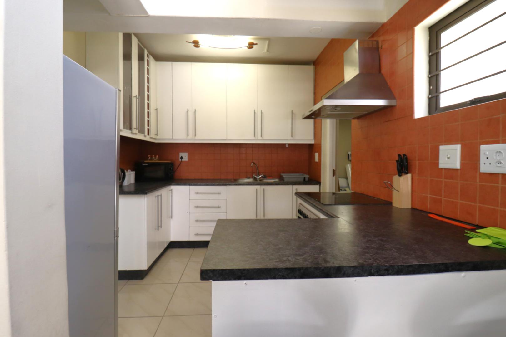The main two-story house welcomes you into a bright lounge combined with the dining area, featuring a built-in BBQ and an open kitchen with a built-in stove, oven, and cupboards. The scullery and wash-up area connects directly to the double garage, and there is a small scullery courtyard for added convenience.