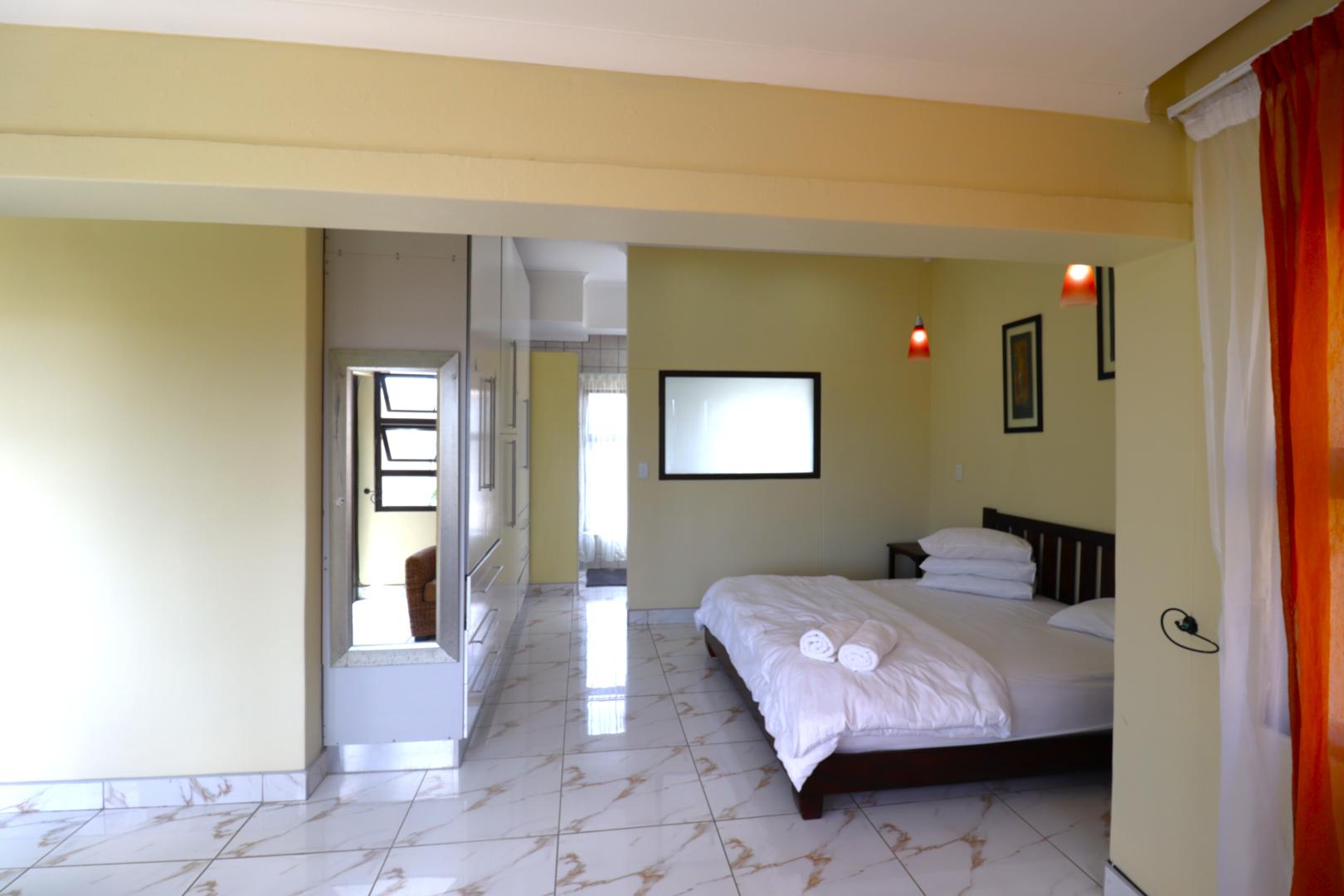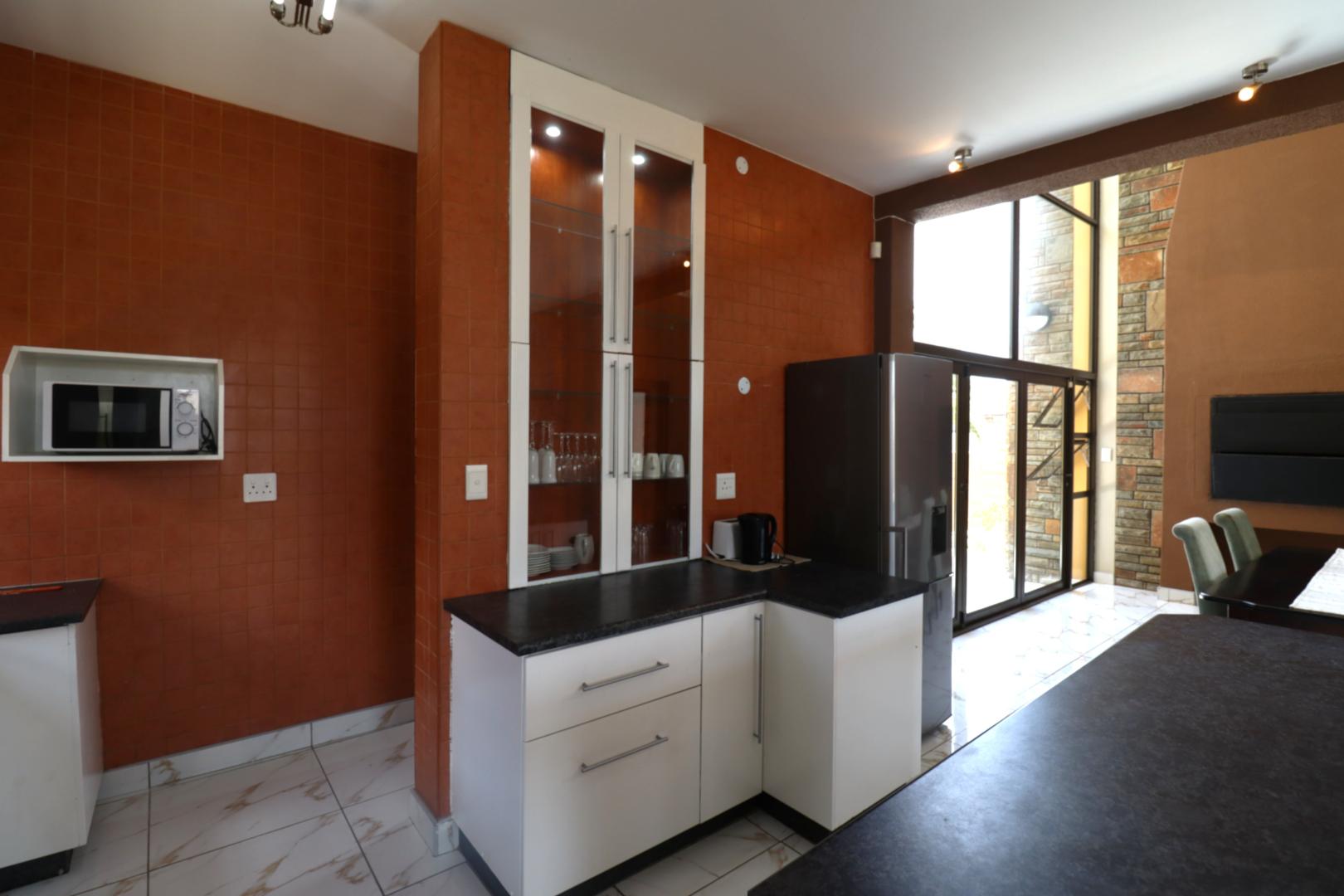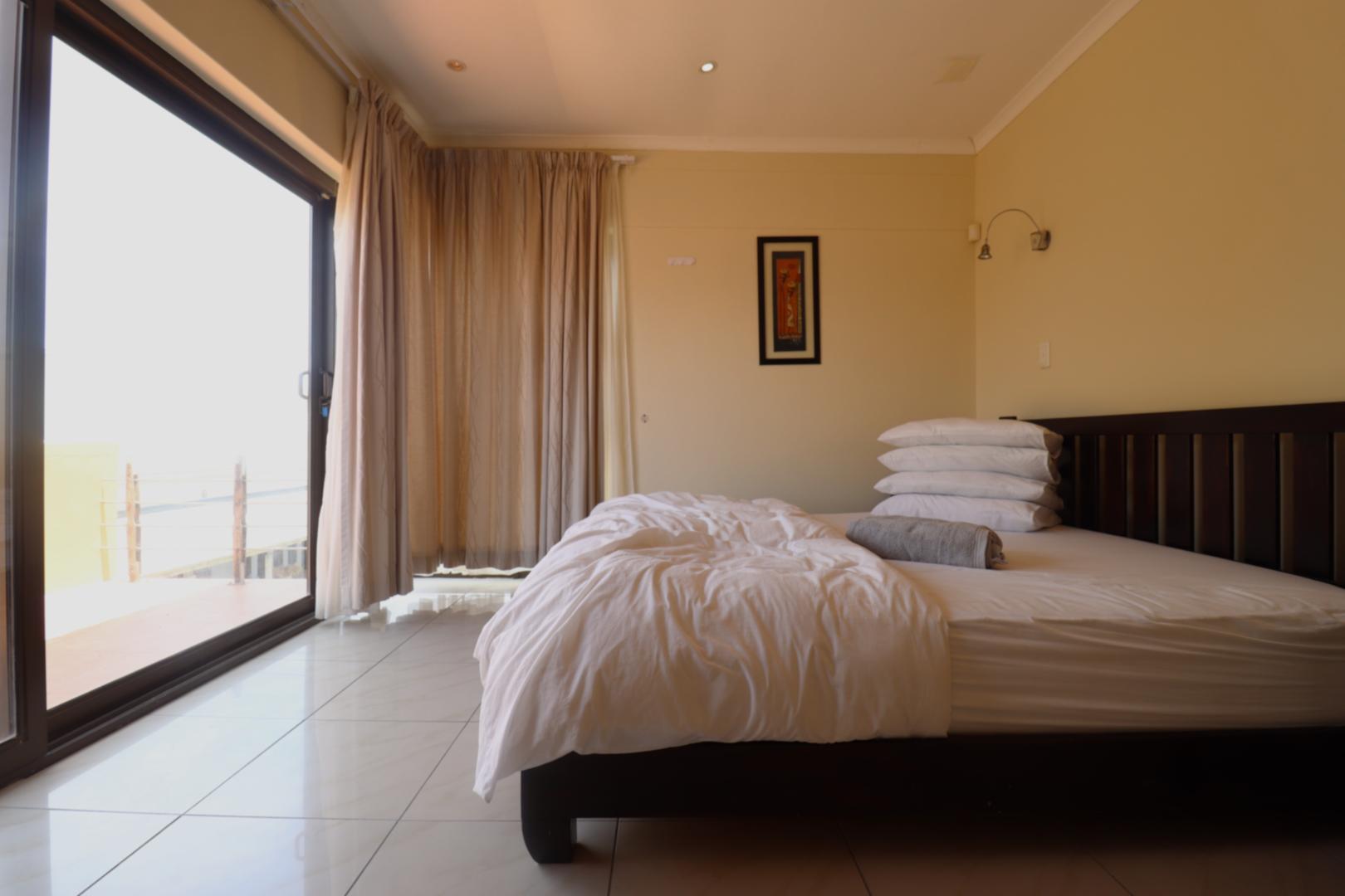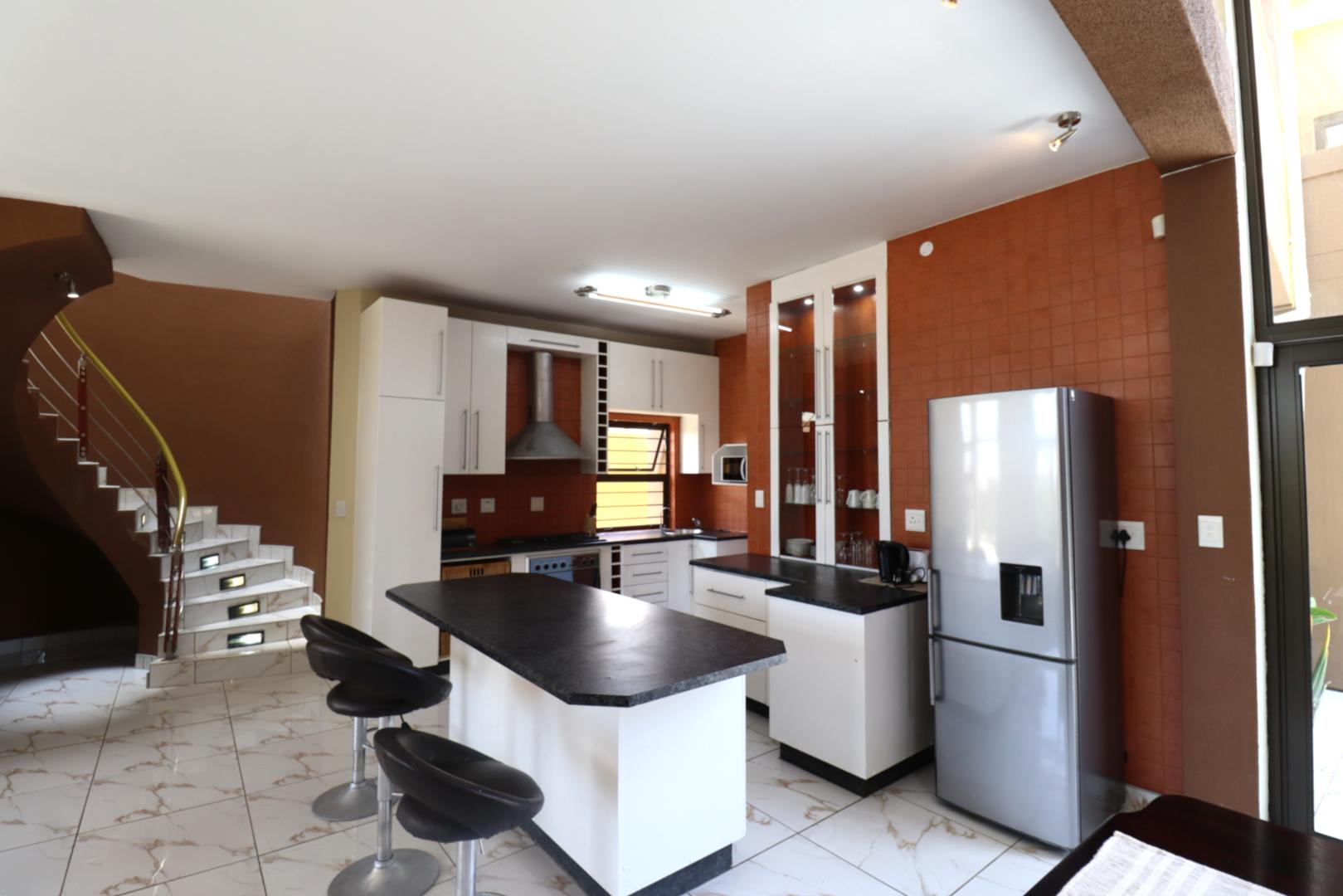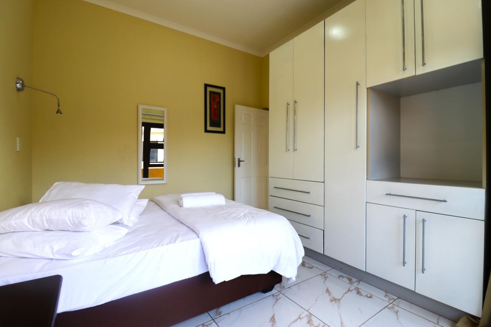 The main two-story house welcomes you into a bright lounge combined with the dining area, featuring a built-in BBQ and an open kitchen with a built-in stove, oven, and cupboards. The scullery and wash-up area connects directly to the double garage, and there is a small scullery courtyard for added convenience.