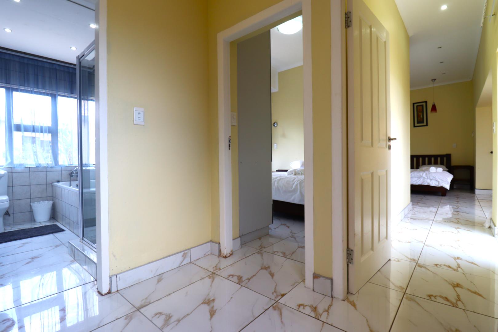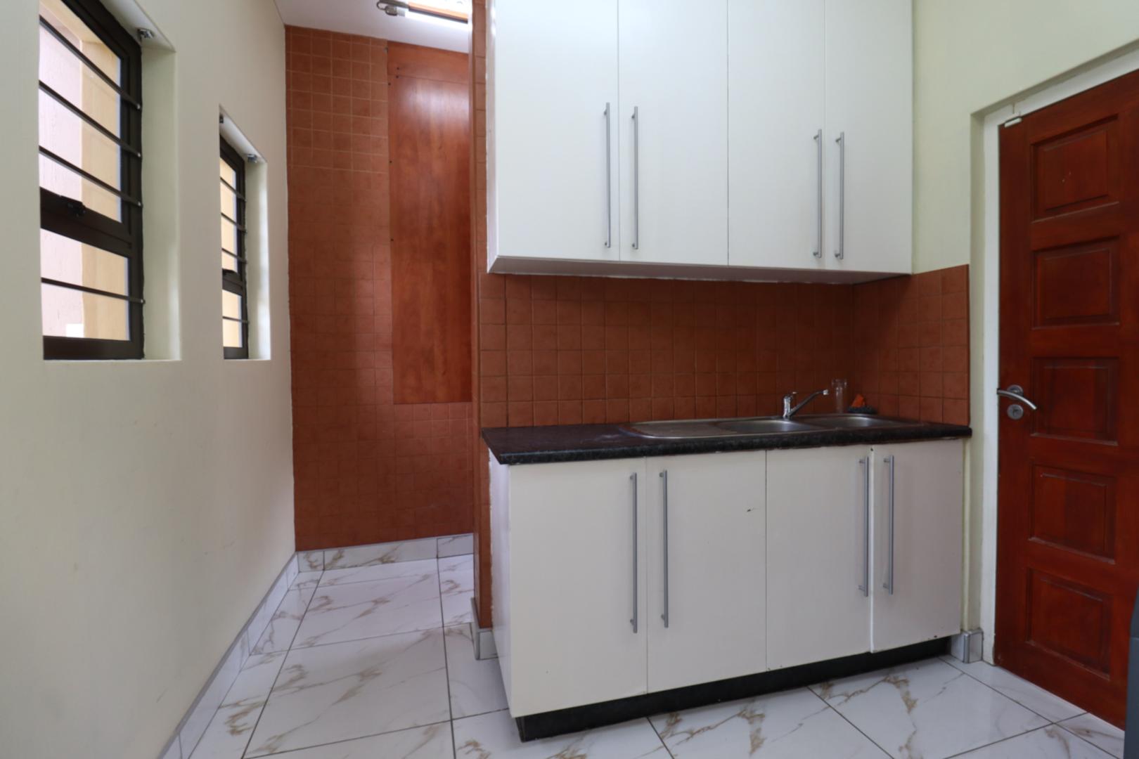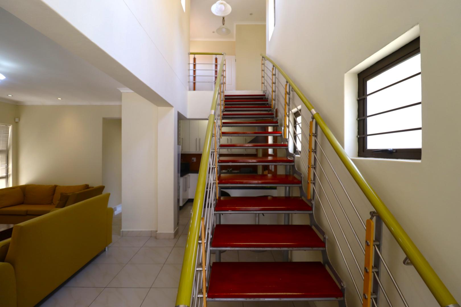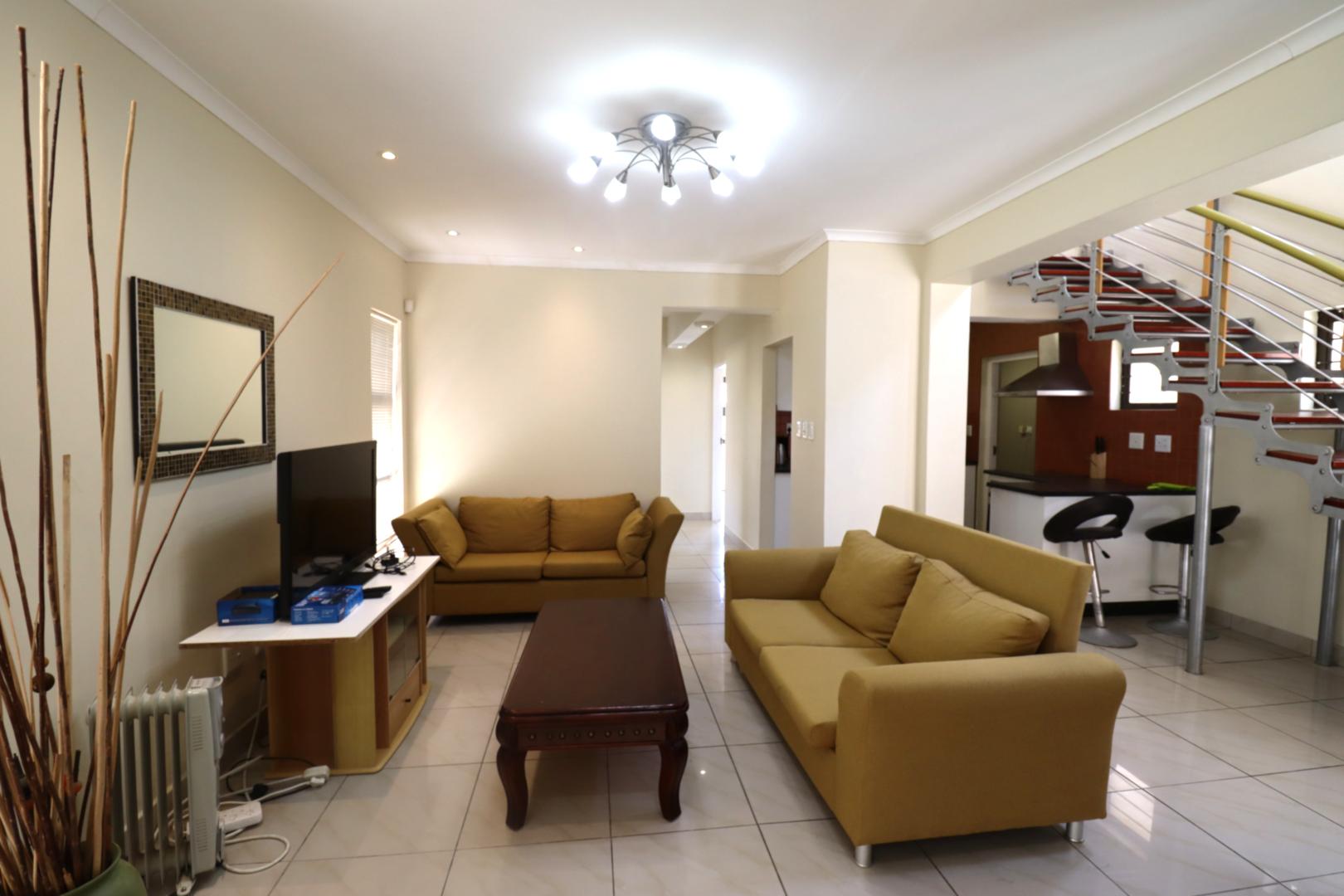 The main two-story house welcomes you into a bright lounge combined with the dining area, featuring a built-in BBQ and an open kitchen with a built-in stove, oven, and cupboards. The scullery and wash-up area connects directly to the double garage, and there is a small scullery courtyard for added convenience.