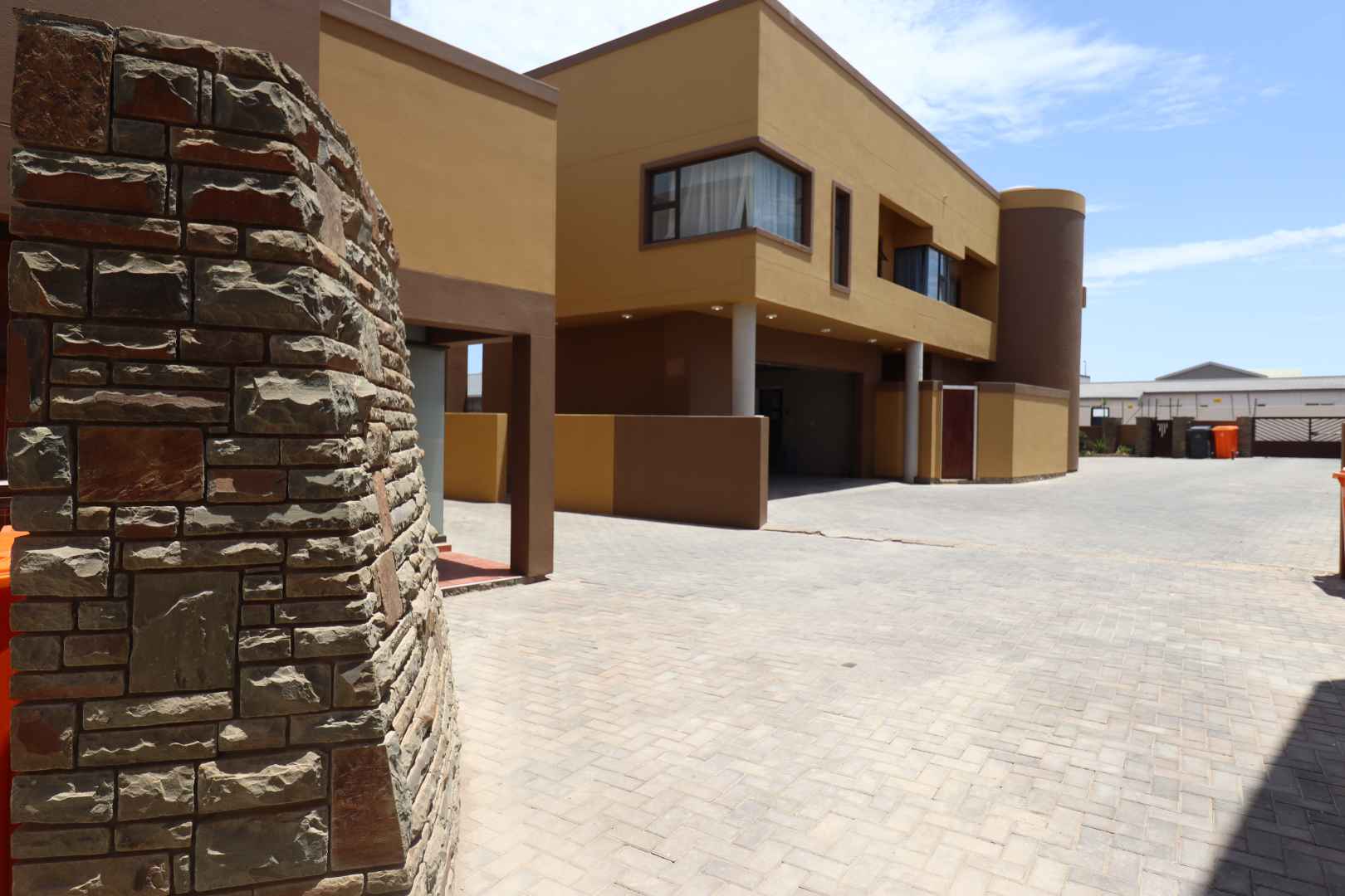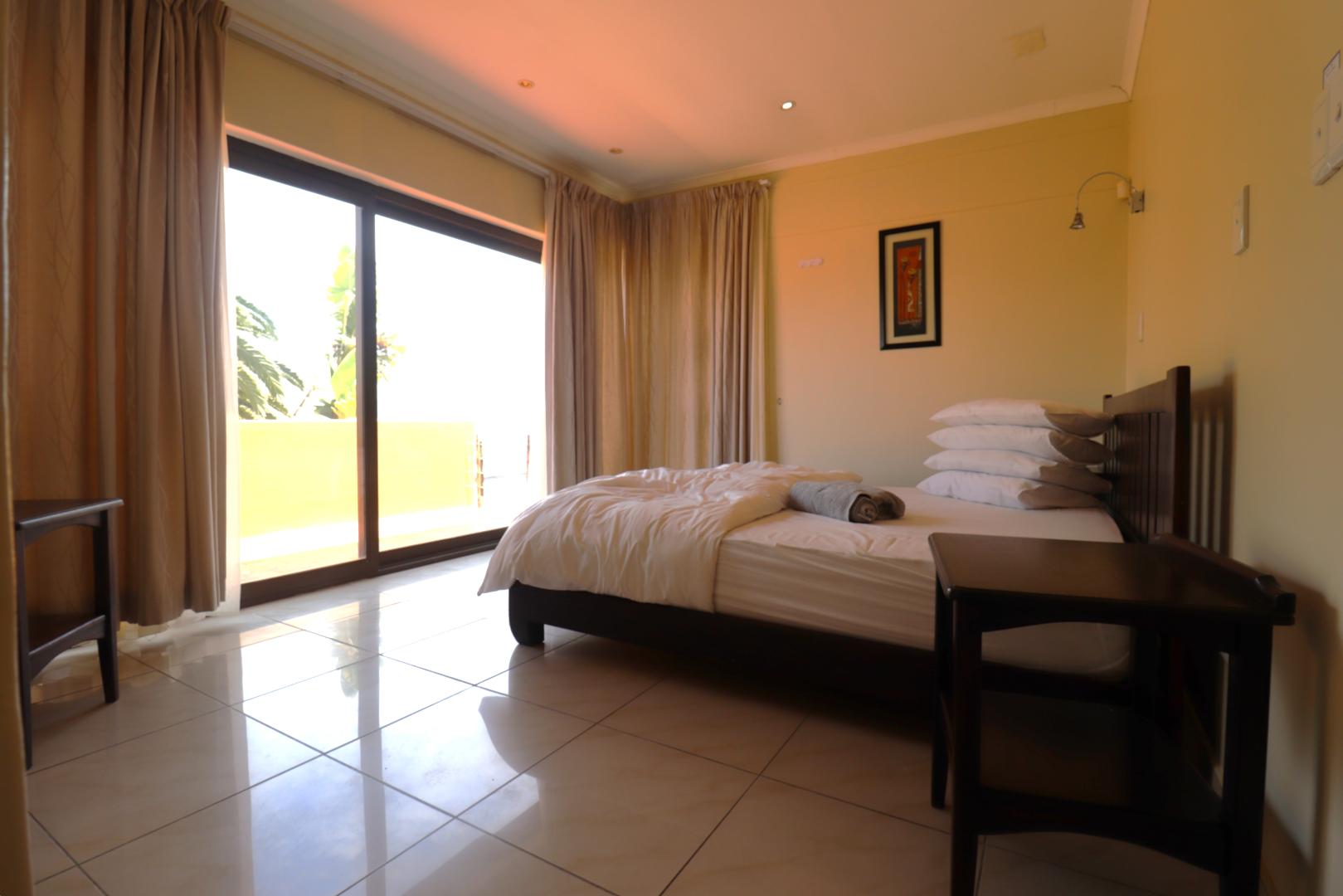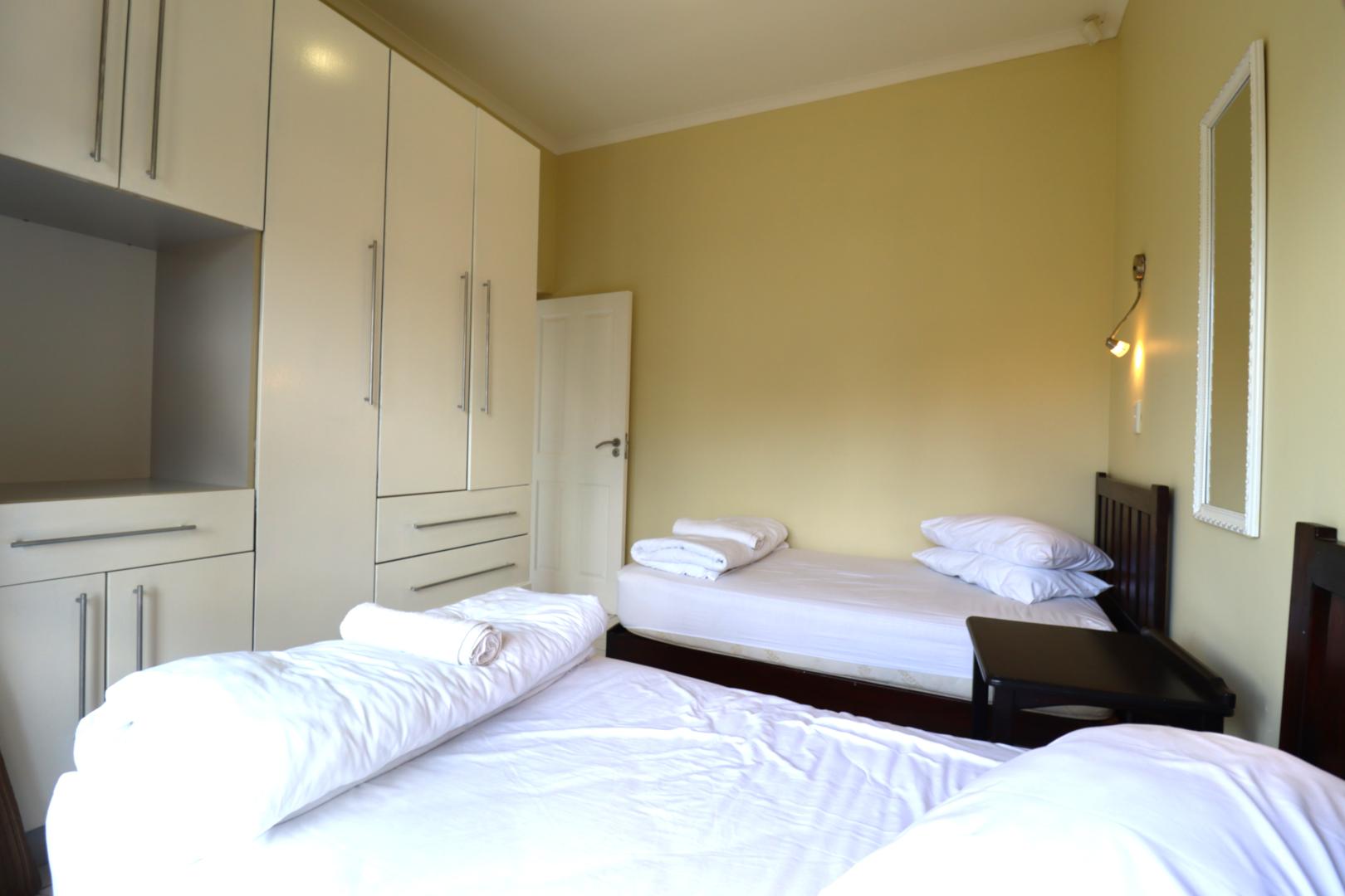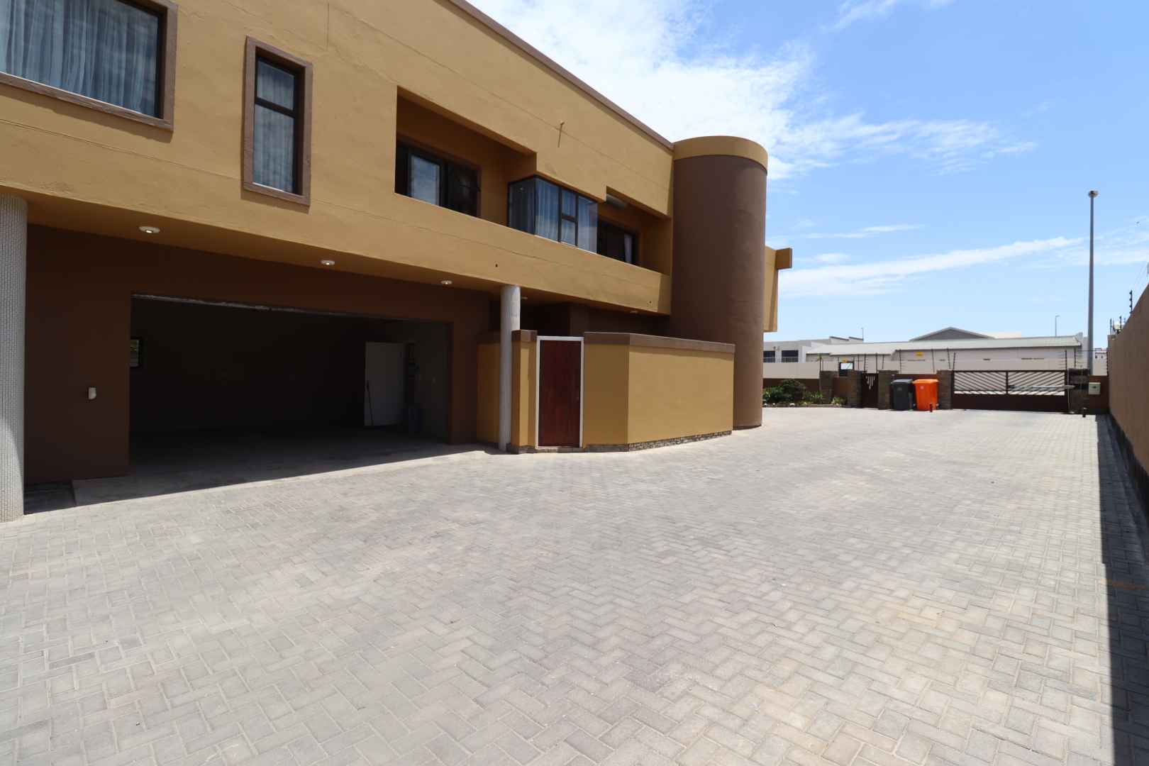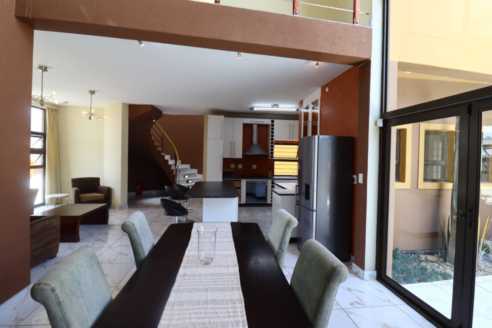 The main two-story house welcomes you into a bright lounge combined with the dining area, featuring a built-in BBQ and an open kitchen with a built-in stove, oven, and cupboards. The scullery and wash-up area connects directly to the double garage, and there is a small scullery courtyard for added convenience.