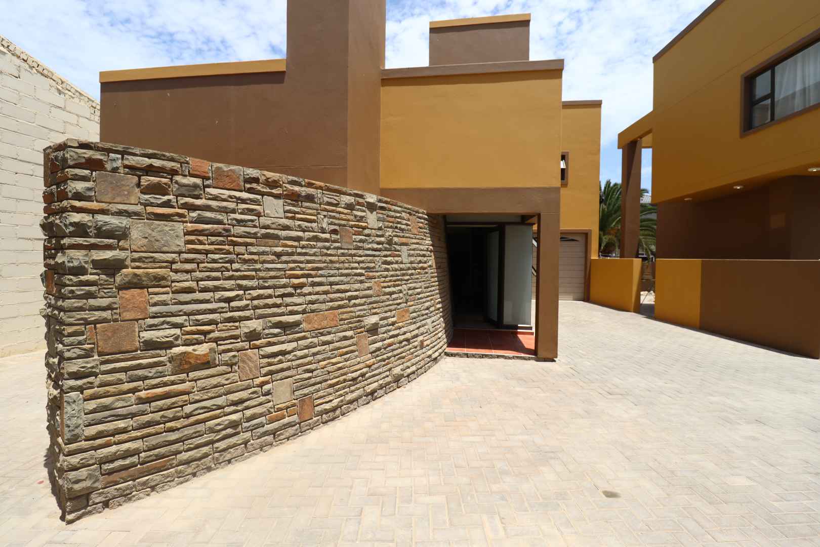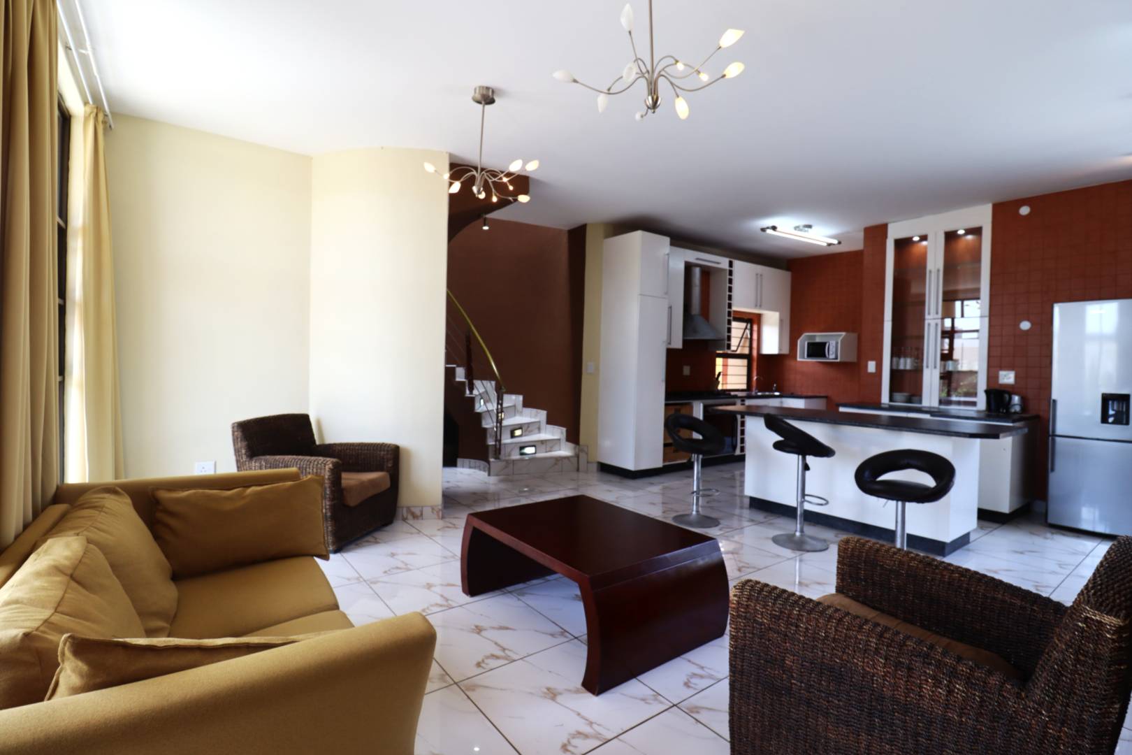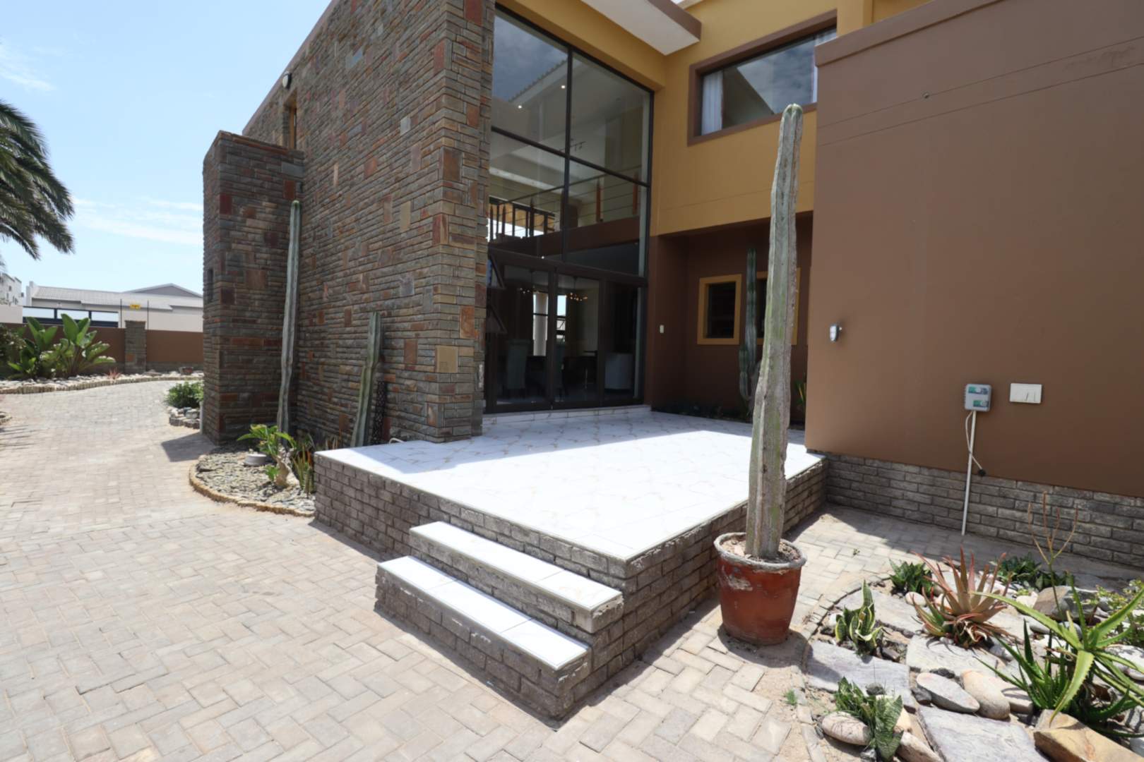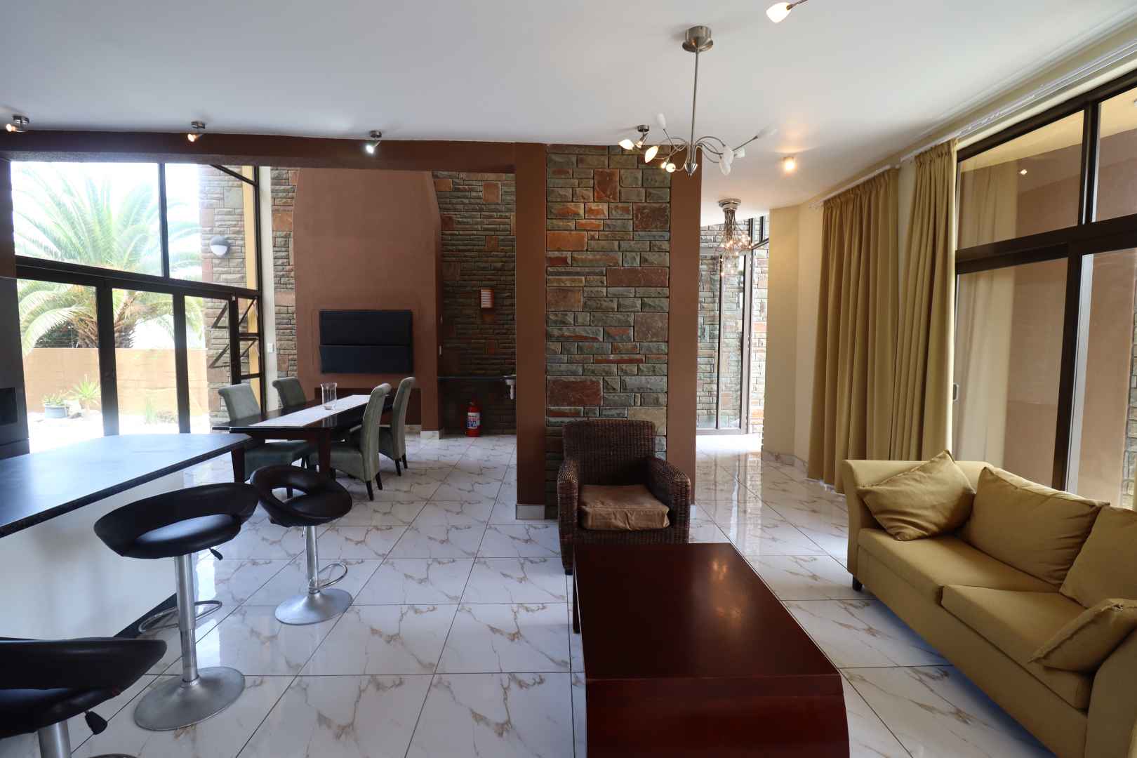 The main two-story house welcomes you into a bright lounge combined with the dining area, featuring a built-in BBQ and an open kitchen with a built-in stove, oven, and cupboards. The scullery and wash-up area connects directly to the double garage, and there is a small scullery courtyard for added convenience.