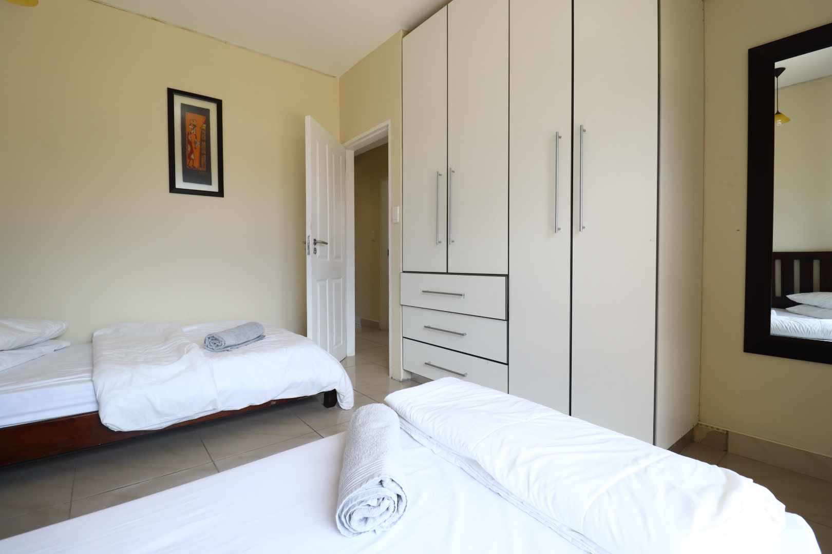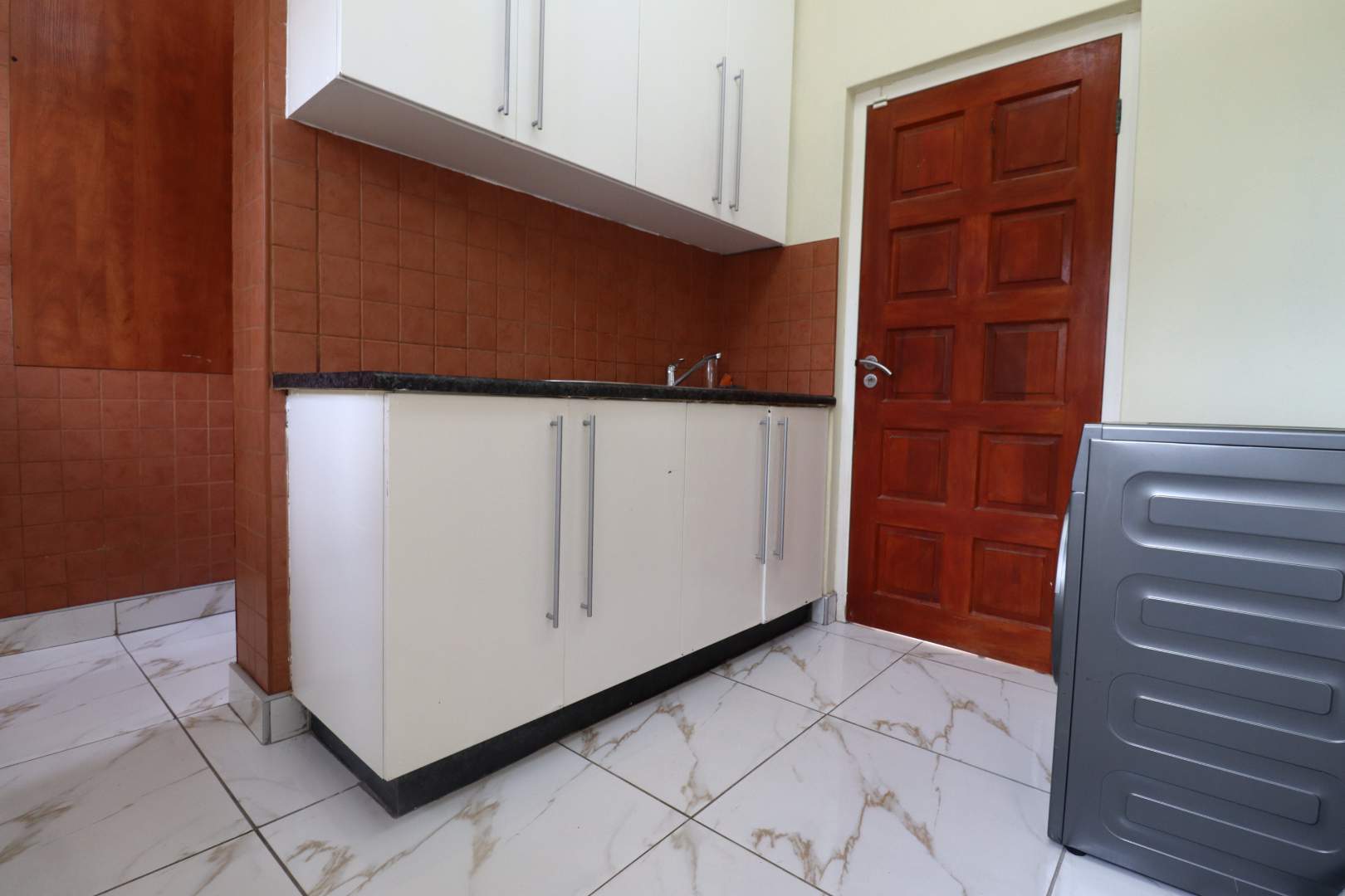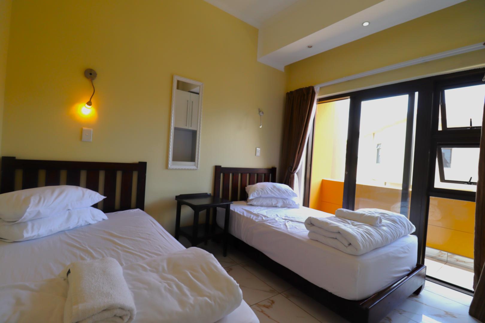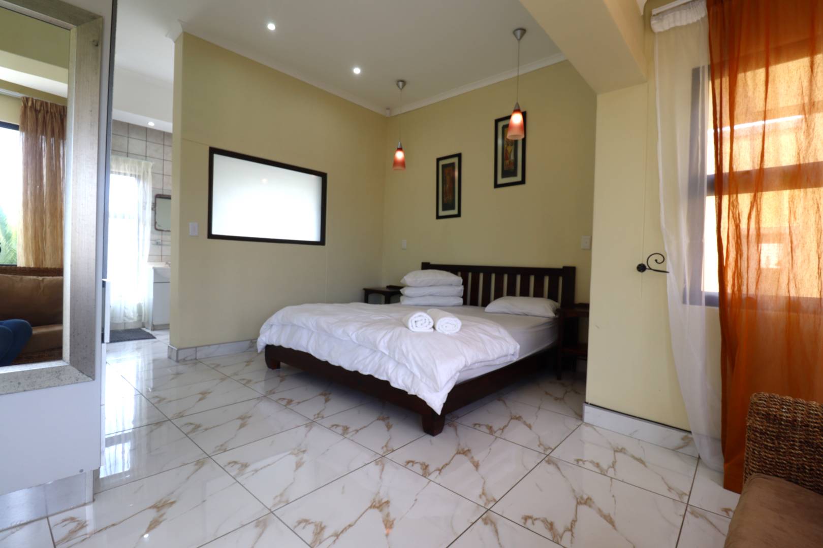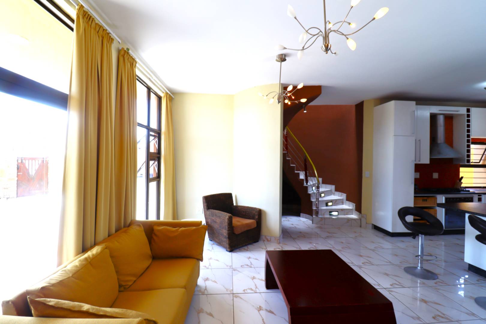 The main two-story house welcomes you into a bright lounge combined with the dining area, featuring a built-in BBQ and an open kitchen with a built-in stove, oven, and cupboards. The scullery and wash-up area connects directly to the double garage, and there is a small scullery courtyard for added convenience.
