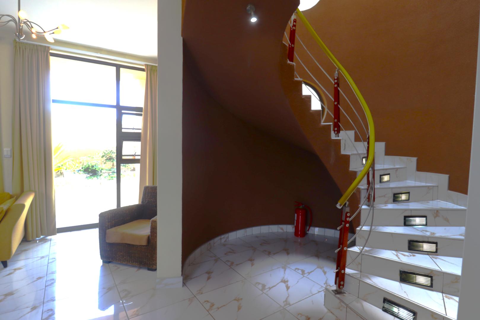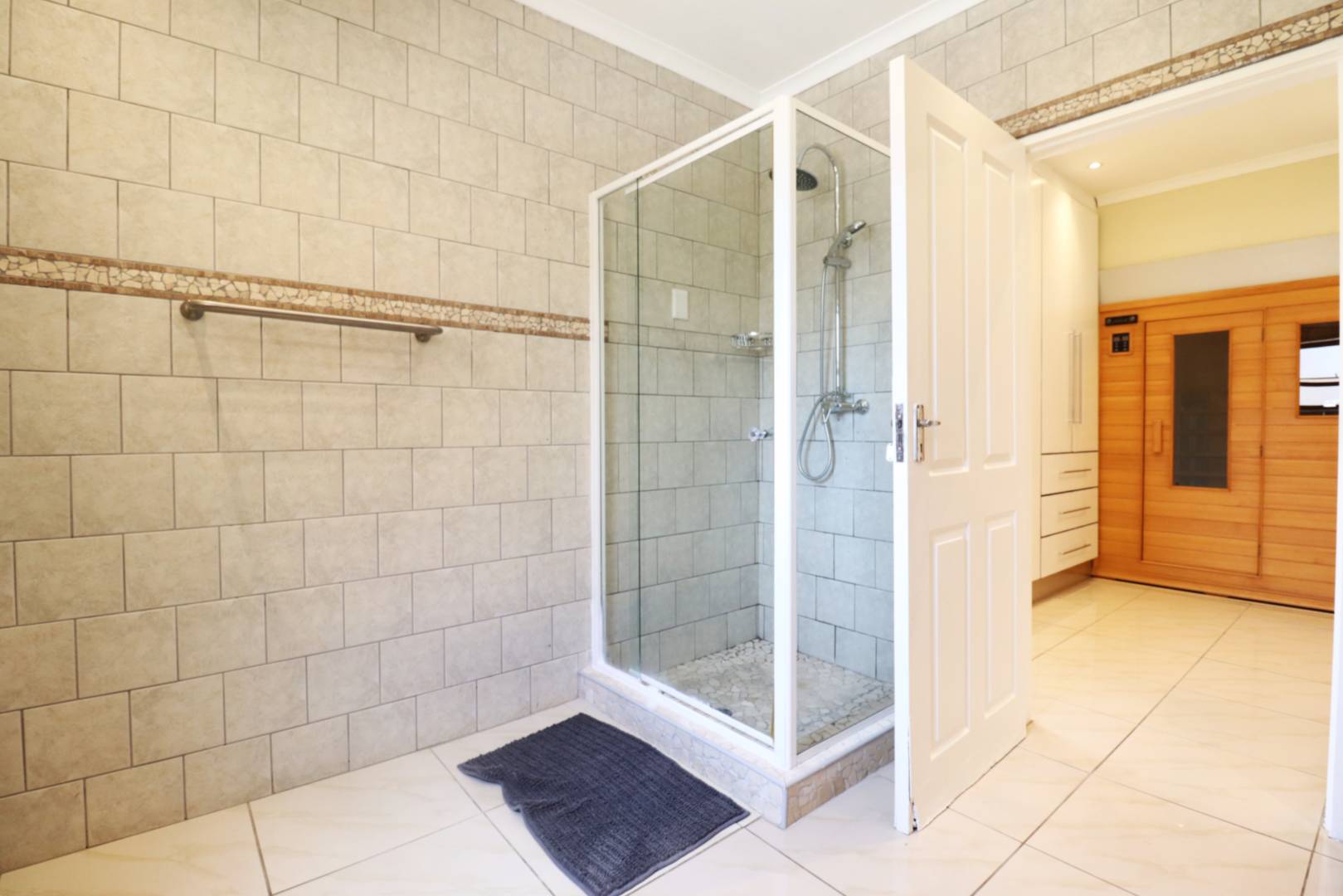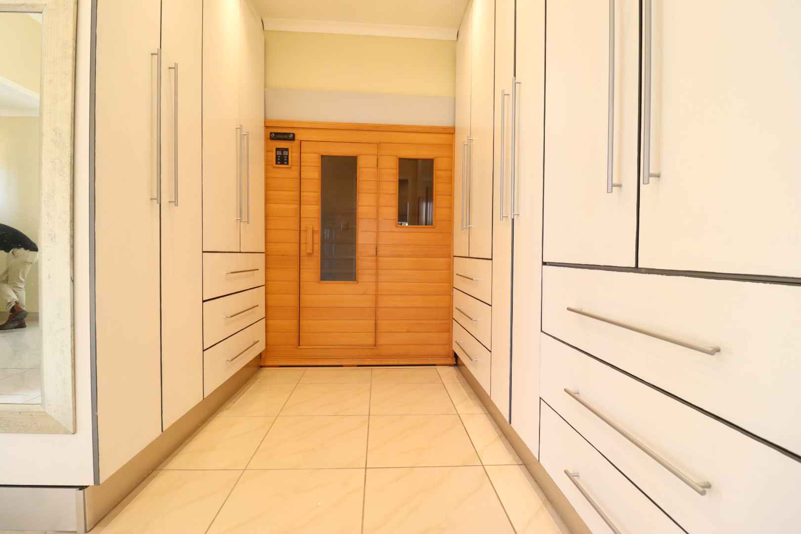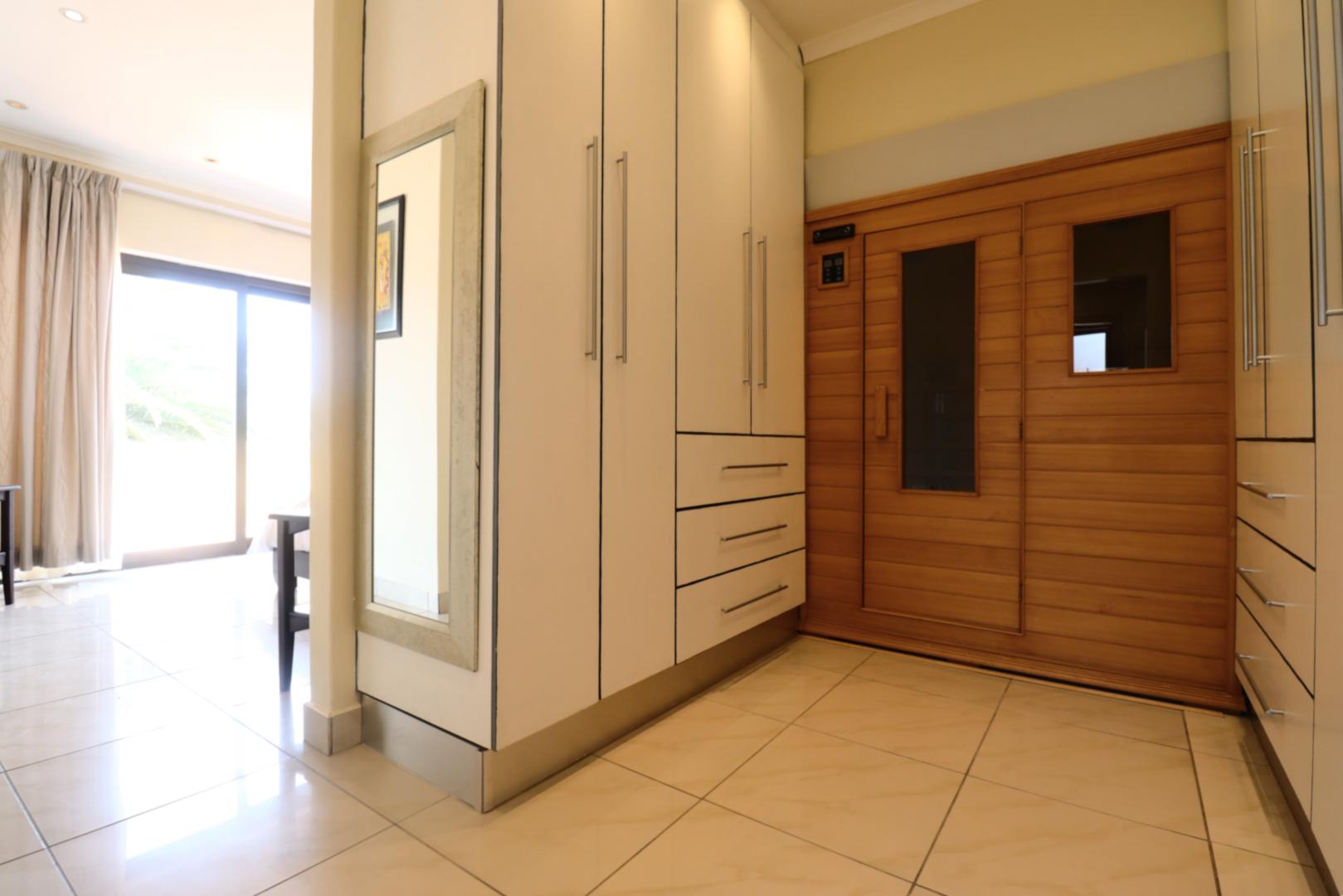 Upstairs, the flat offers a private retreat with one large bedroom opening onto a balcony, a full bathroom, walk-in cupboards, and a sauna, creating a luxurious private space for guests or family members.