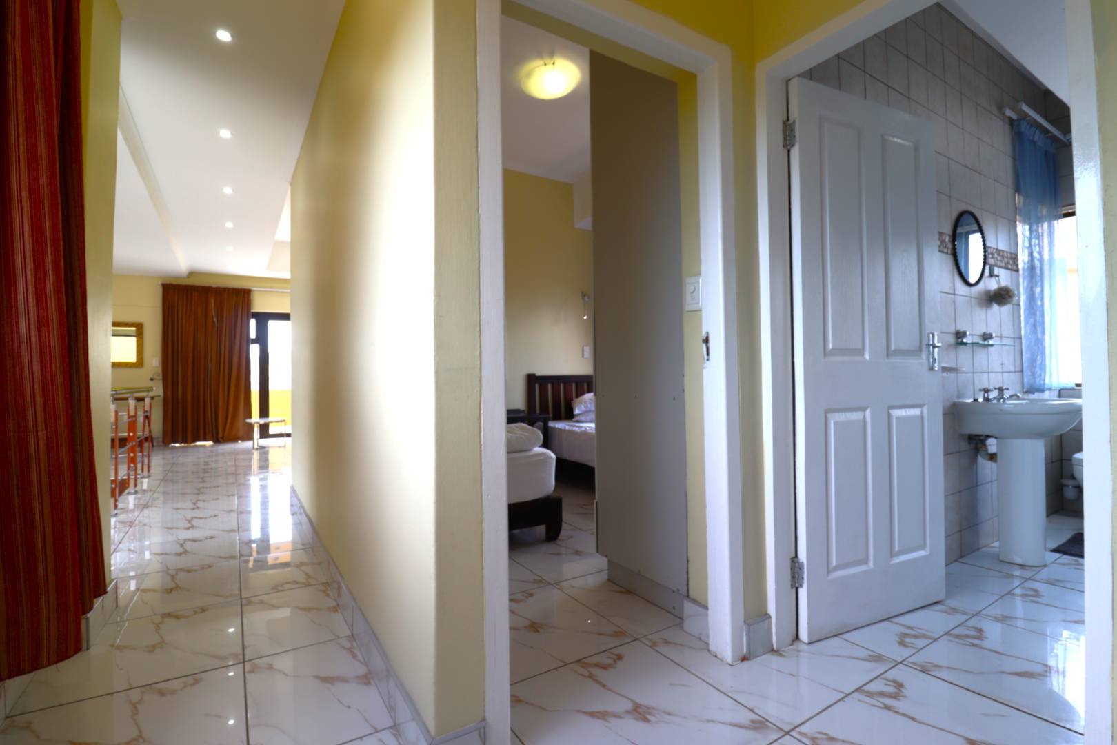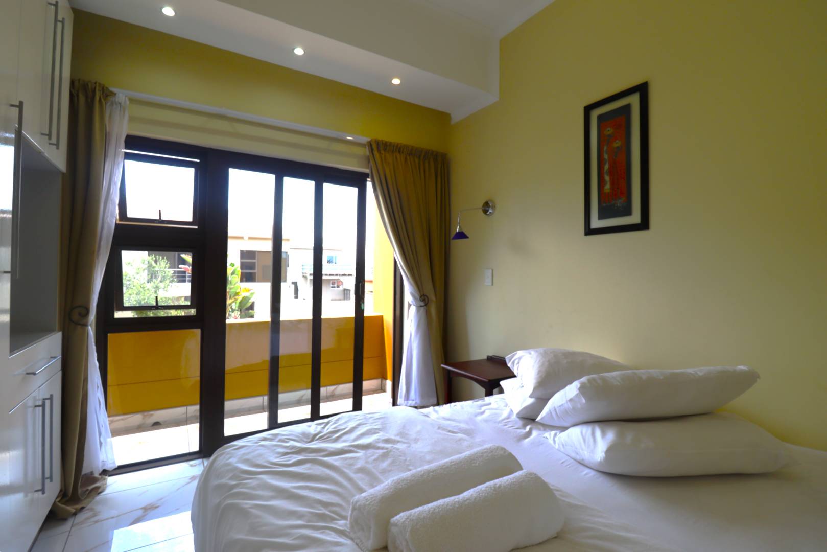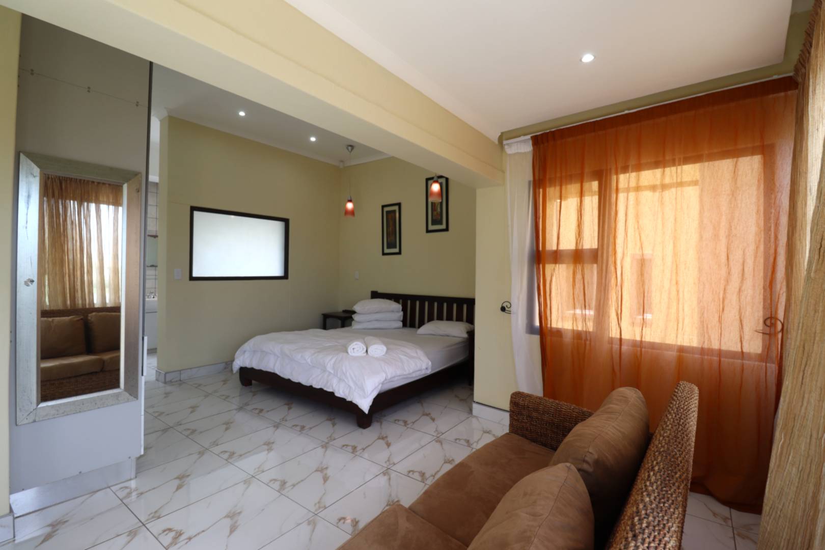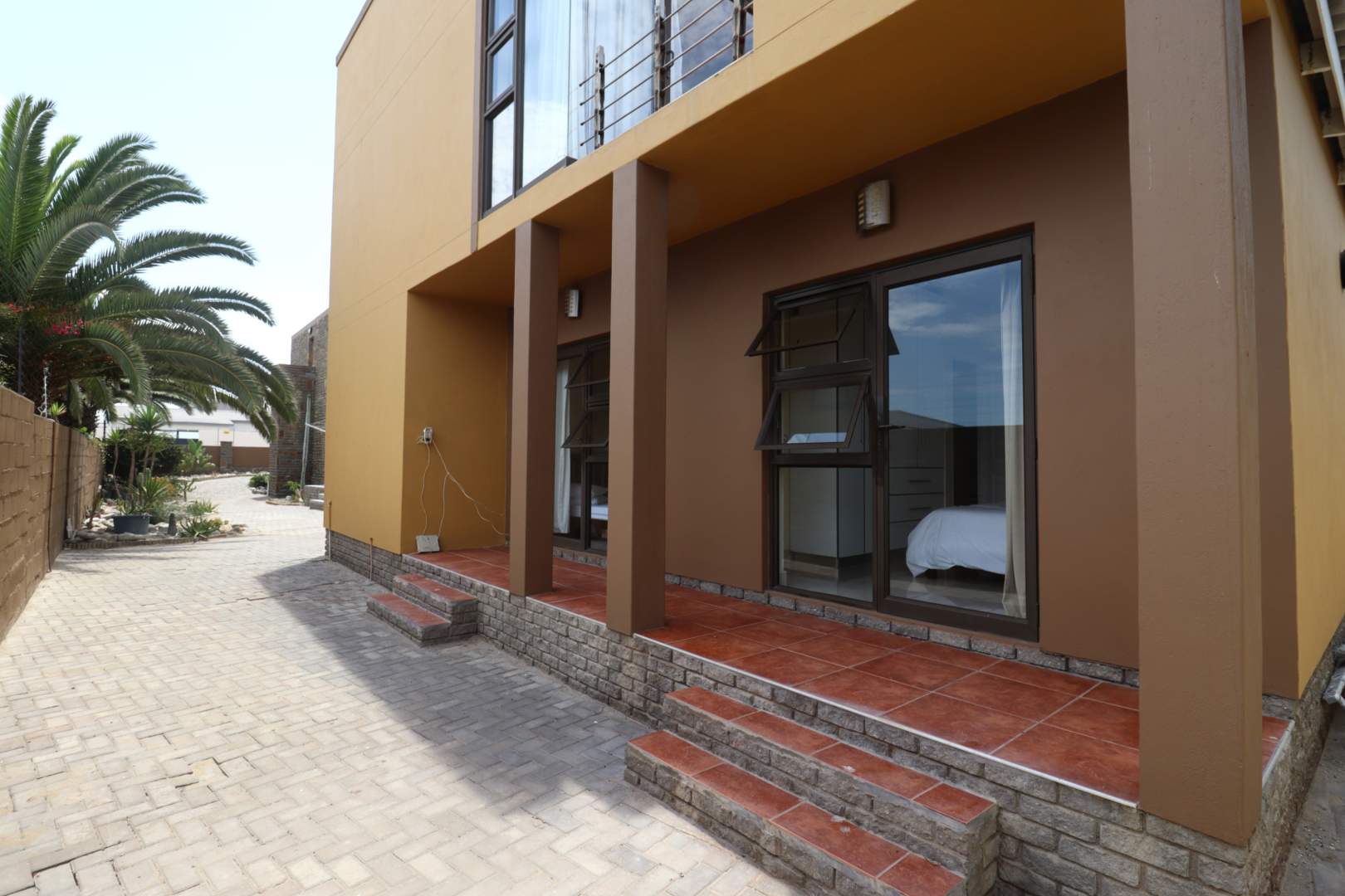 Upstairs, the flat offers a private retreat with one large bedroom opening onto a balcony, a full bathroom, walk-in cupboards, and a sauna, creating a luxurious private space for guests or family members.