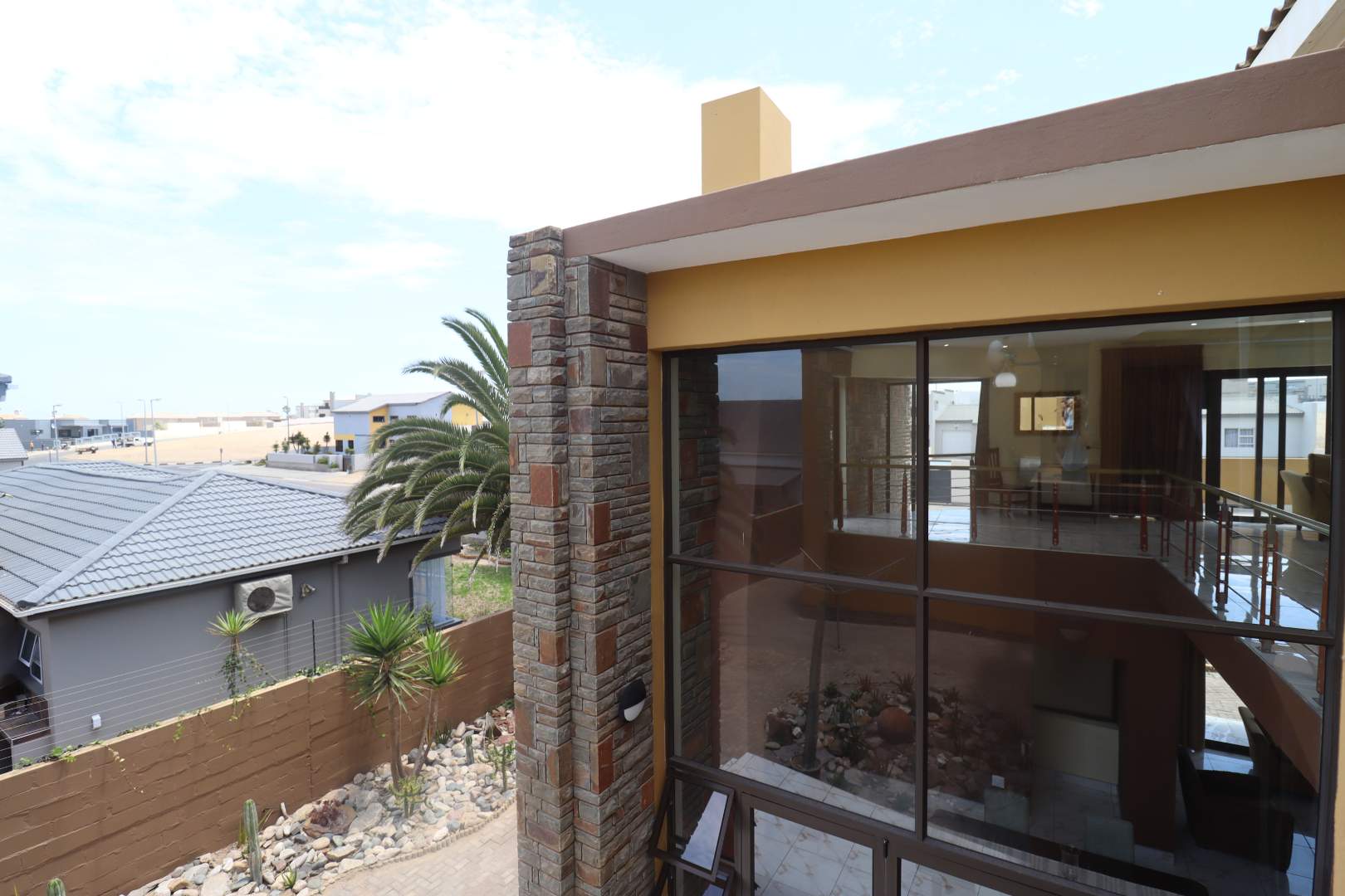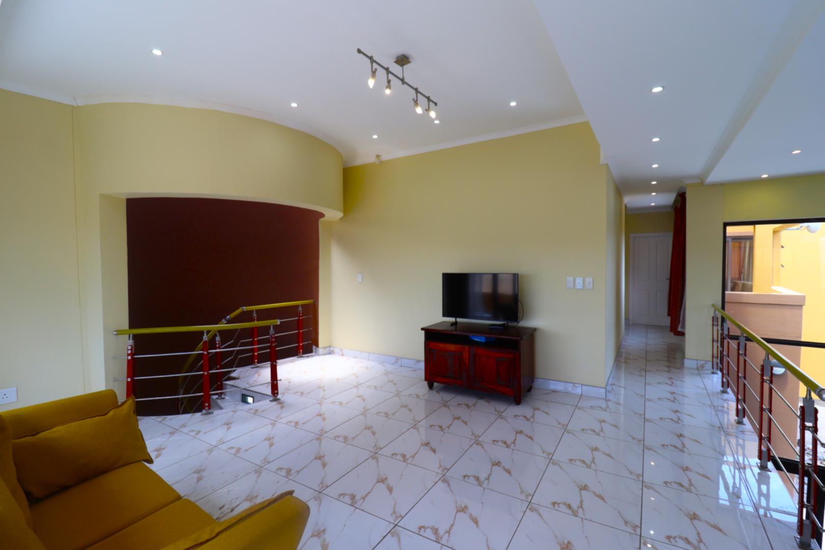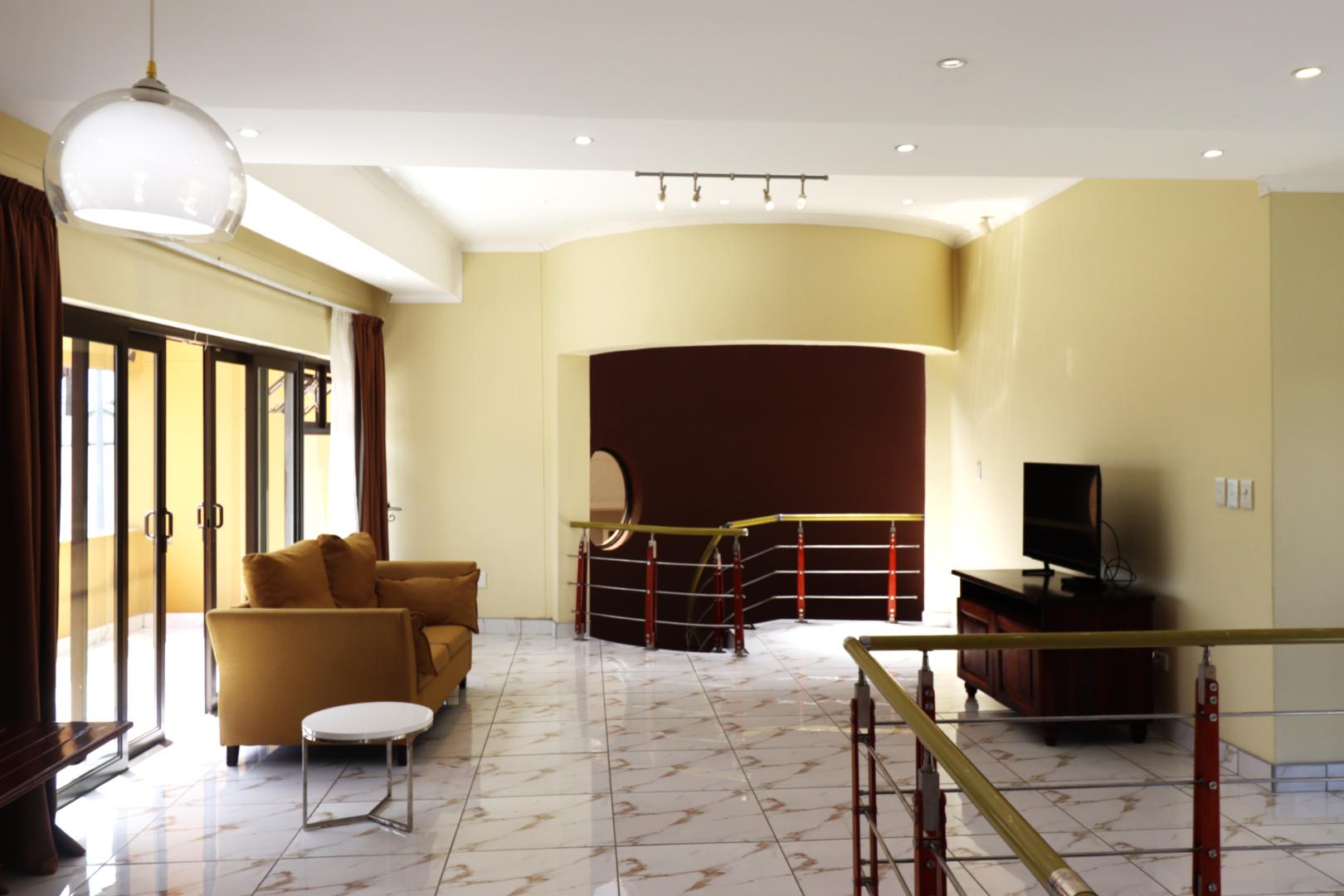 Upstairs, stairs lead to a large private family lounge with expansive windows and a balcony. Three generously sized bedrooms provide privacy and comfort for the family. The spacious main bedroom includes a balcony, a full en-suite bathroom, and built-in cupboards. Both guest bedrooms, each with a private balcony and built-in cupboards, share a full bathroom.