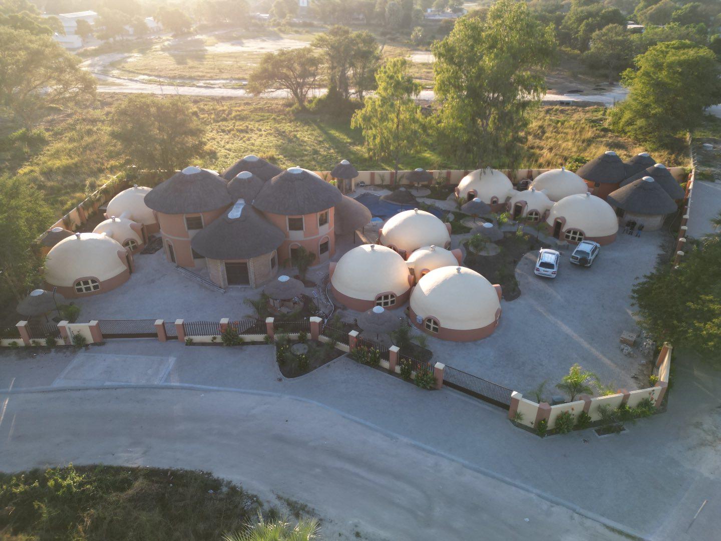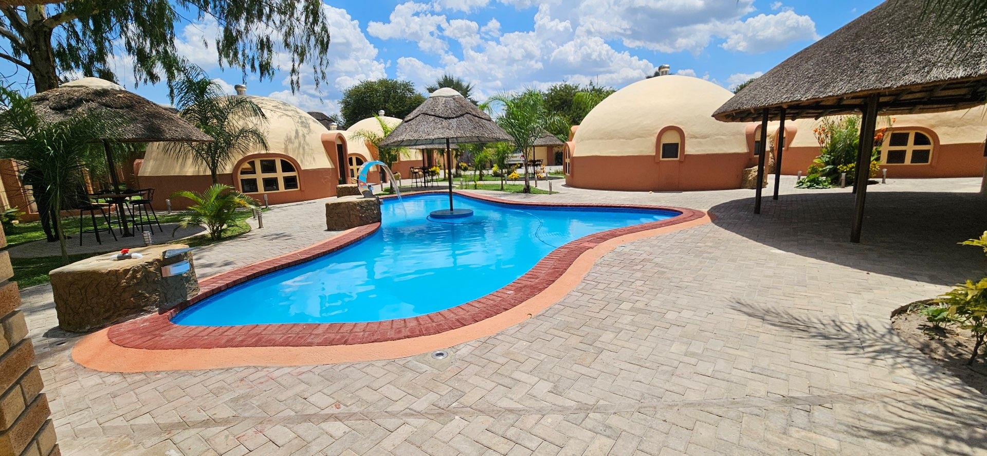 This brand new unfurnished 16 ensuite Units sits on a 2500m2 land situated within the CBD area of Katima Mulilo. This unique architectural masterpiece business property is highly suitable for a Town Lodge, Private Hospital, Medical Facility with a Step-Down Services, Private School Centre or a Unique Office Complex. In addition to the 16 unique domes designs Units, the property has triple double story administration block holding a reception area, kitchen, ablution facility, multiple service rooms, 2 offices, 3 very large spaces that can serve as a restaurant, private lounging and meeting rooms areas. One of the large ground level rooms is connected to the outside pool area via a thatched gazebo. The property is powered by LED multicolored strip, star and down lights lighting systems. The outdoor area of this property is completed with interlocked drive ways, car park and walk ways all carefully layout within a well-designed garden living environment complete with mature palm trees, bushes around a central large swimming pool.