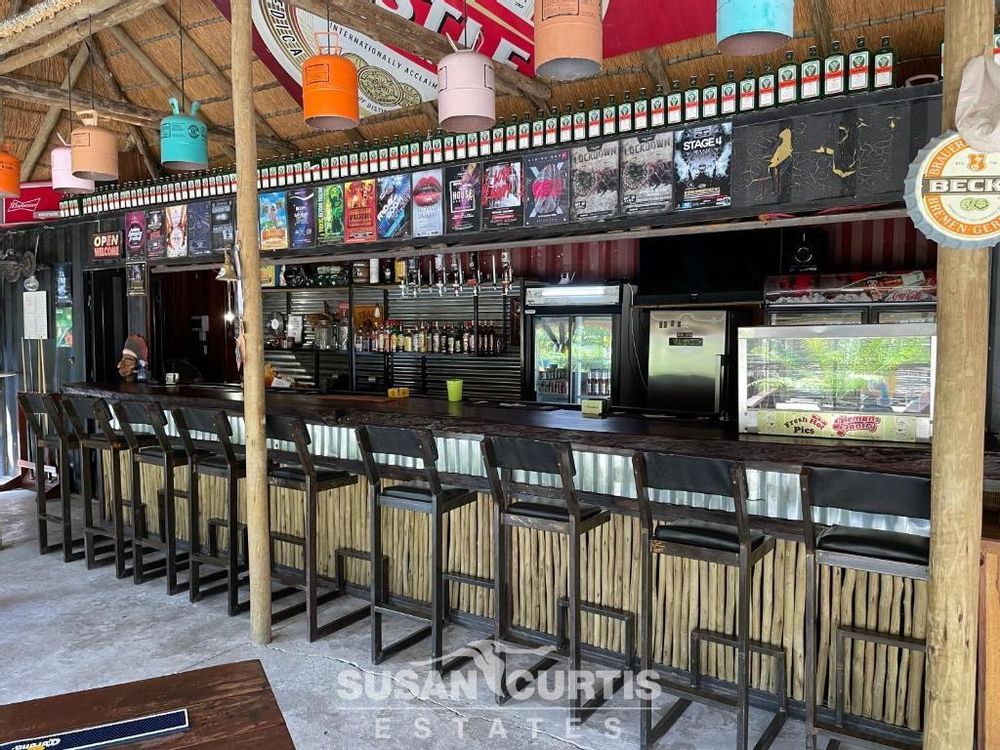 The Guesthouse Section of the property includes three wooden cabins with ensuite bathrooms, two container rooms with ensuite bathrooms, and five standard rooms with ensuite bathrooms. Additionally, there is a fully functional Lapa/Bar with a kitchen and entertainment area. There is also a laundry room and two flats, one with a single bedroom and the other with two bedrooms.