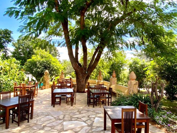Wake up to panoramic Kavango River floodplain views at Tambuti Lodge in central Rundu, set on lush gardens with 80 fruit trees, solar power and eight bungalows sleeping 24.