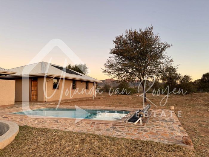 Entertainers' estate 40km east of Windhoek on Hosea Kutako road, set in natural surrounds with sweeping views, private heated pool and boma — four bedrooms, two baths, triple garage.