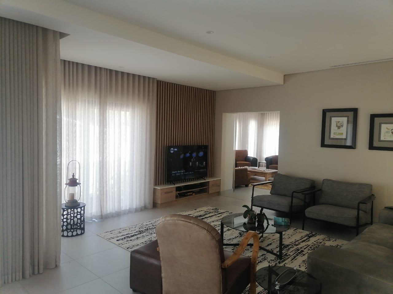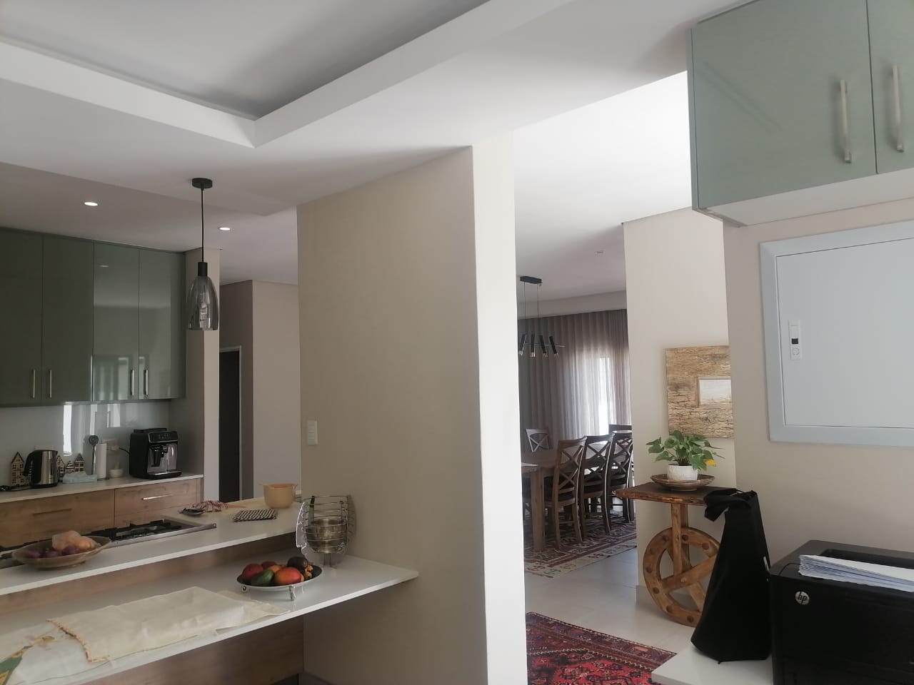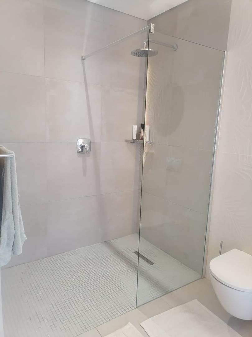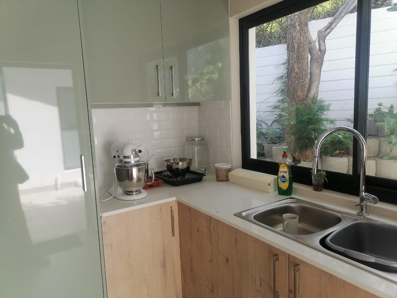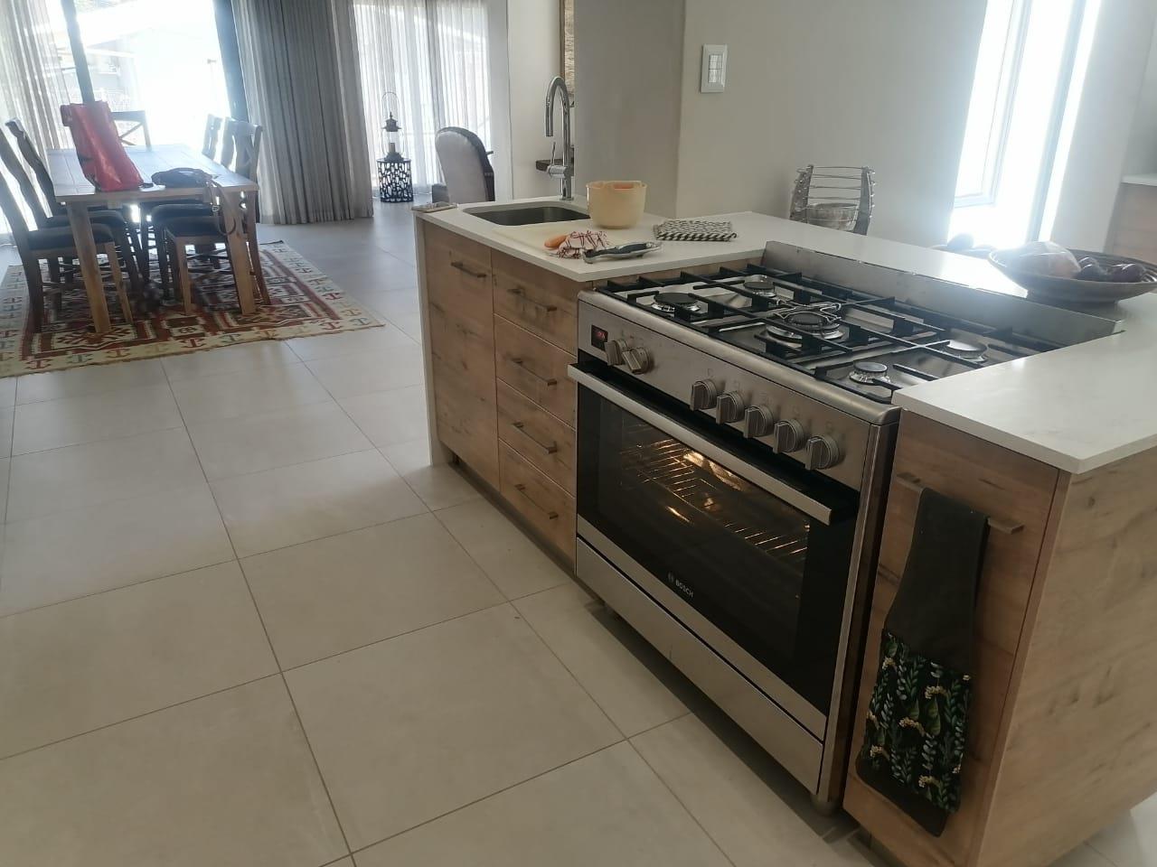 The home features three spacious tiled bedrooms and three modern bathrooms with walk in showers. The contemporary open plan kitchen is fitted with a large gas stove and electric oven, ample cupboard space, and a separate scullery for added convenience. The light filled living and dining areas flow seamlessly to the outdoor spaces, making it ideal for both everyday living and entertaining.