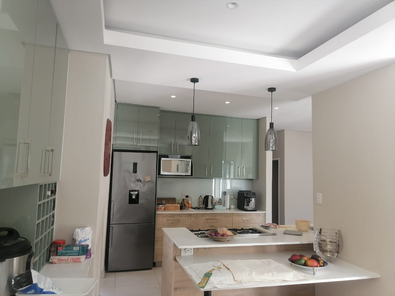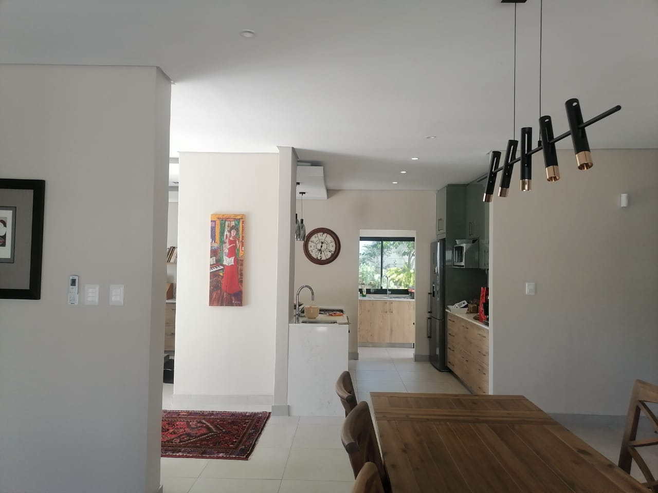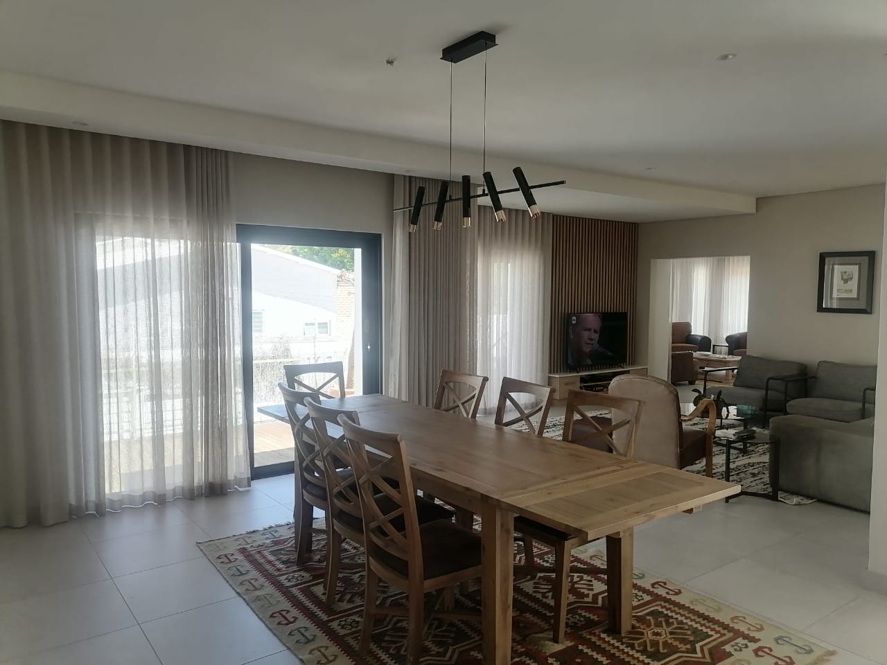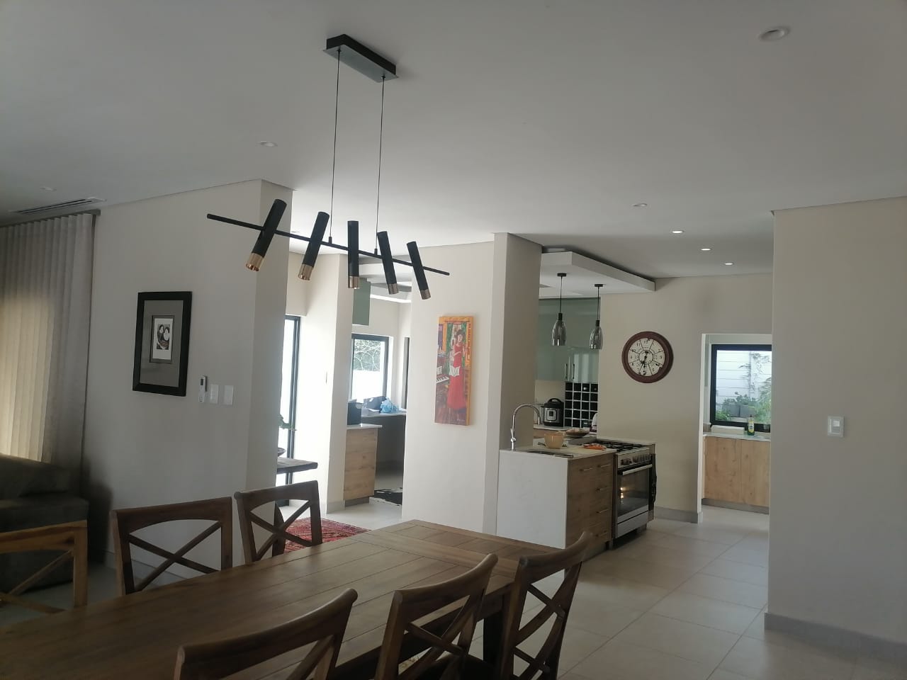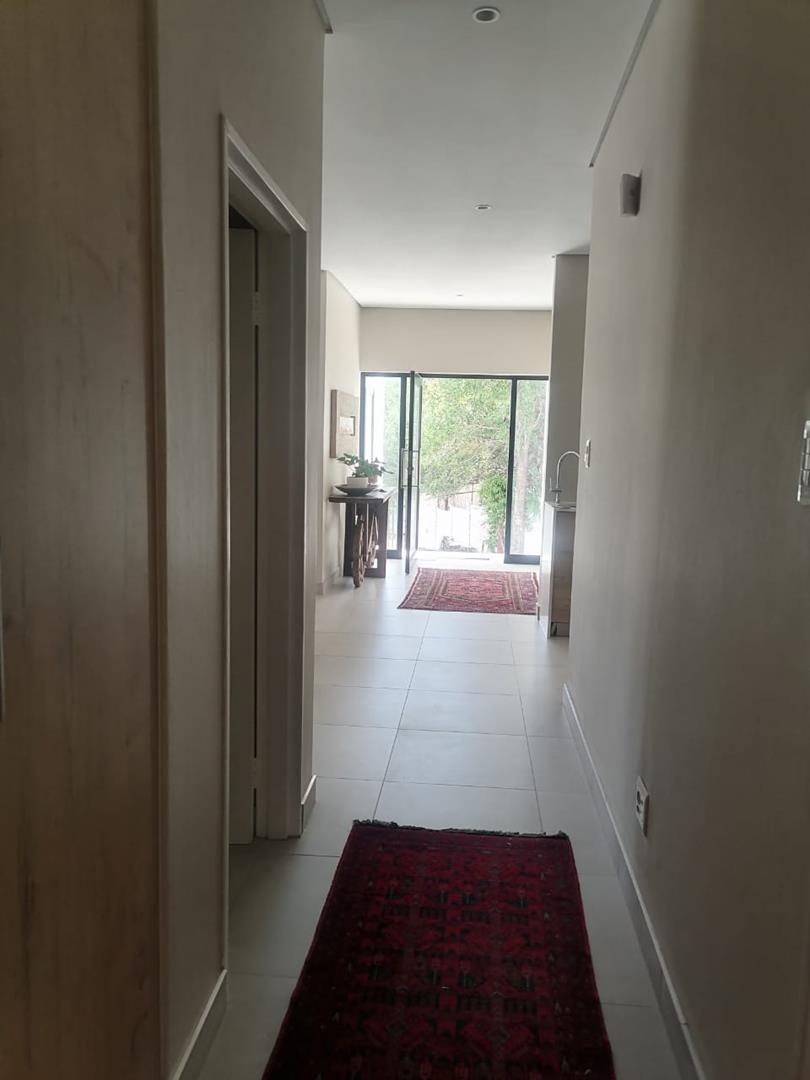 The home features three spacious tiled bedrooms and three modern bathrooms with walk in showers. The contemporary open plan kitchen is fitted with a large gas stove and electric oven, ample cupboard space, and a separate scullery for added convenience. The light filled living and dining areas flow seamlessly to the outdoor spaces, making it ideal for both everyday living and entertaining.