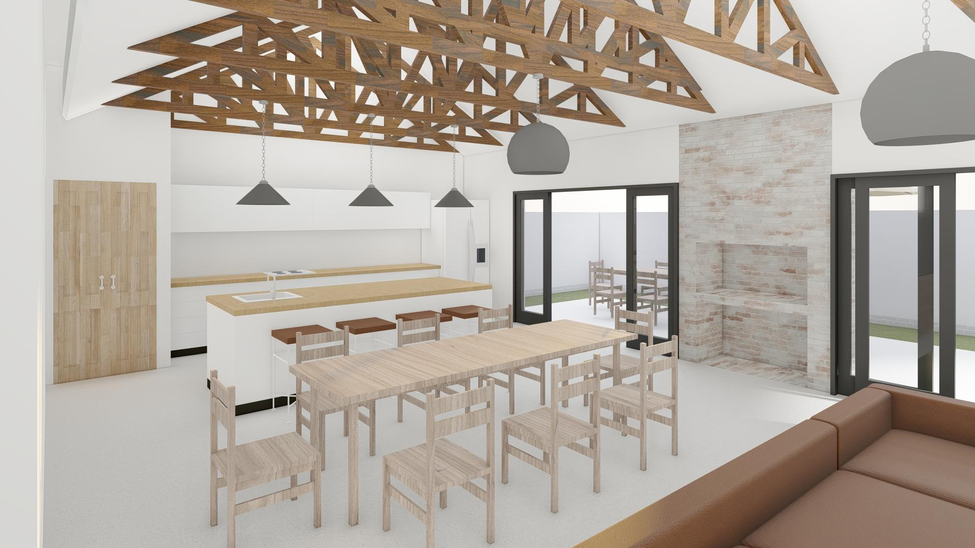 - Open-plan living area/kitchen/dining area with roof open trusses