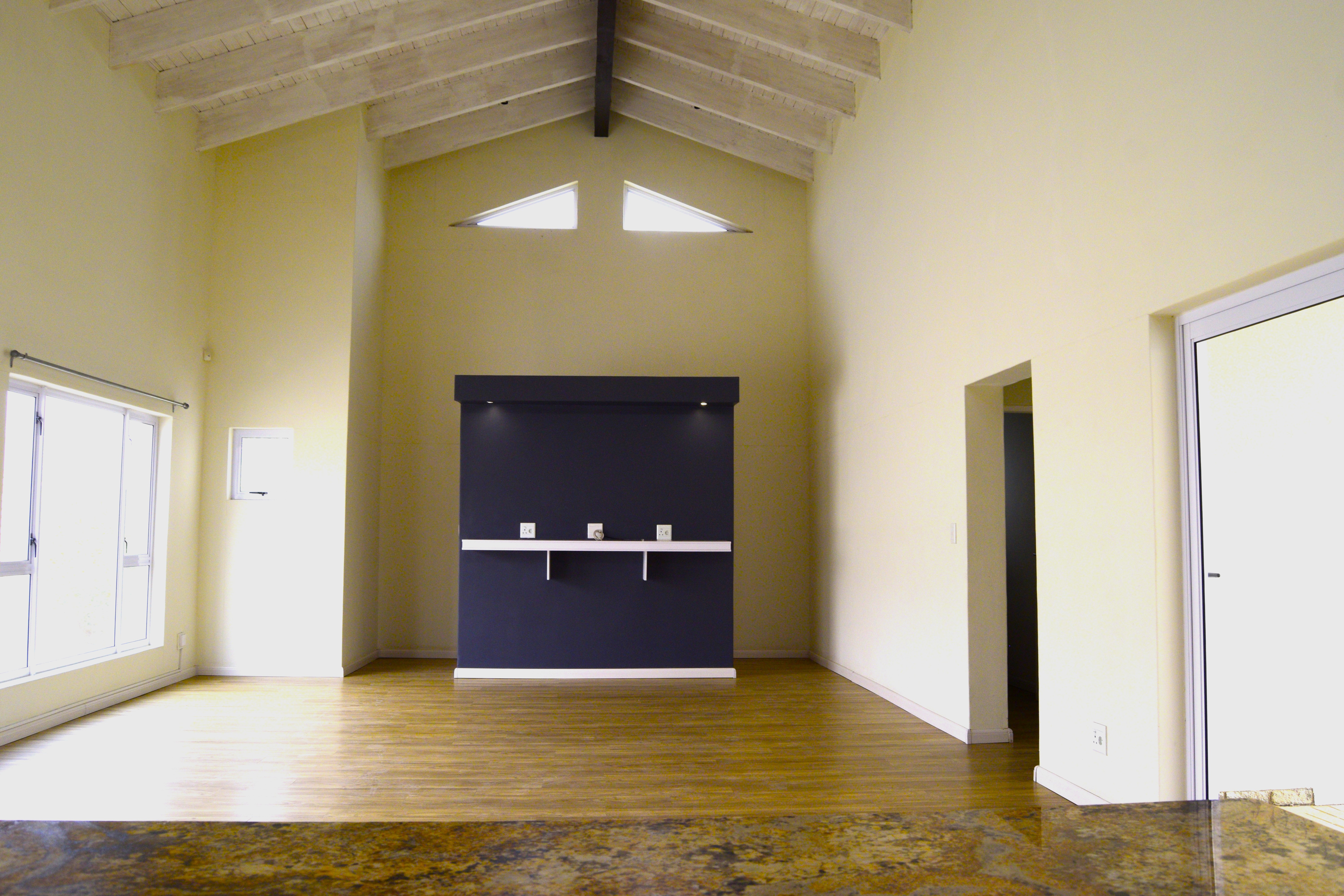 The open-plan living area with dramatic high truss ceilings immediately sets the tone - bright, airy, and welcoming.