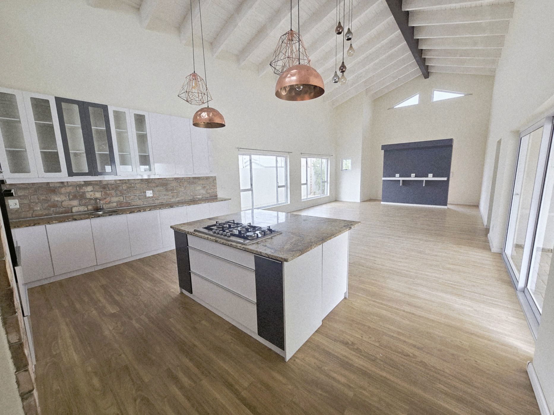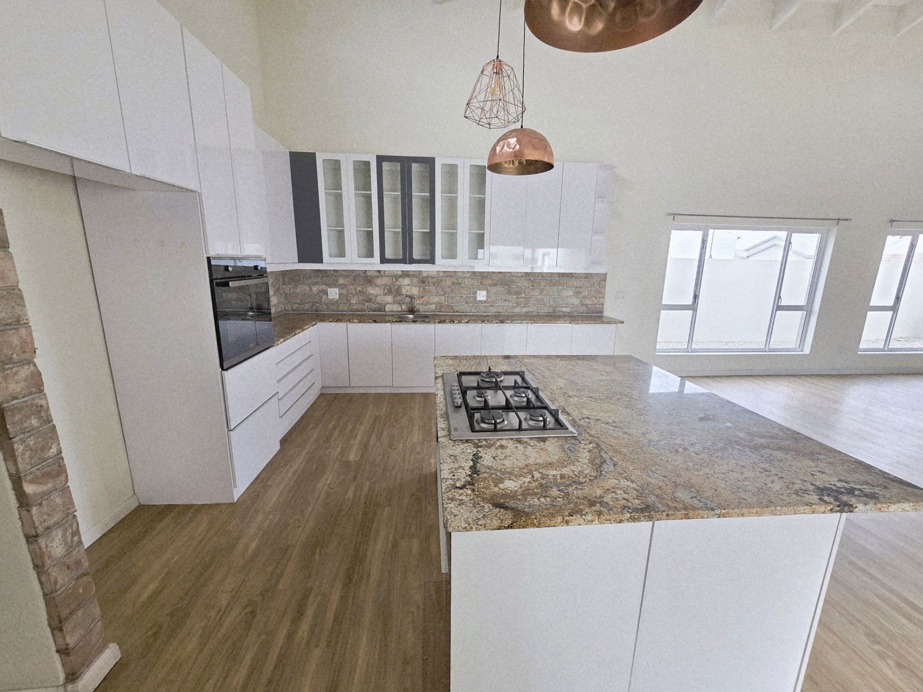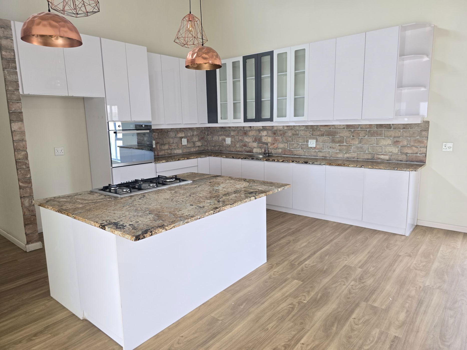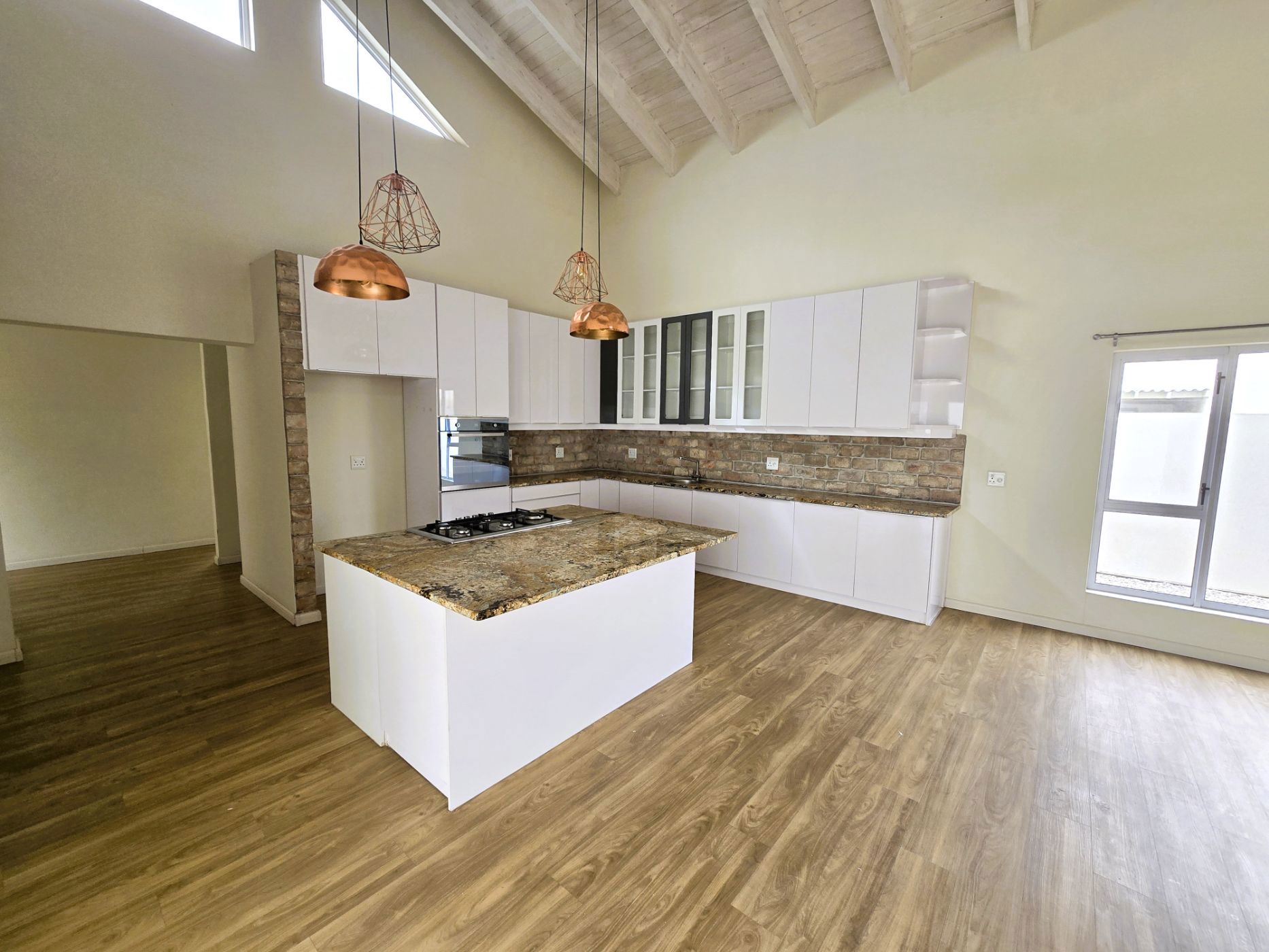 The sleek, contemporary layout flows effortlessly, offering a refined living experience. At the heart of the home lies a gourmet kitchen — a dream for any culinary enthusiast — featuring granite countertops, a gas hob, and an eye-level oven. A separate scullery and laundry room keep your space organized and clutter-free. The open-plan design connects the kitchen, living area, and BBQ space seamlessly, making it perfect for hosting friends or enjoying relaxed family gatherings.
