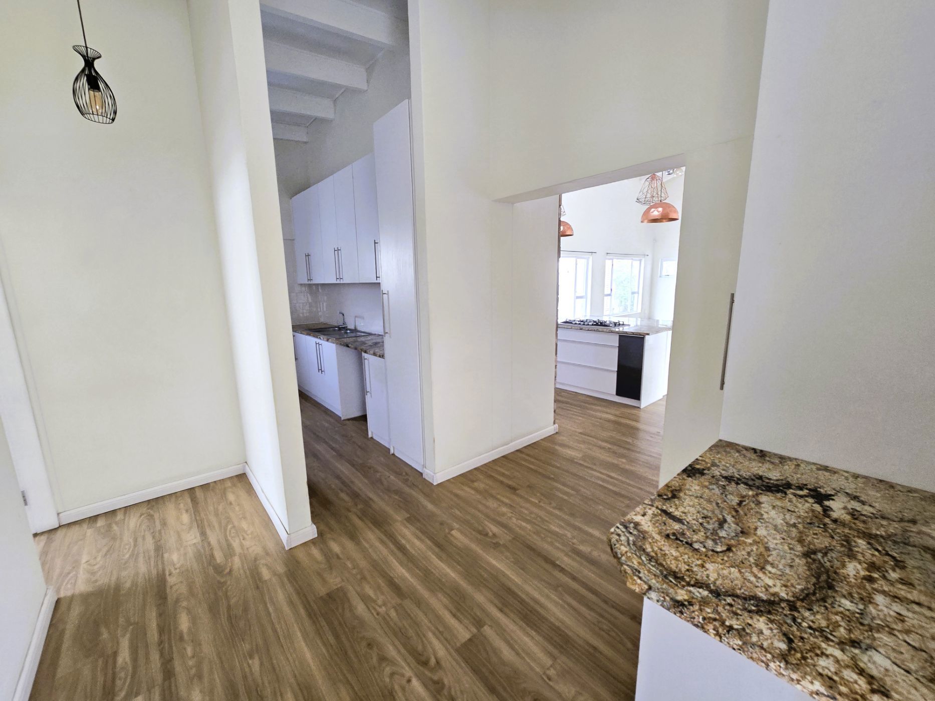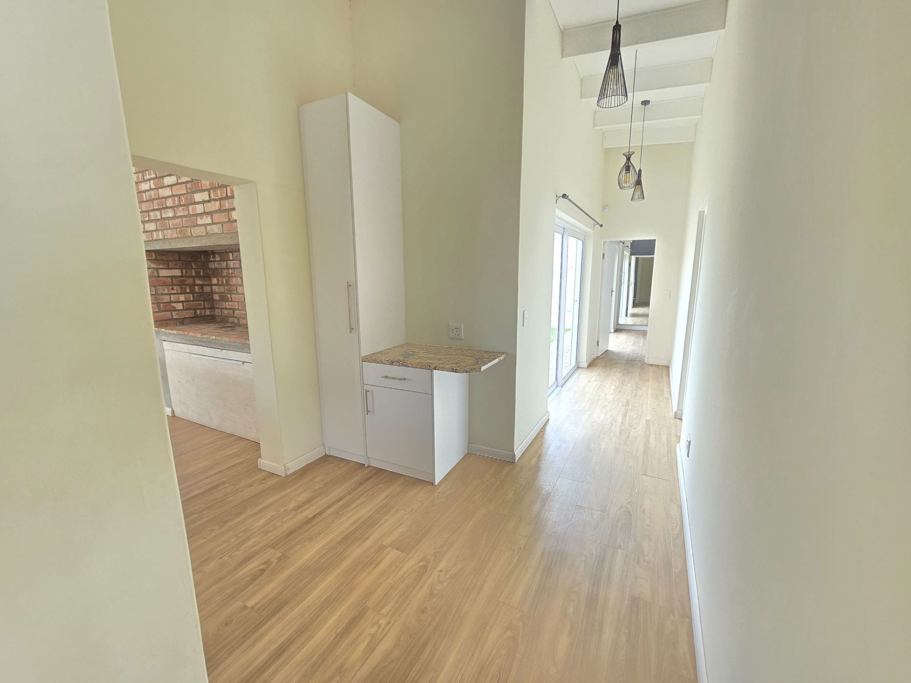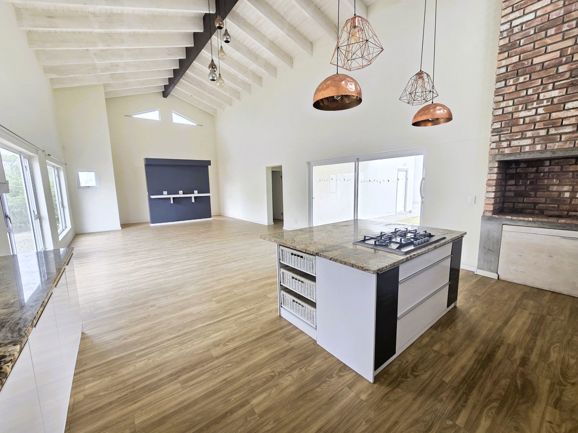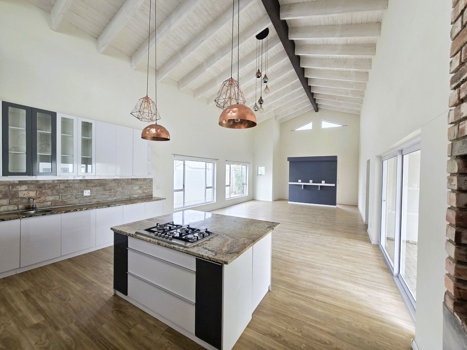 The sleek, contemporary layout flows effortlessly, offering a refined living experience. At the heart of the home lies a gourmet kitchen — a dream for any culinary enthusiast — featuring granite countertops, a gas hob, and an eye-level oven. A separate scullery and laundry room keep your space organized and clutter-free. The open-plan design connects the kitchen, living area, and BBQ space seamlessly, making it perfect for hosting friends or enjoying relaxed family gatherings.