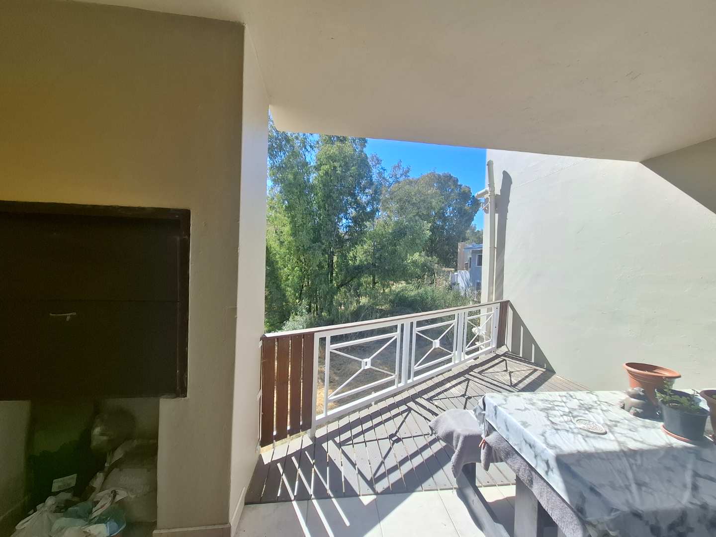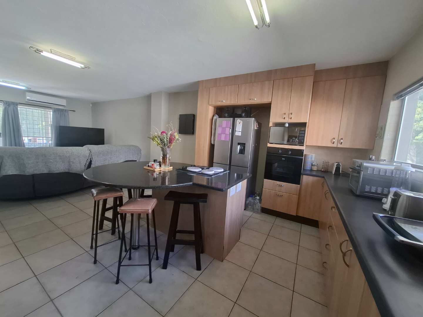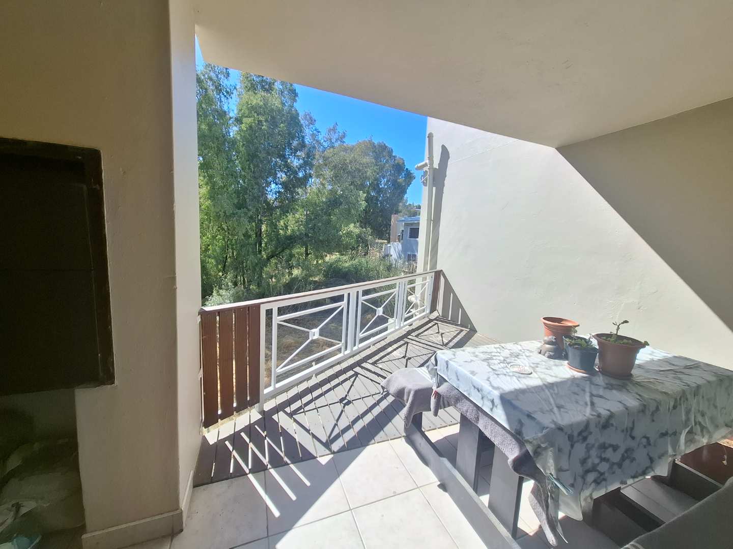 The first floor features a generous open-plan living area that flows seamlessly into a modern kitchen fitted with granite countertops and a separate scullery. The living area is air-conditioned for year-round comfort and opens onto a balcony with a lovely river view and a built-in BBQ — perfect for entertaining or relaxing. A guest loo is conveniently located on this level.