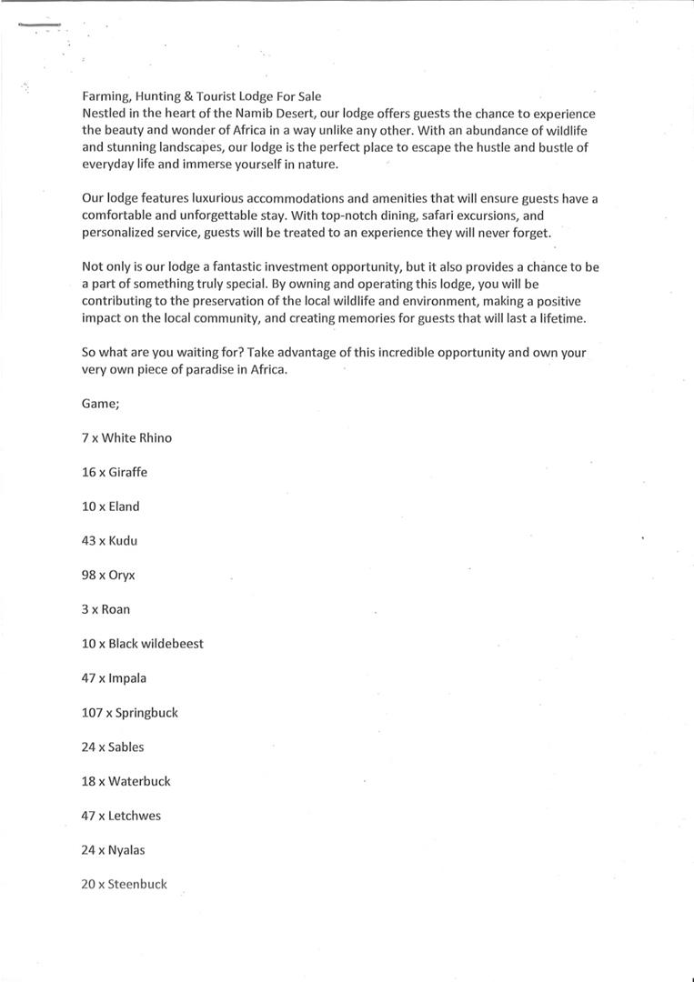 Looking for an investment that marries spectacular natural landscapes with outstanding profitability? Discover this exceptional lodge nestled in the heart of the breathtaking Namib Desert. This property offers a unique blend of farming, hunting, and thriving tourism, making it a truly remarkable business opportunity. ๐โจ