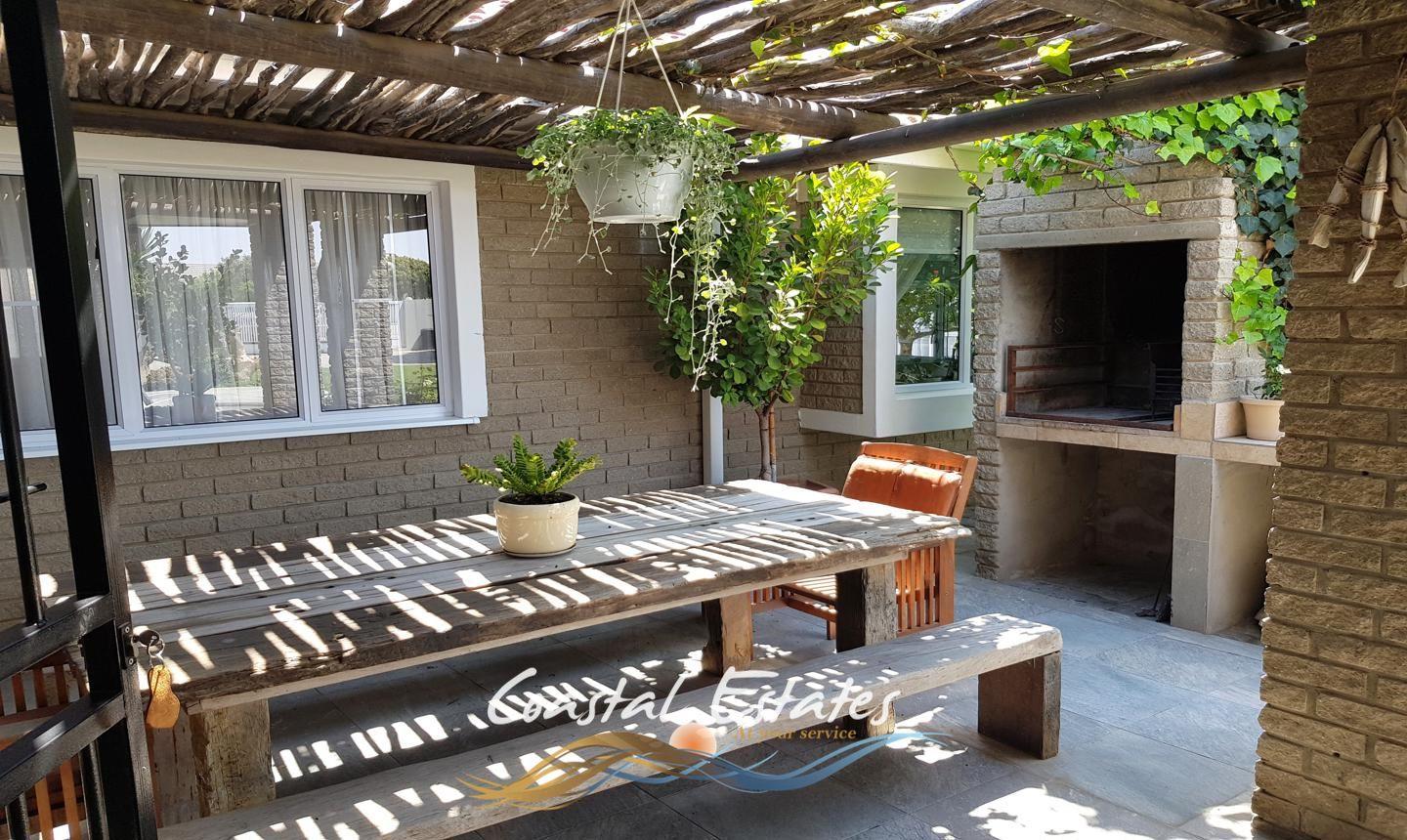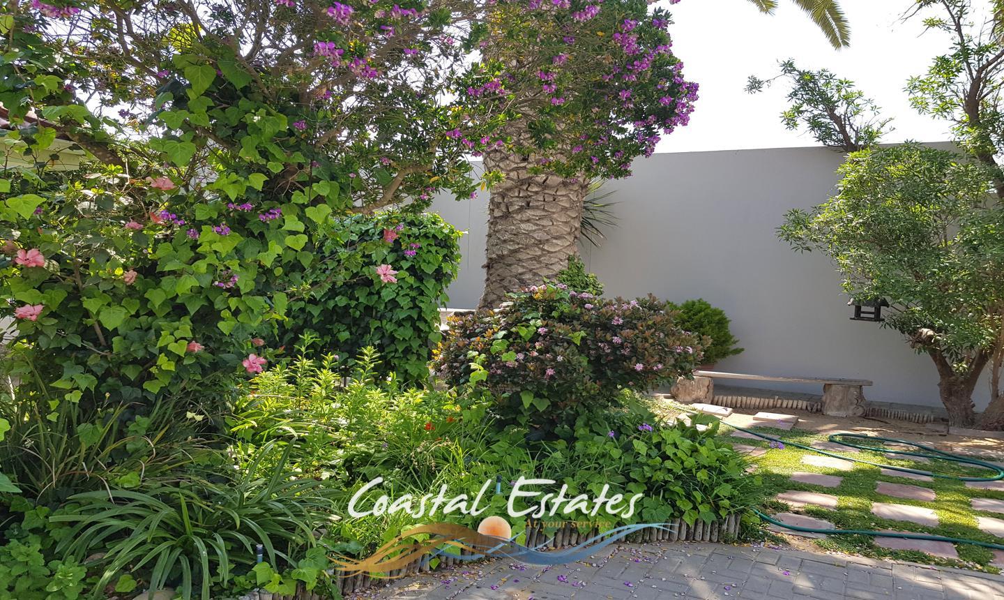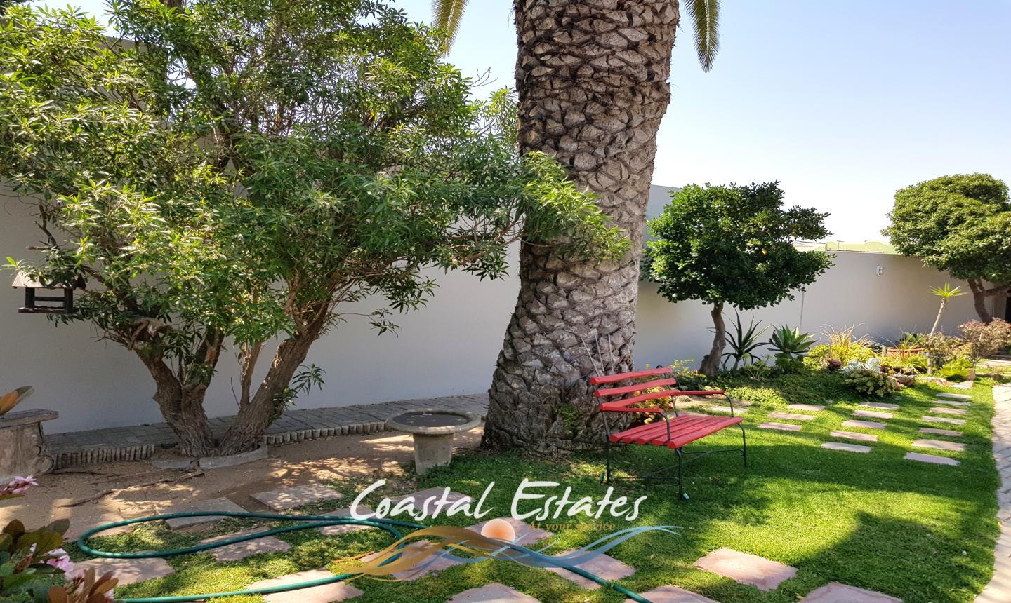 The outdoor BBQ and entertainment area, complete with a pergola, offers an ideal setting for gatherings. The property is surrounded by a beautifully landscaped garden, maintained by an integrated sprinkler system, providing a lush and tranquil environment.