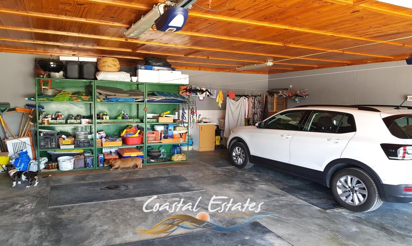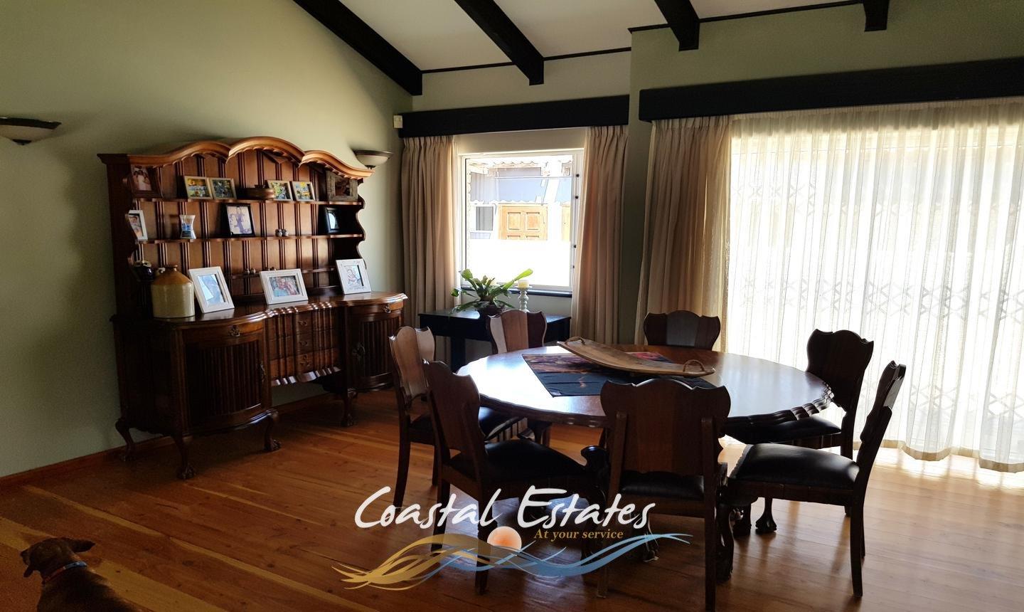 The entrance hall leads into a spacious open-plan living area, adorned with exquisite Oregon pine floors and exposed wooden roof trusses. This area seamlessly transitions into the combined dining room and lounge, complete with a built-in indoor BBQ for year-round entertaining.