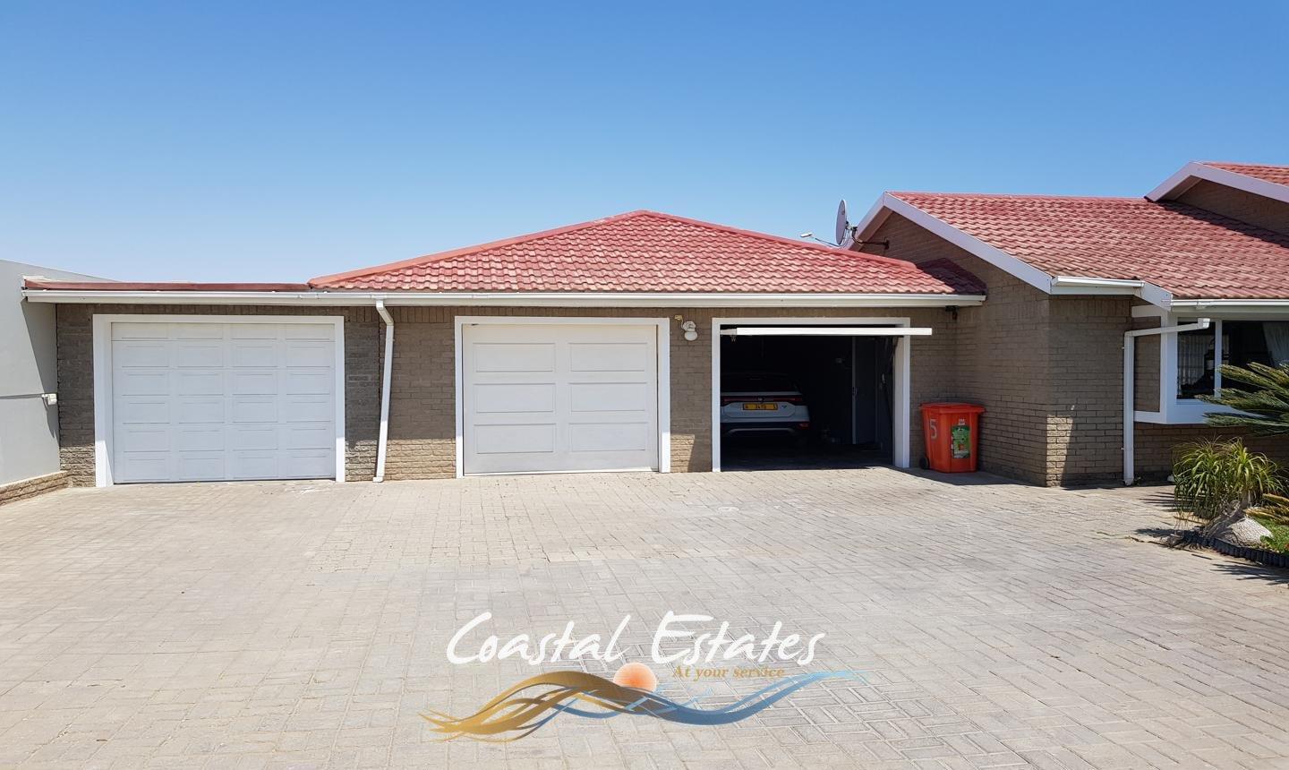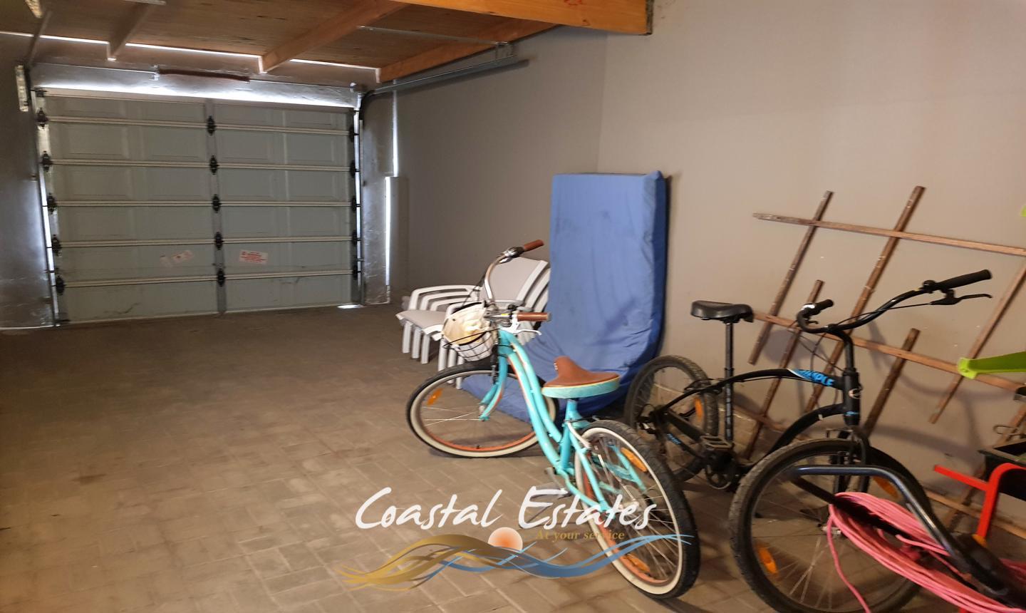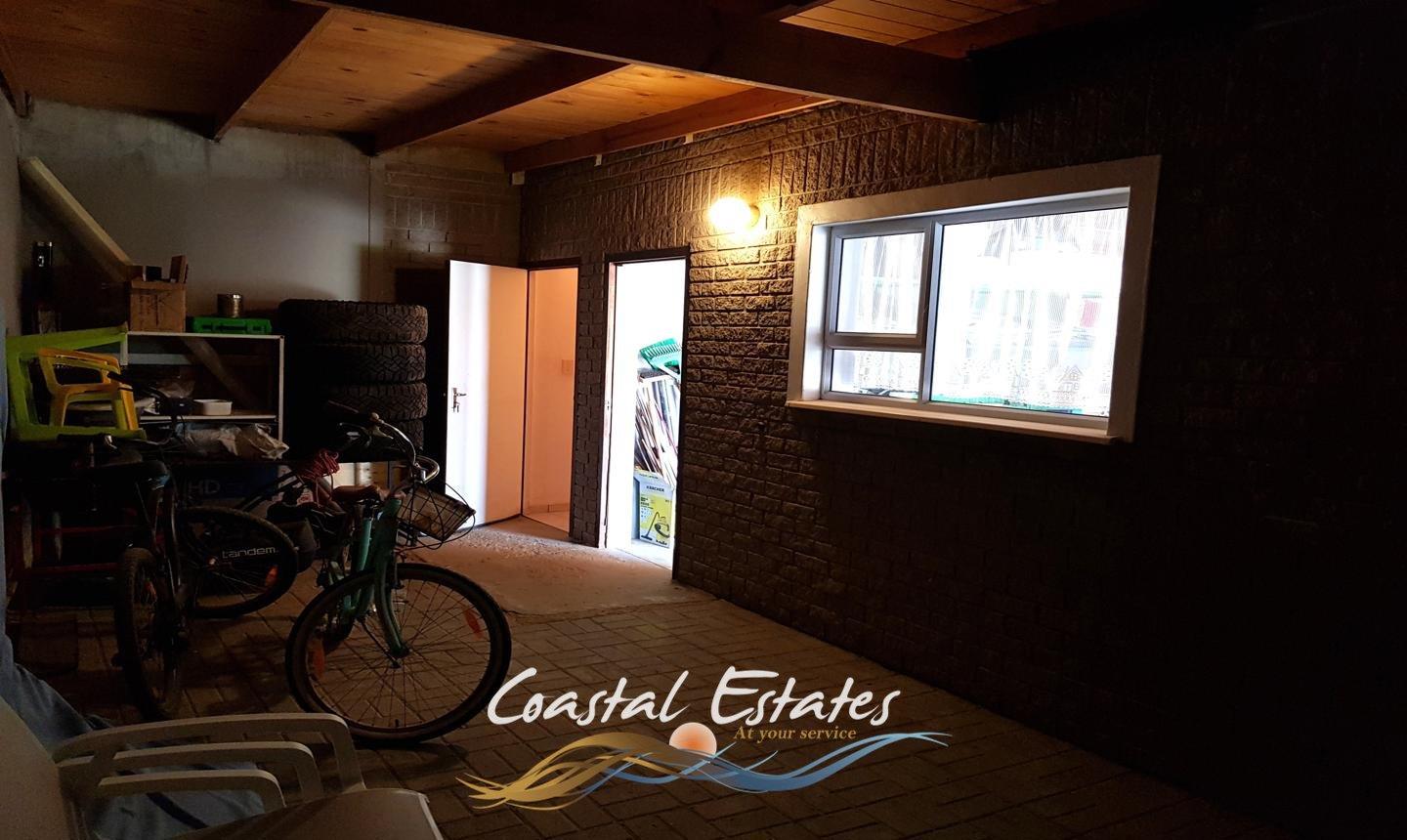 Security is paramount, with features such as trellidoors, invisible burglar bars, security beams, and an alarm system ensuring peace of mind. Additional amenities include a servant's toilet and shower, remote-controlled gates, and three garages with ceiling storage space.