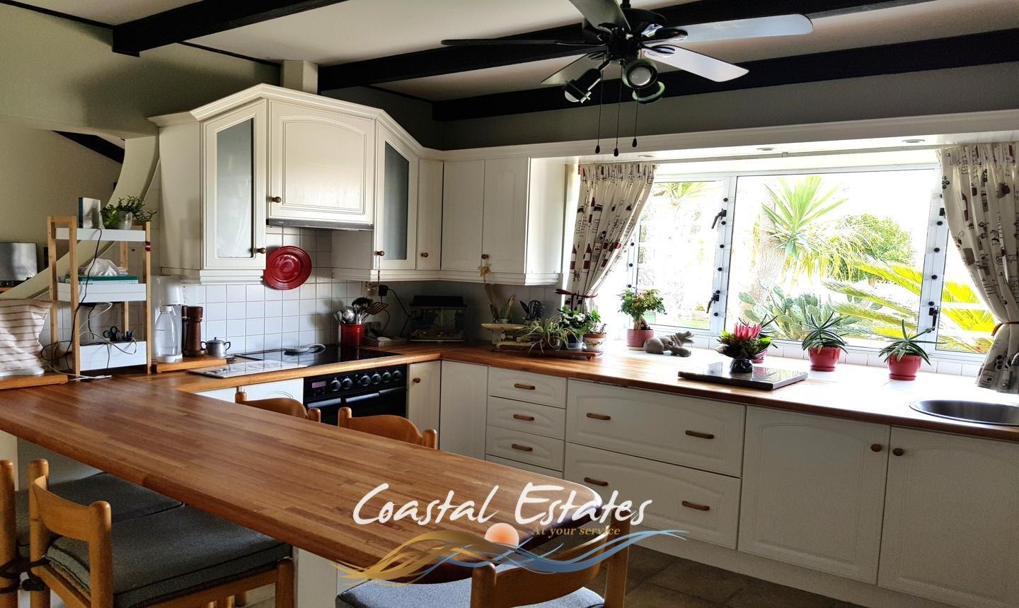 The kitchen is a chef's delight, featuring ample cupboard space, a charming bay window with garden views, and a large pantry. A separate scullery and laundry room enhance the home's functionality.