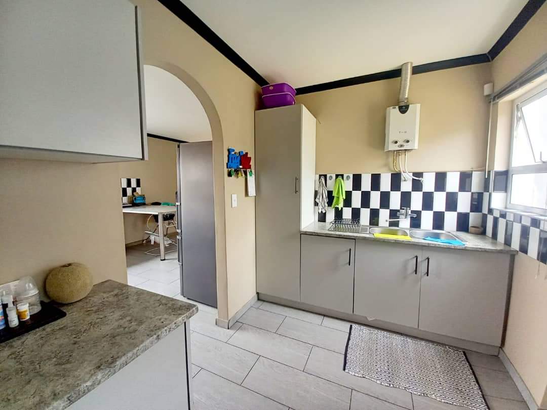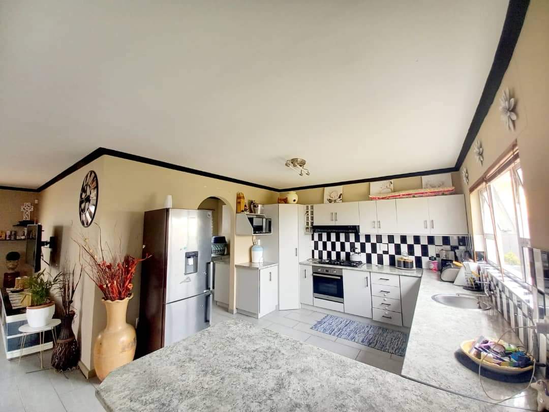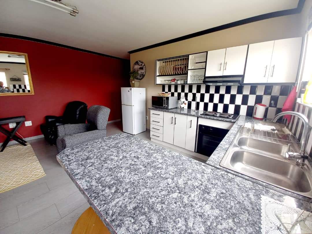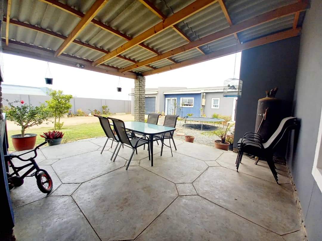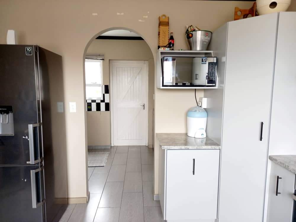 The main house features two generously sized bedrooms and two modern bathrooms, providing ample space. The heart of the home is the large, well-appointed kitchen, complete with built-in cupboards and a separate scullery, ensuring abundant storage and functionality. The inviting lounge area flows effortlessly into an indoor built-in braai space.