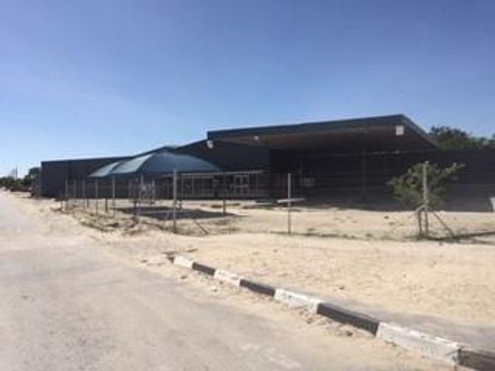 Commercial building in Ondangwa's industrial area, 915 sqm, includes office space, storeroom, parking, and convenient amenities.