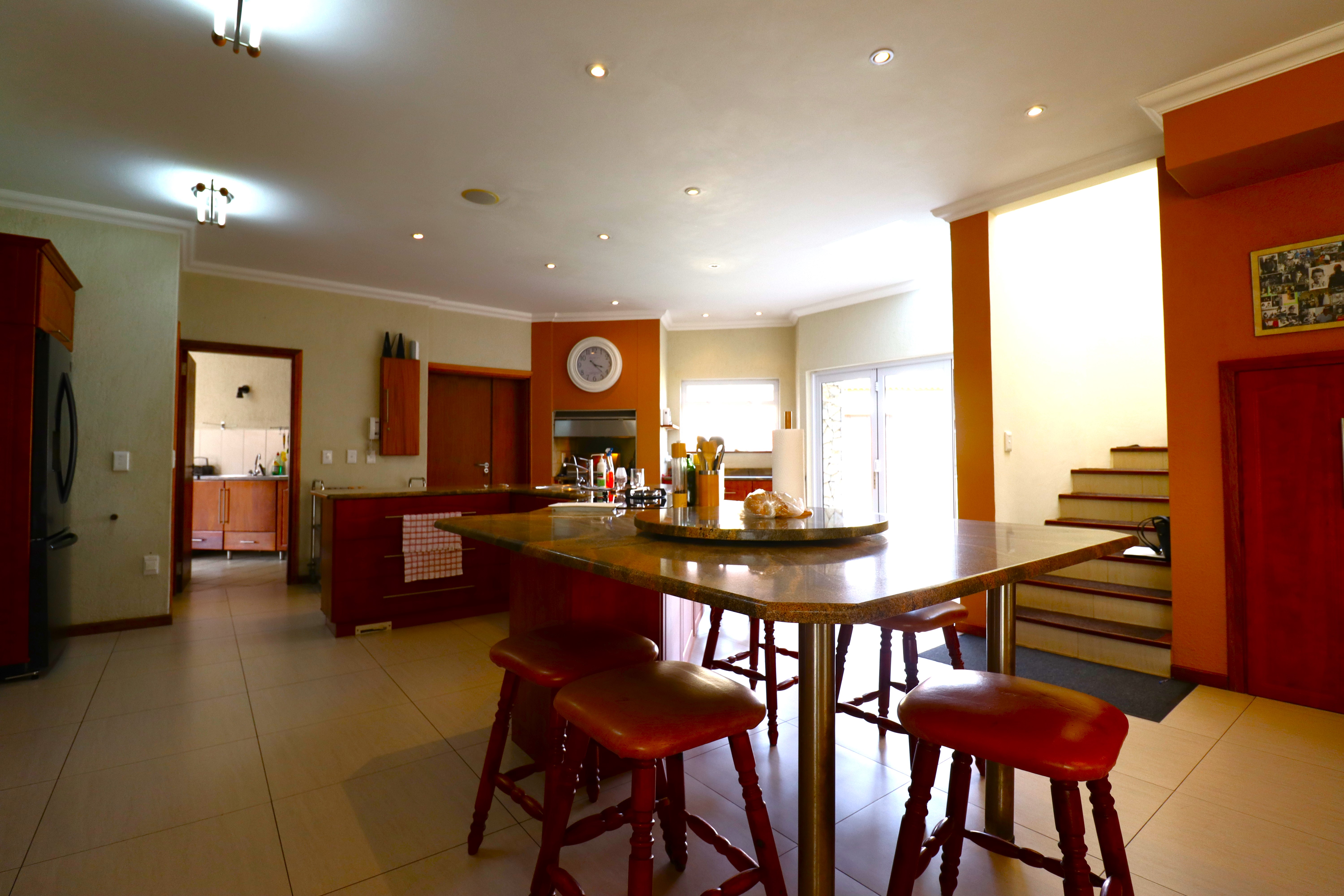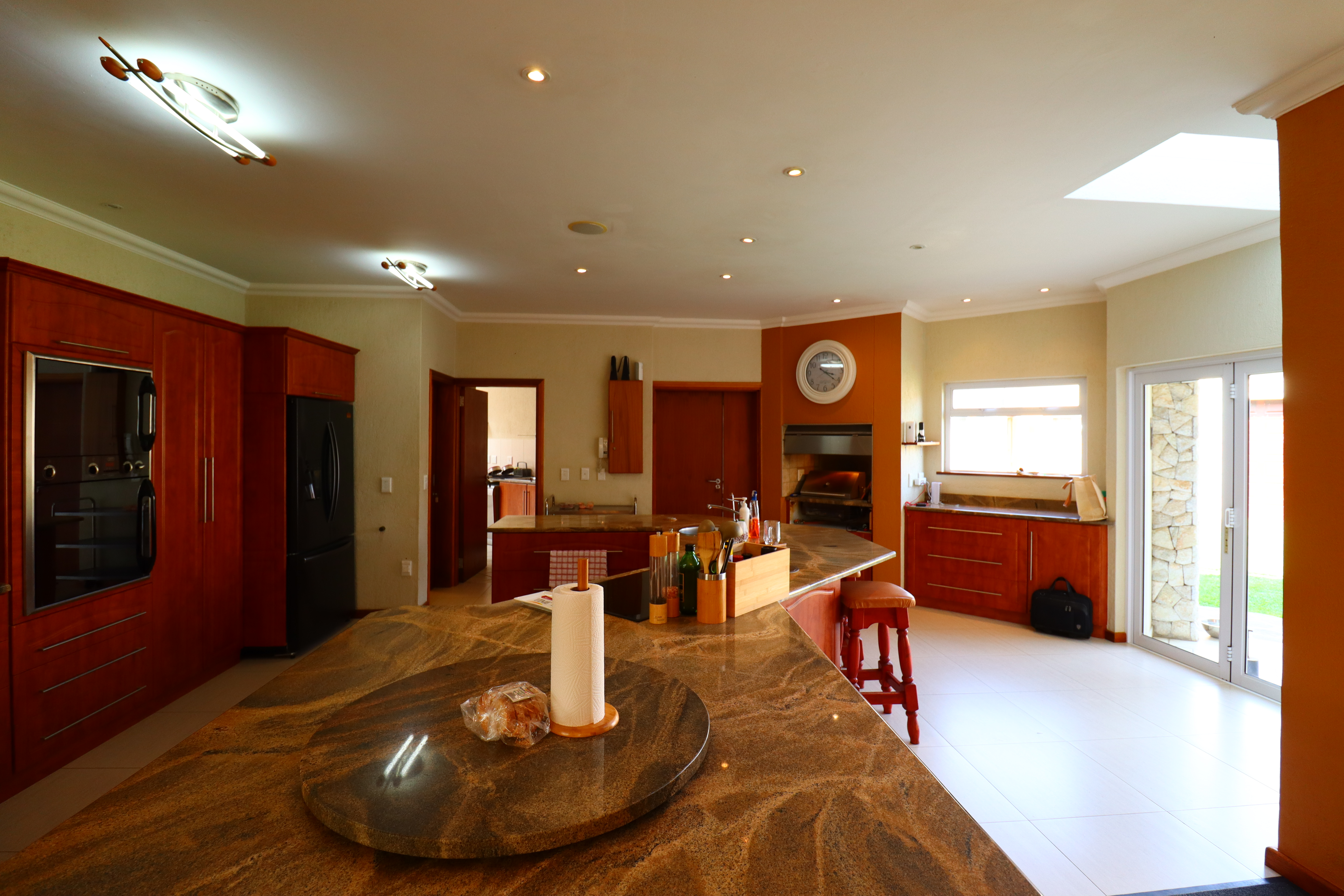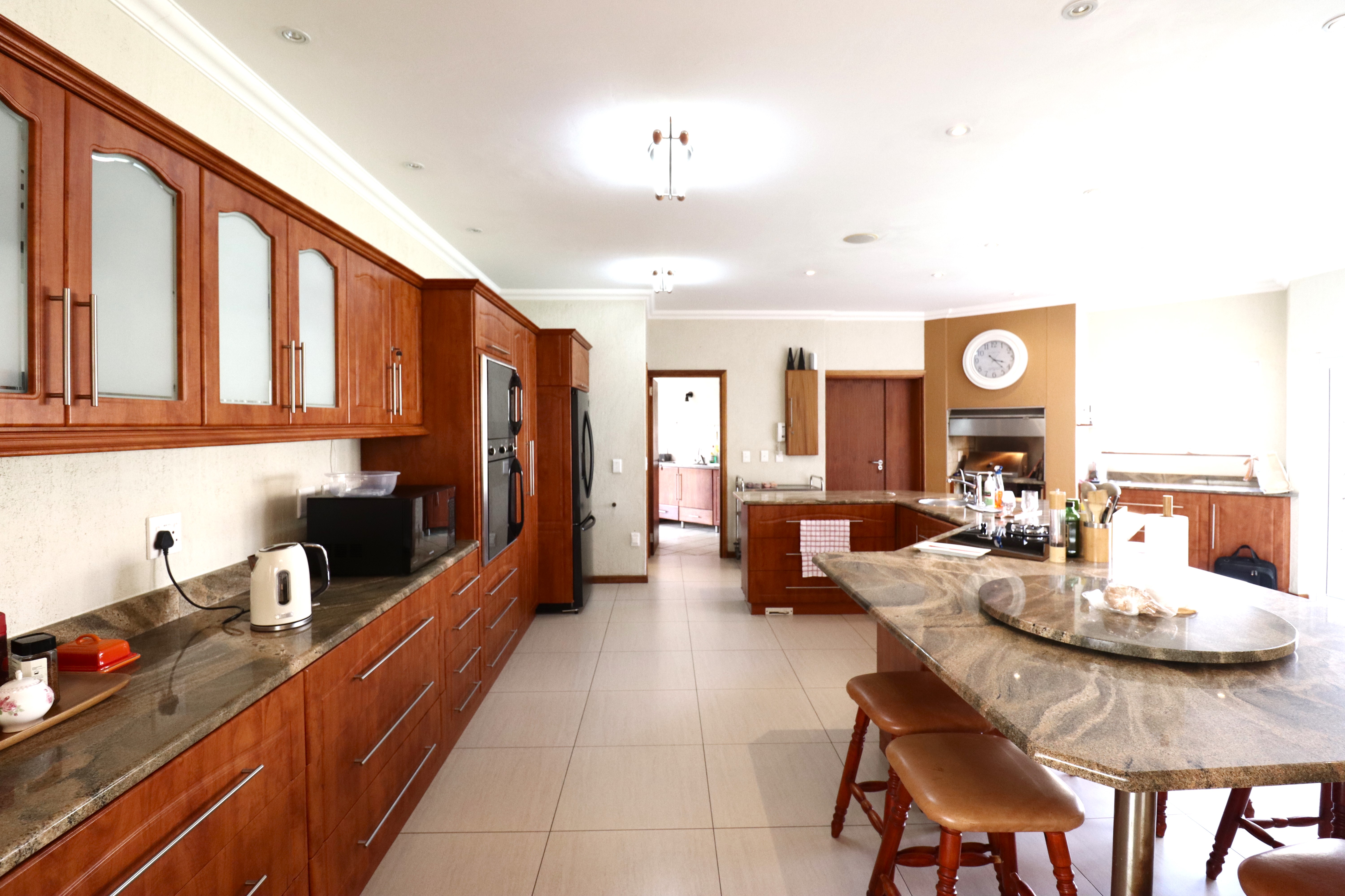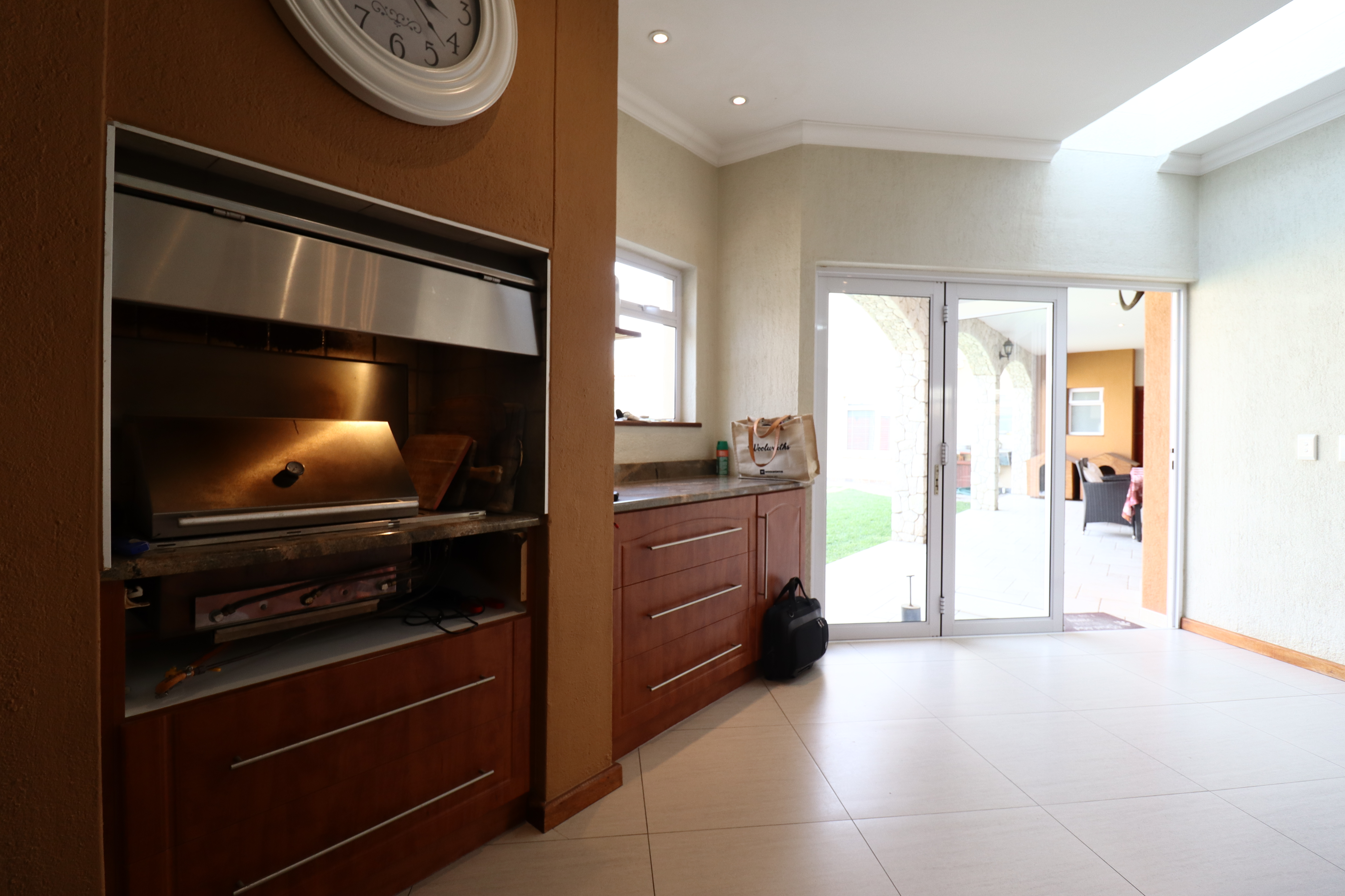 Four additional family bedrooms, each with ensuite bathrooms, are split between upstairs and downstairs. The lounge features a cozy gas fireplace, and the dining area and kitchen, equipped with underfloor heating, seamlessly connect. An indoor BBQ space also opens to the garden. The luxury gourmet kitchen showcases granite countertops, a gas grill, oven, glass top hob, plenty of built-in cupboards, and a separate scullery with a cold room.