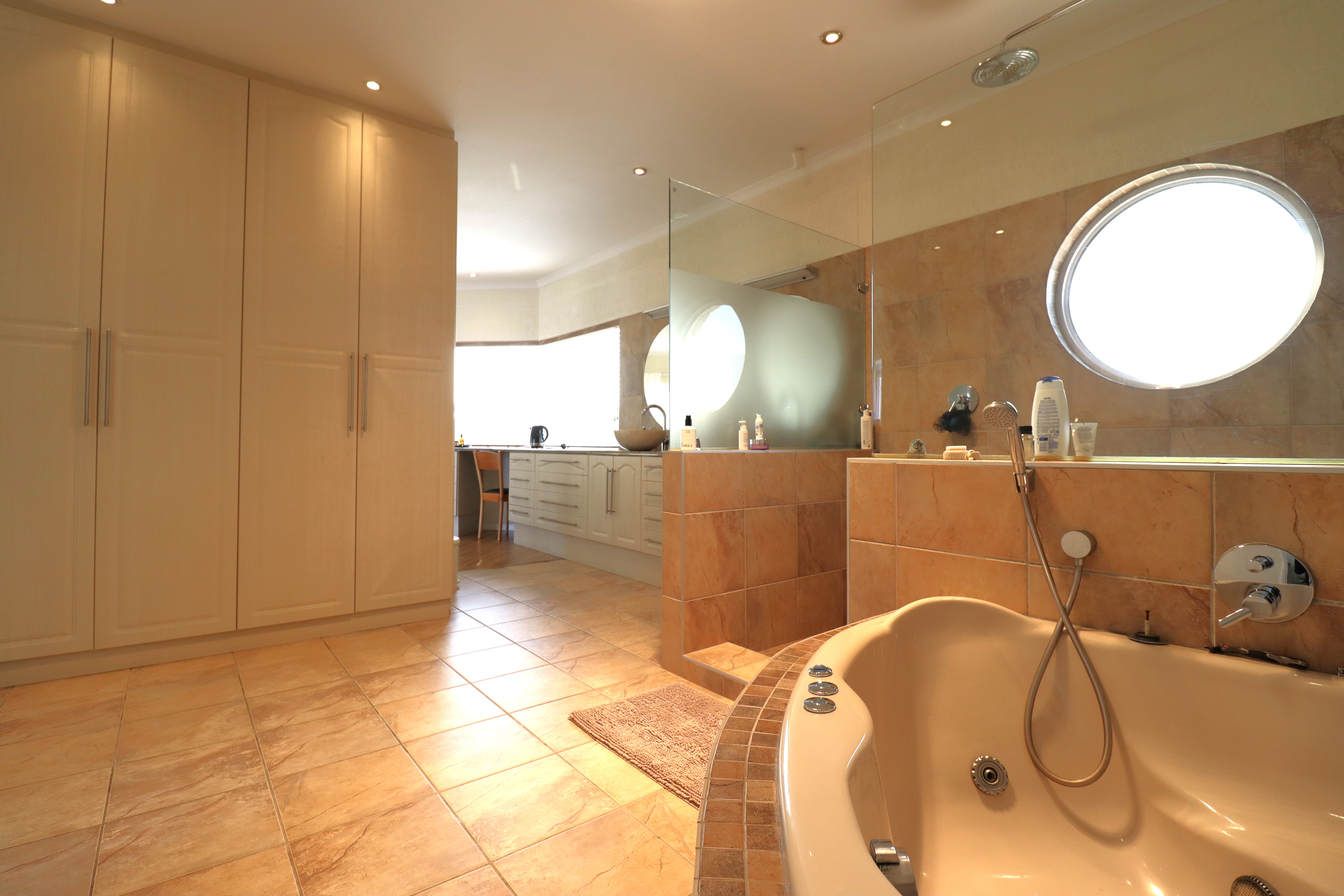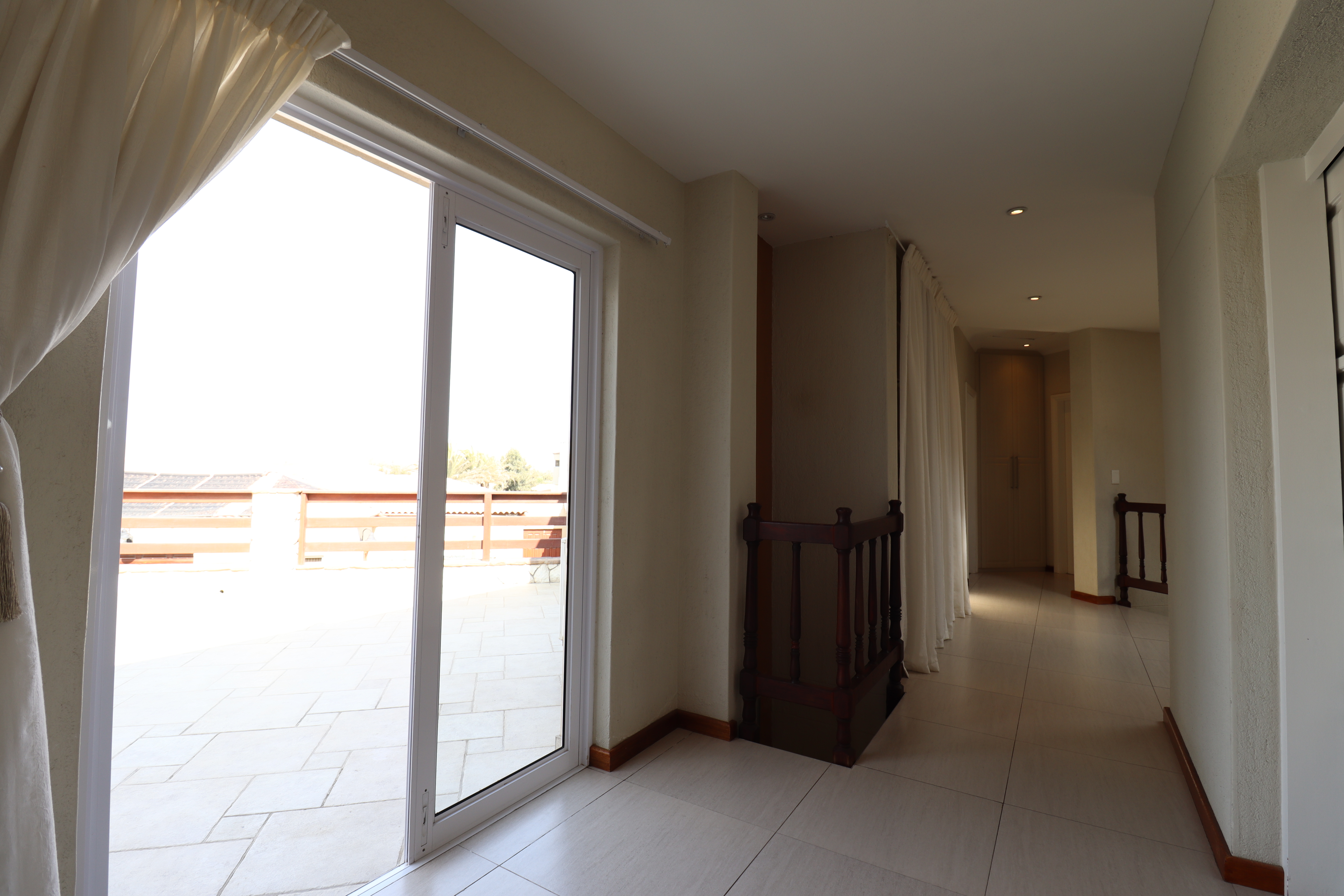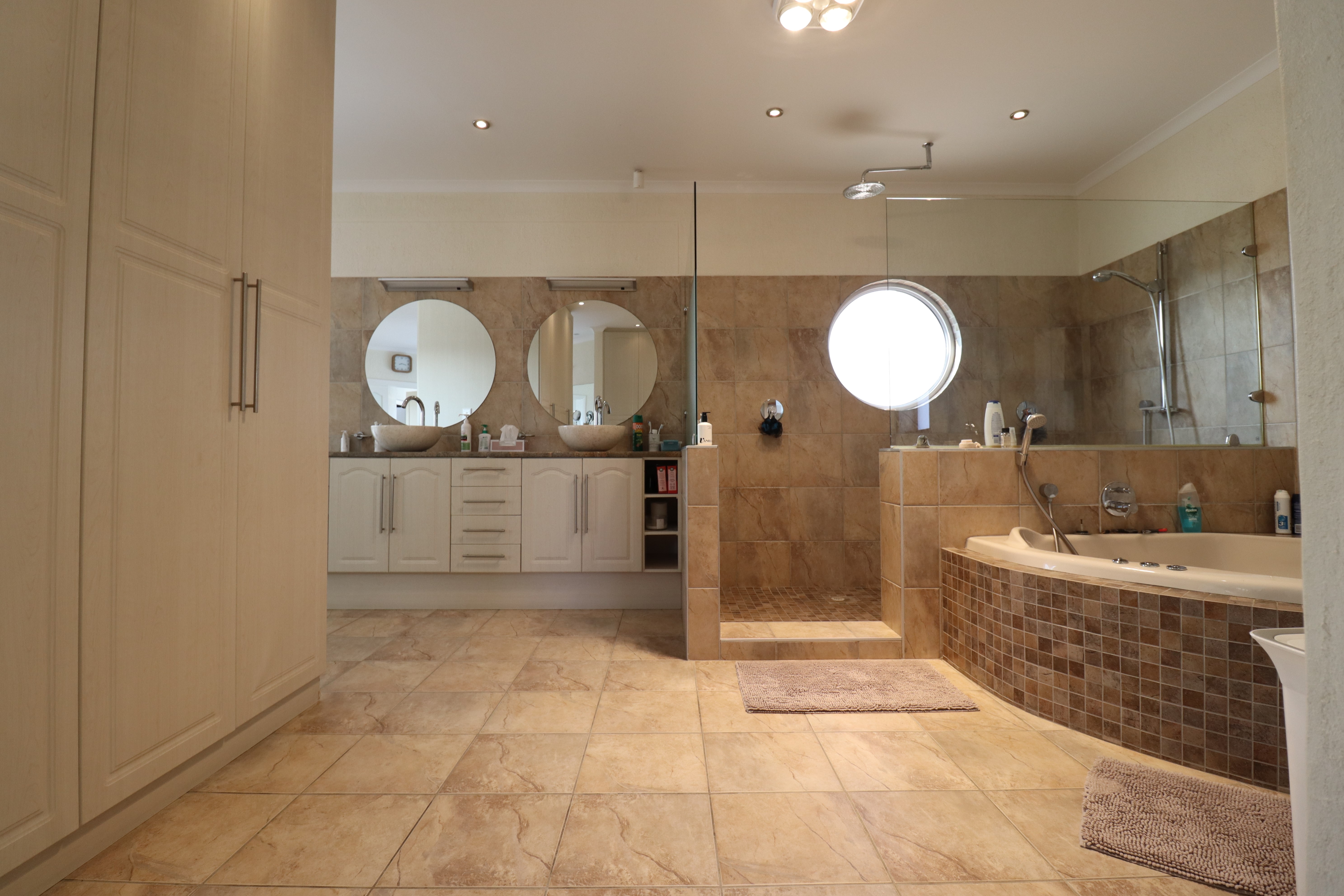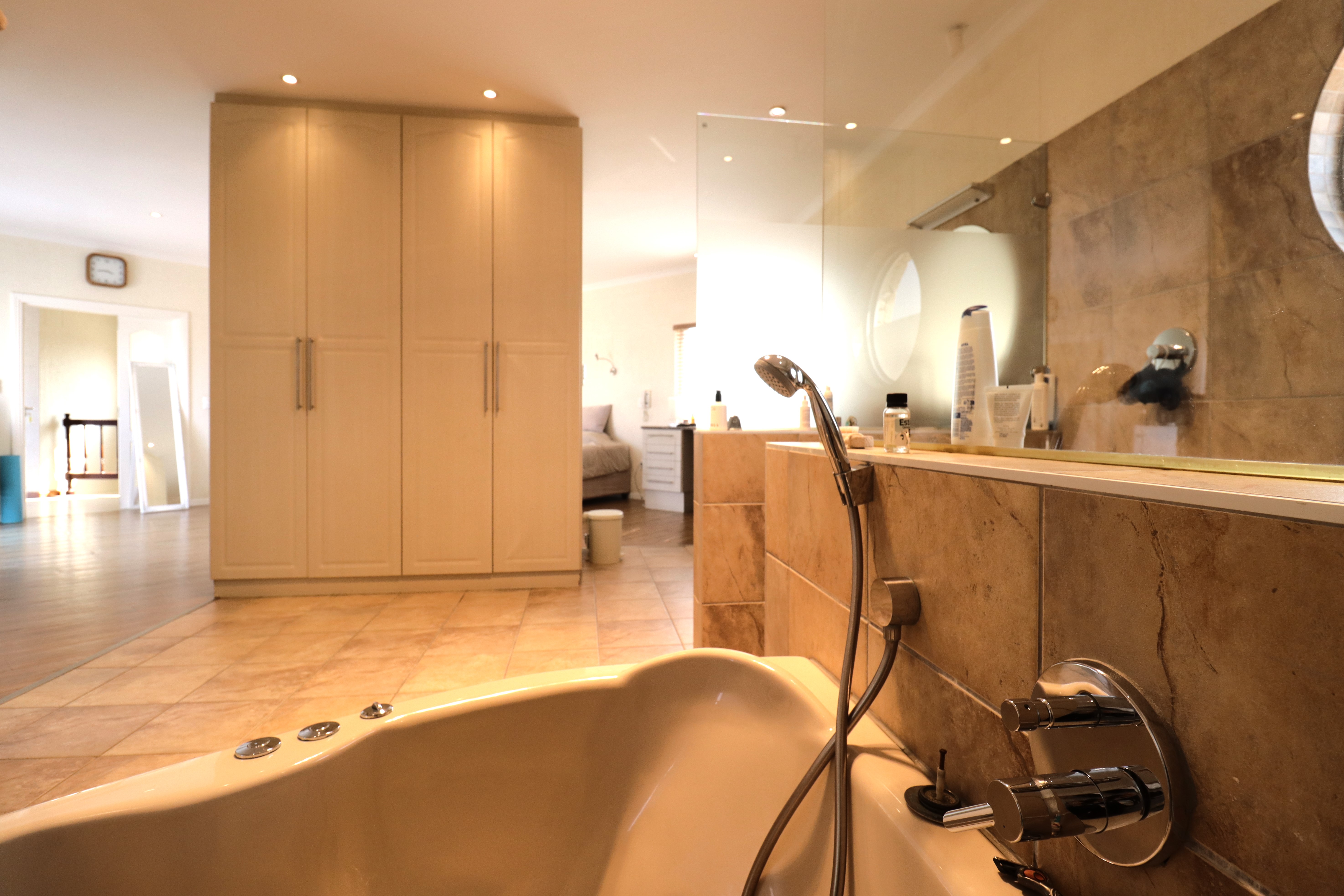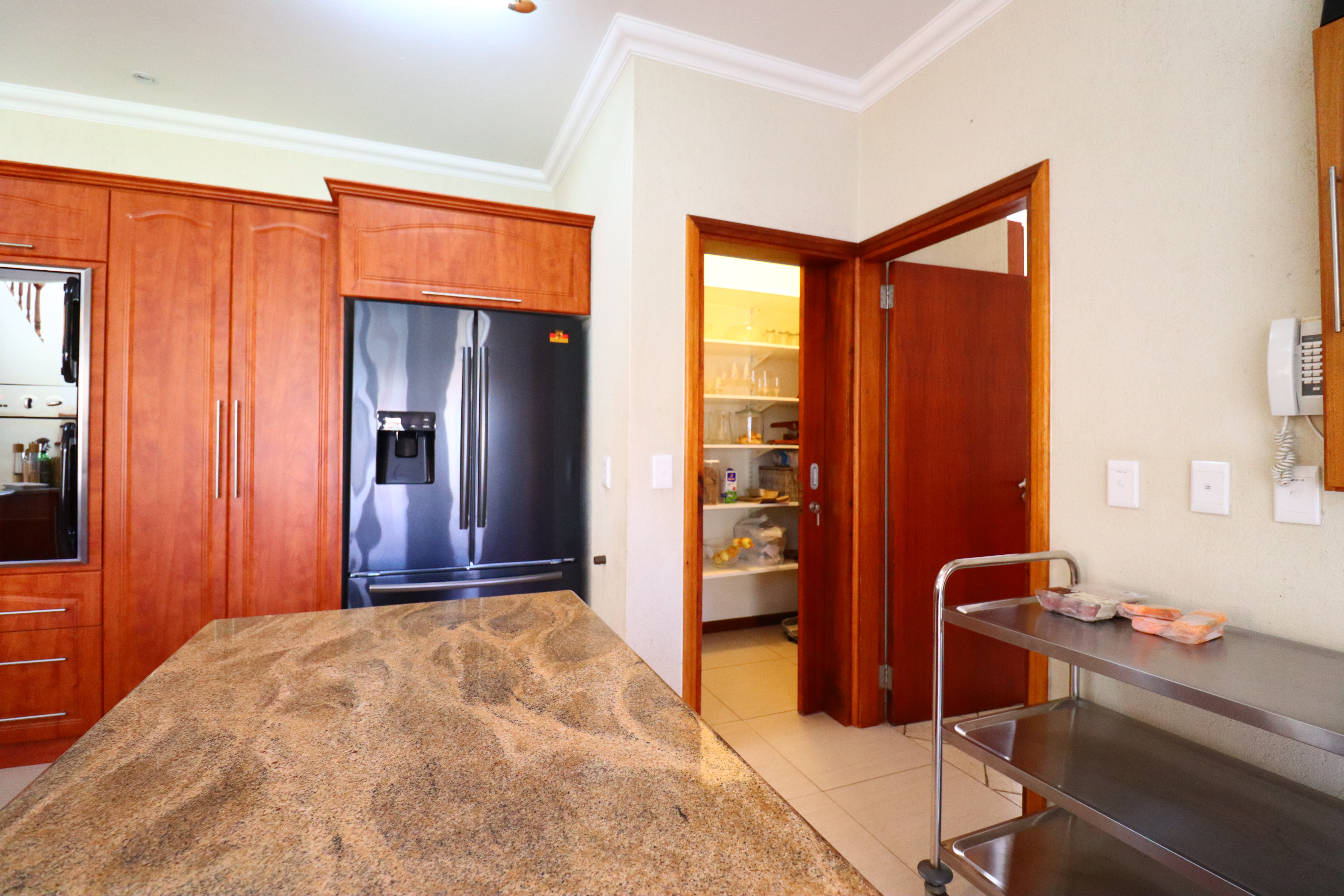 Four additional family bedrooms, each with ensuite bathrooms, are split between upstairs and downstairs. The lounge features a cozy gas fireplace, and the dining area and kitchen, equipped with underfloor heating, seamlessly connect. An indoor BBQ space also opens to the garden. The luxury gourmet kitchen showcases granite countertops, a gas grill, oven, glass top hob, plenty of built-in cupboards, and a separate scullery with a cold room.