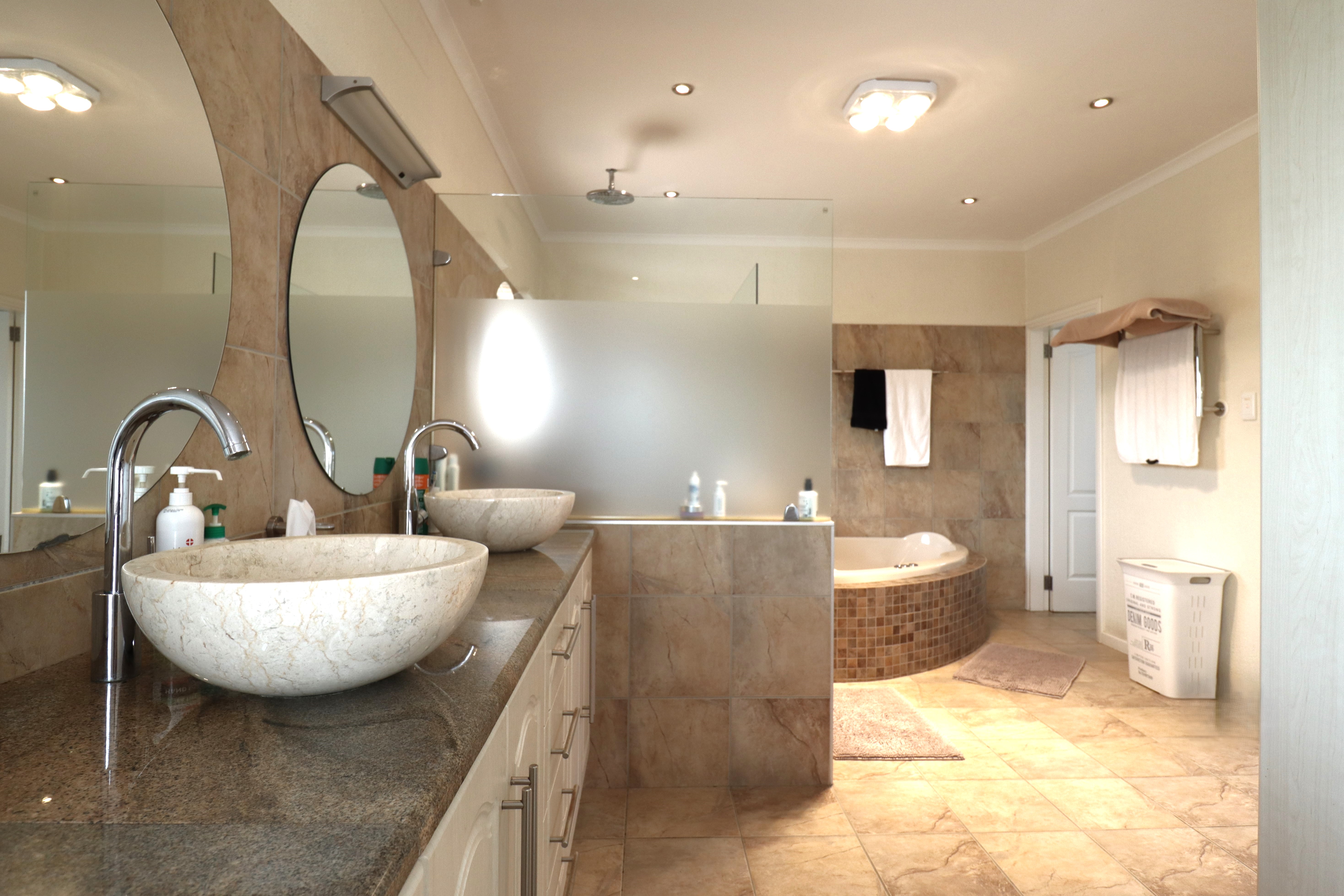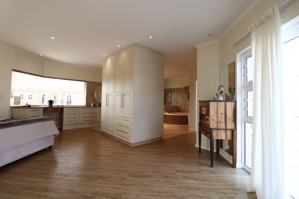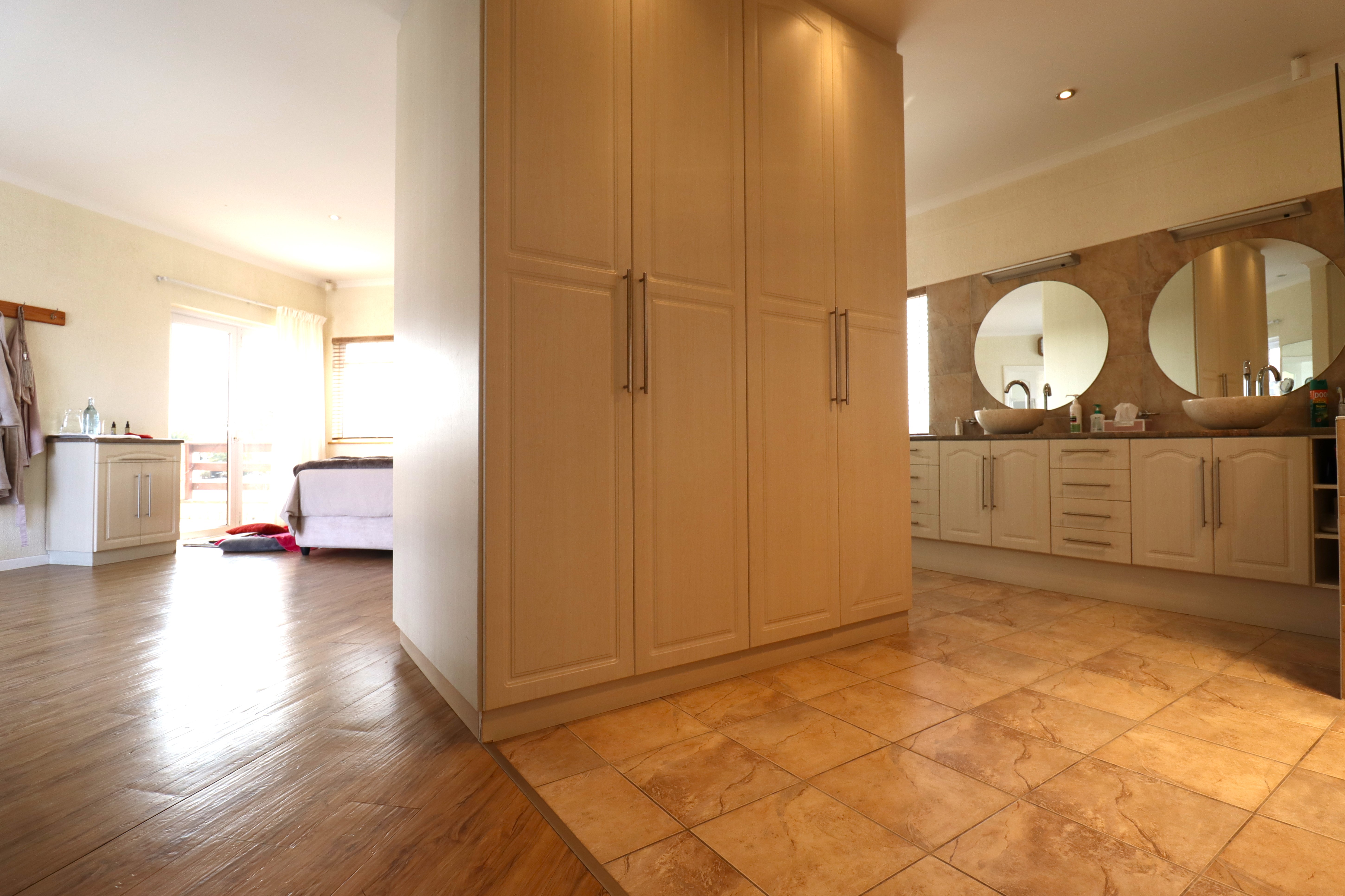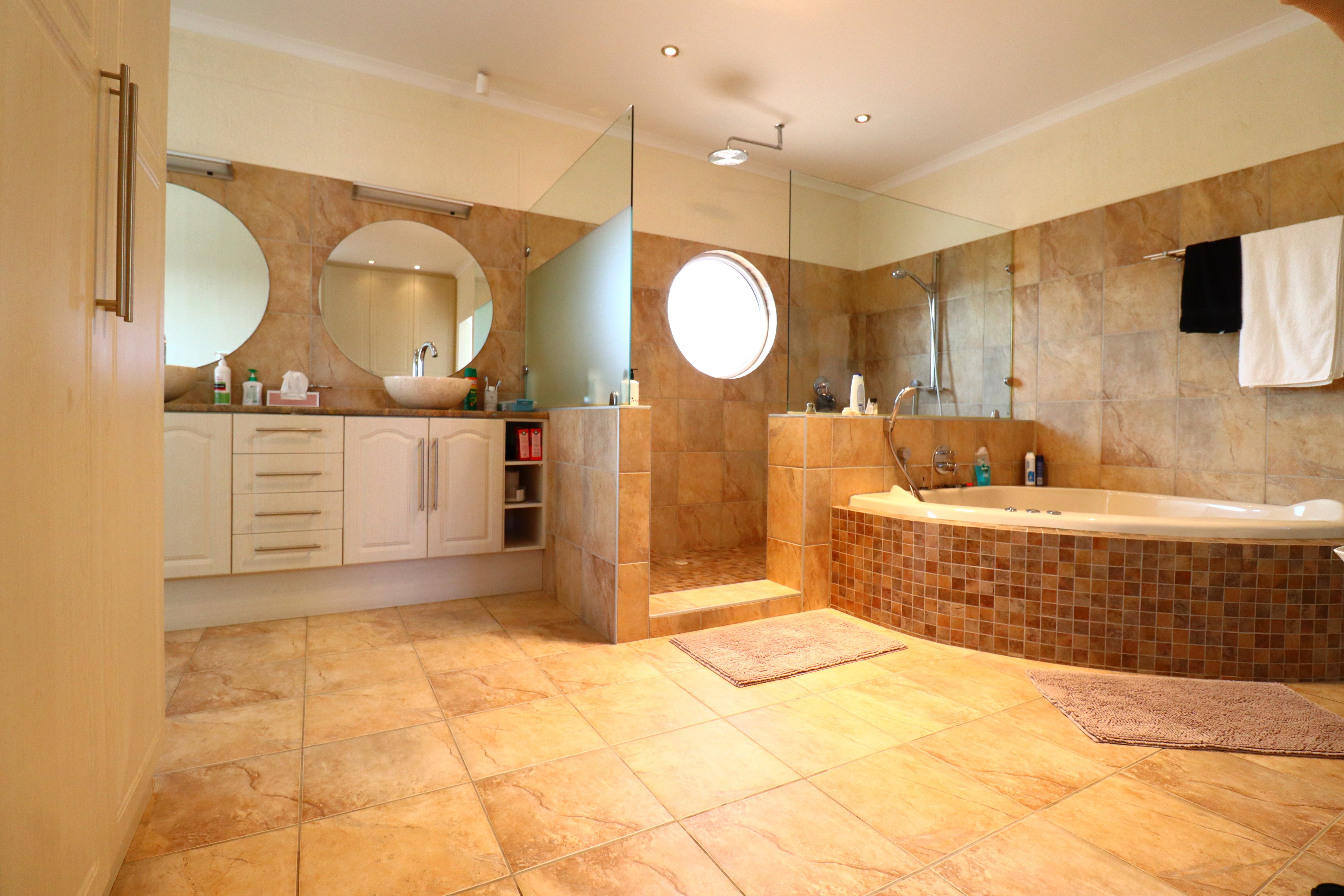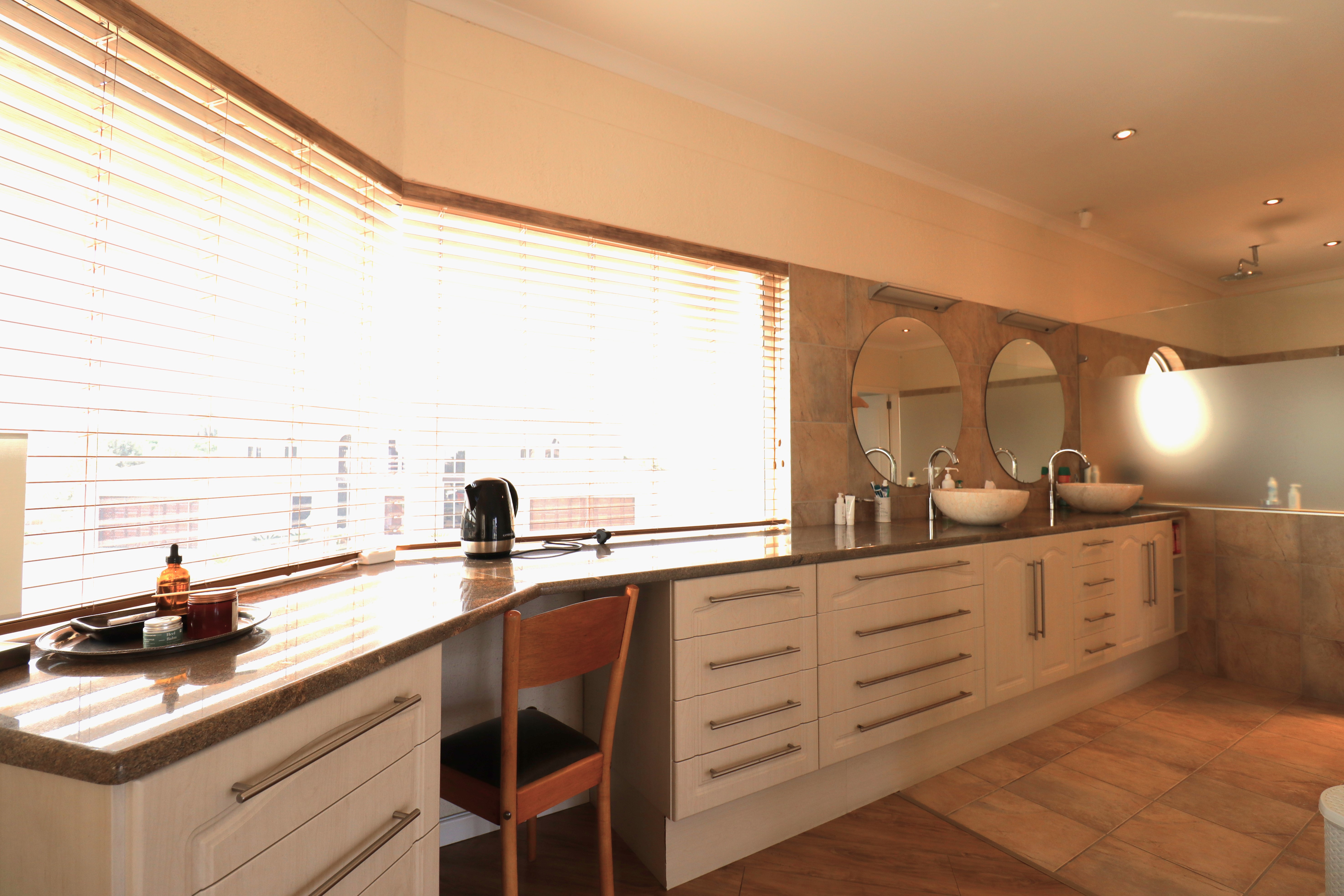 Four additional family bedrooms, each with ensuite bathrooms, are split between upstairs and downstairs. The lounge features a cozy gas fireplace, and the dining area and kitchen, equipped with underfloor heating, seamlessly connect. An indoor BBQ space also opens to the garden. The luxury gourmet kitchen showcases granite countertops, a gas grill, oven, glass top hob, plenty of built-in cupboards, and a separate scullery with a cold room.