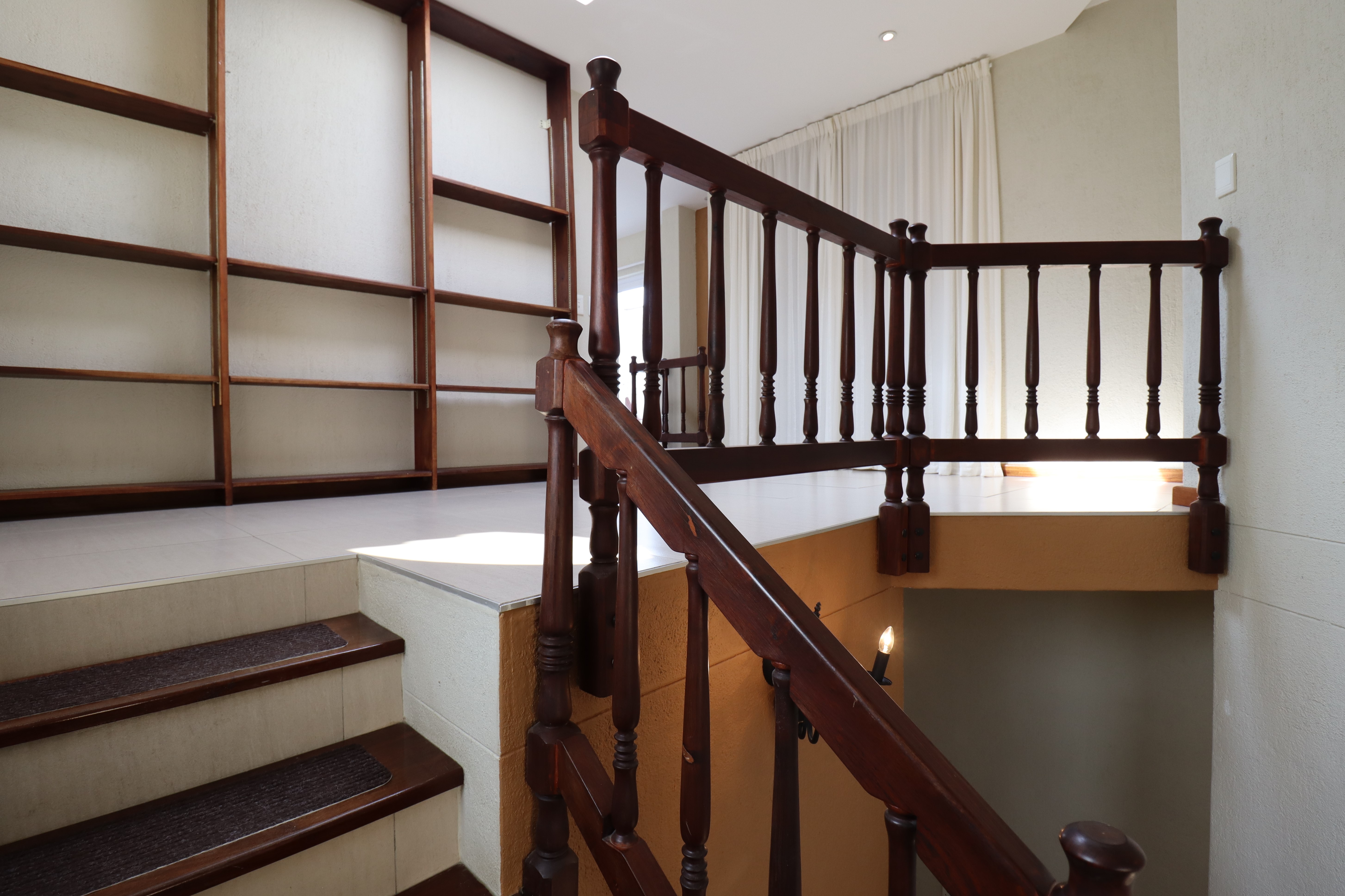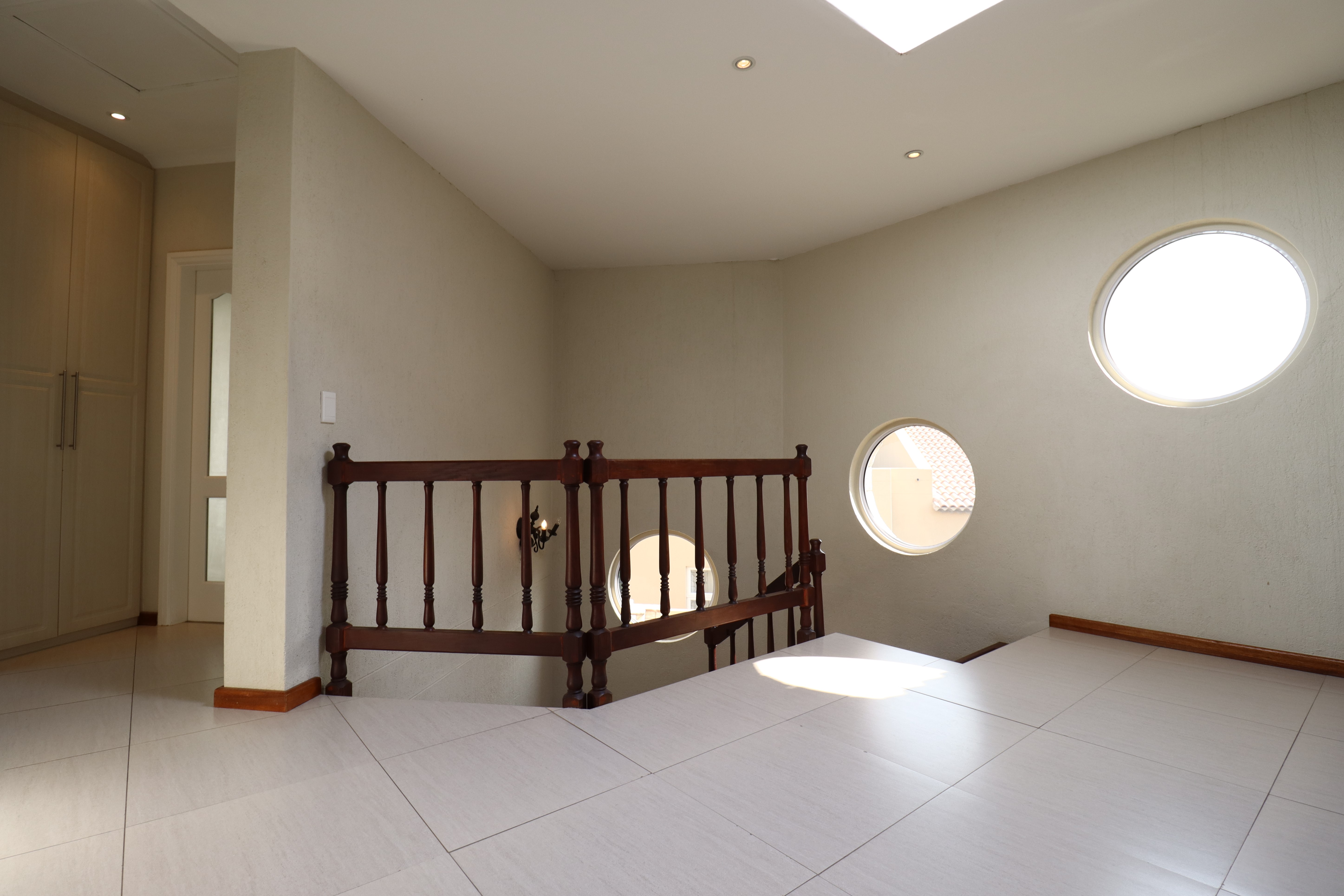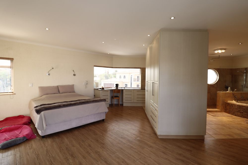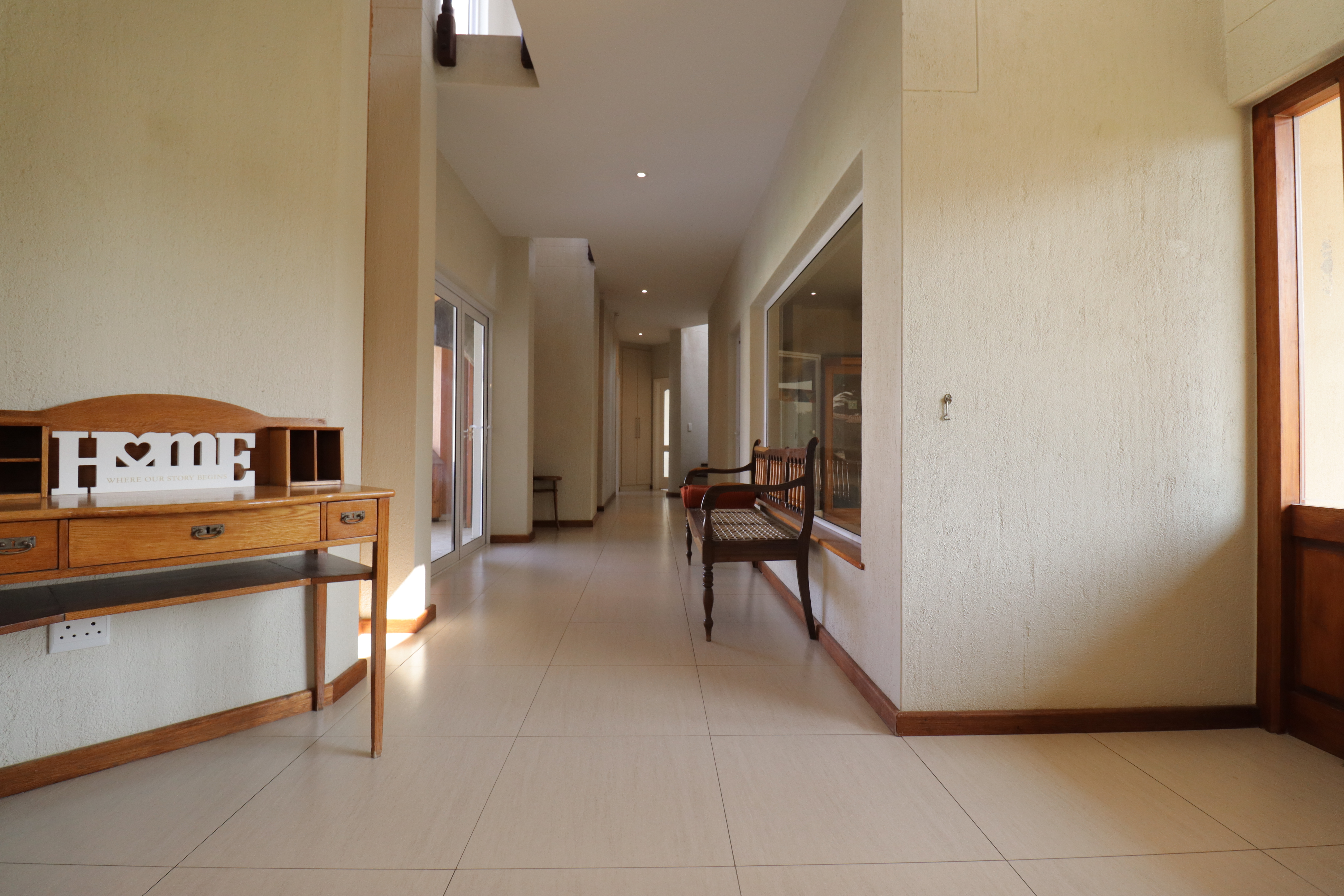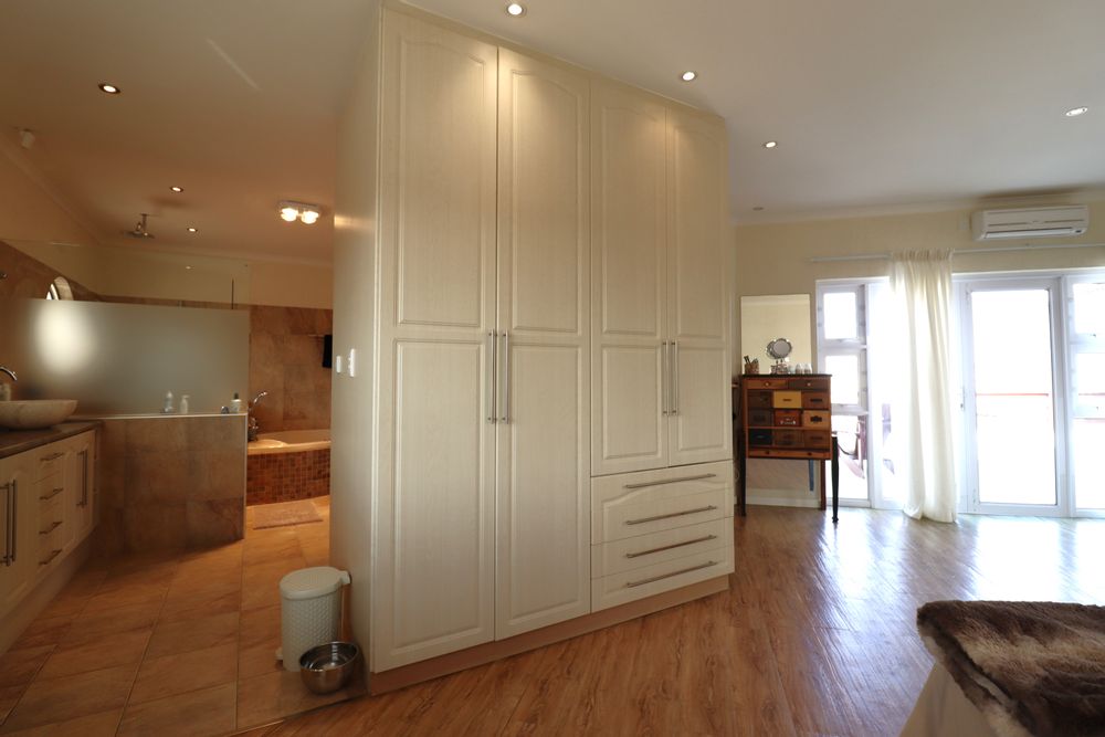 Four additional family bedrooms, each with ensuite bathrooms, are split between upstairs and downstairs. The lounge features a cozy gas fireplace, and the dining area and kitchen, equipped with underfloor heating, seamlessly connect. An indoor BBQ space also opens to the garden. The luxury gourmet kitchen showcases granite countertops, a gas grill, oven, glass top hob, plenty of built-in cupboards, and a separate scullery with a cold room.
