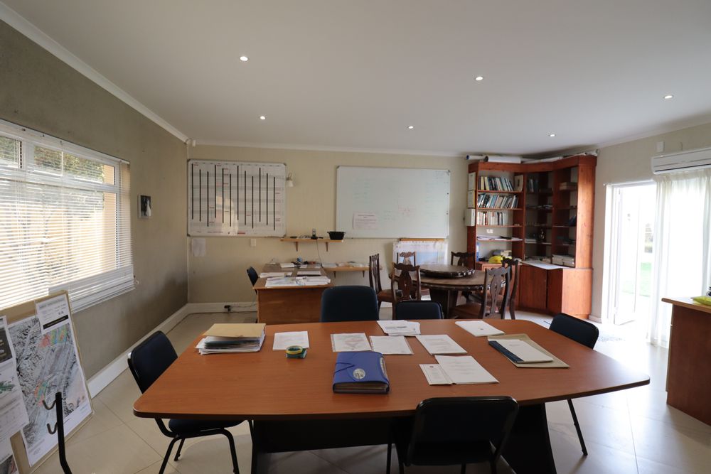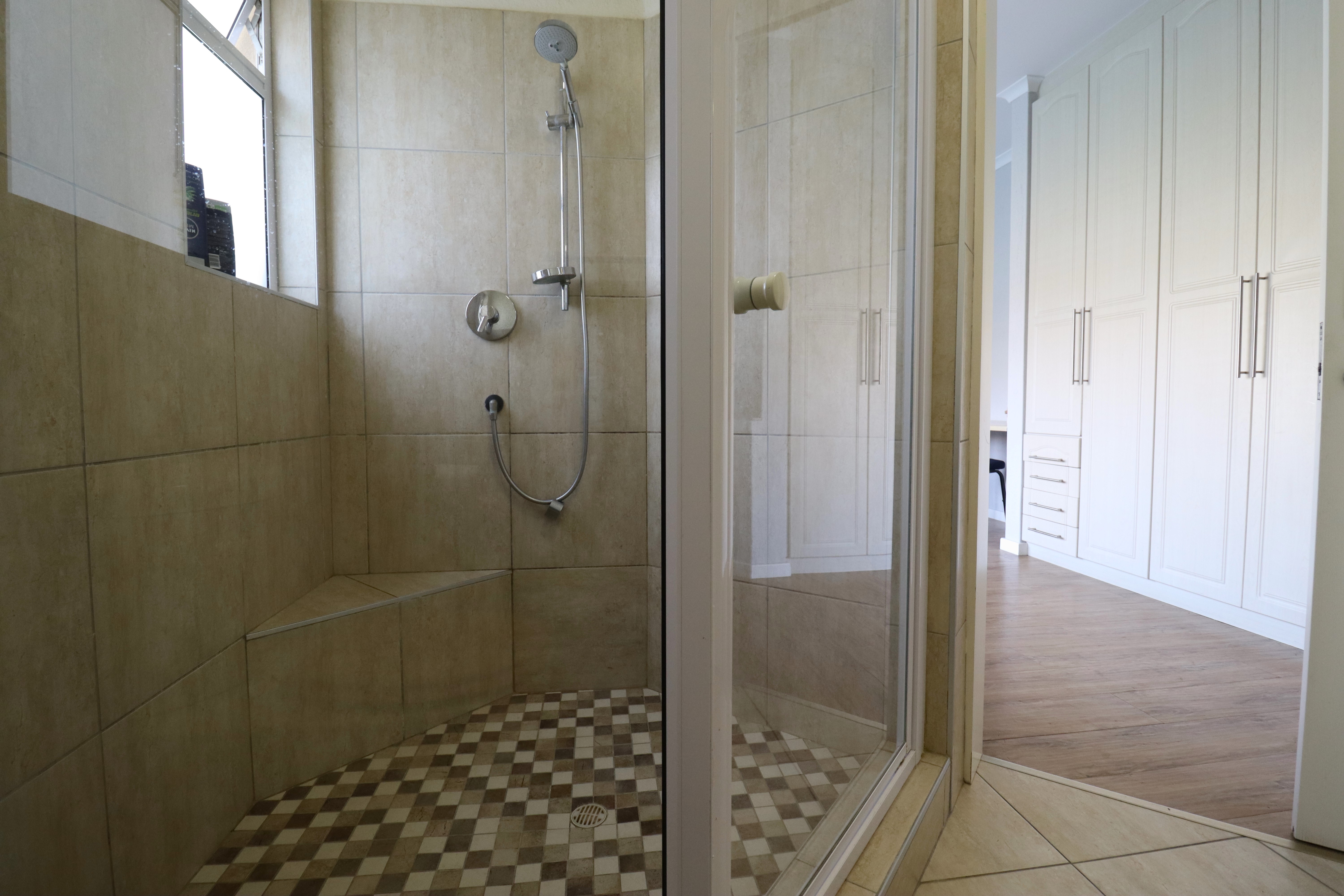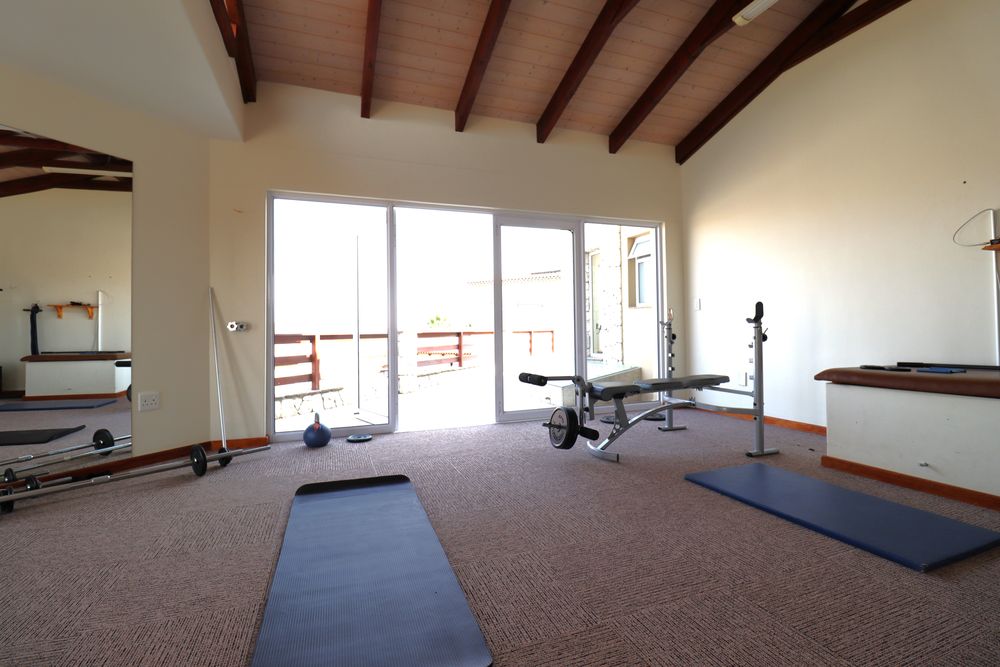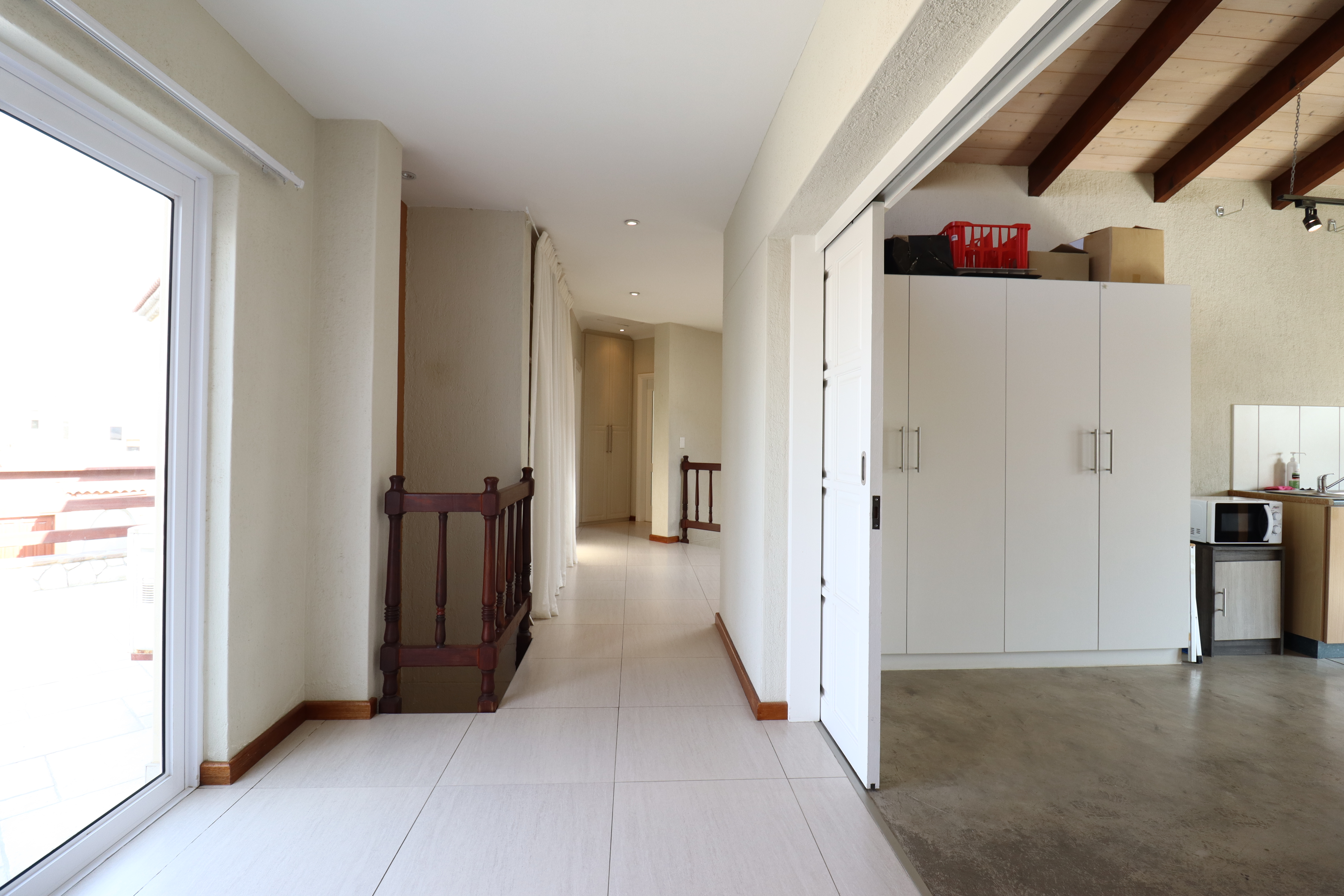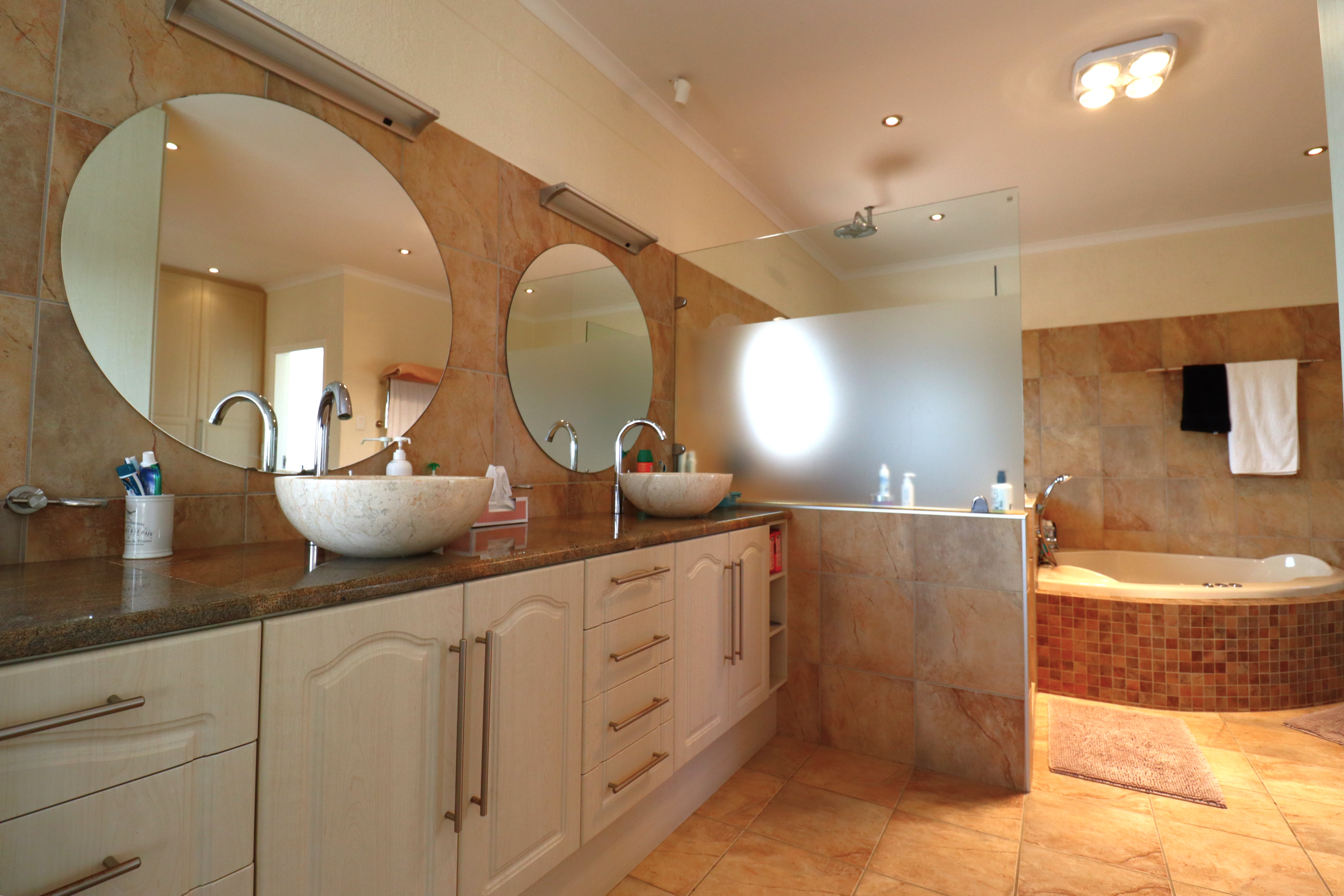 Four additional family bedrooms, each with ensuite bathrooms, are split between upstairs and downstairs. The lounge features a cozy gas fireplace, and the dining area and kitchen, equipped with underfloor heating, seamlessly connect. An indoor BBQ space also opens to the garden. The luxury gourmet kitchen showcases granite countertops, a gas grill, oven, glass top hob, plenty of built-in cupboards, and a separate scullery with a cold room.
