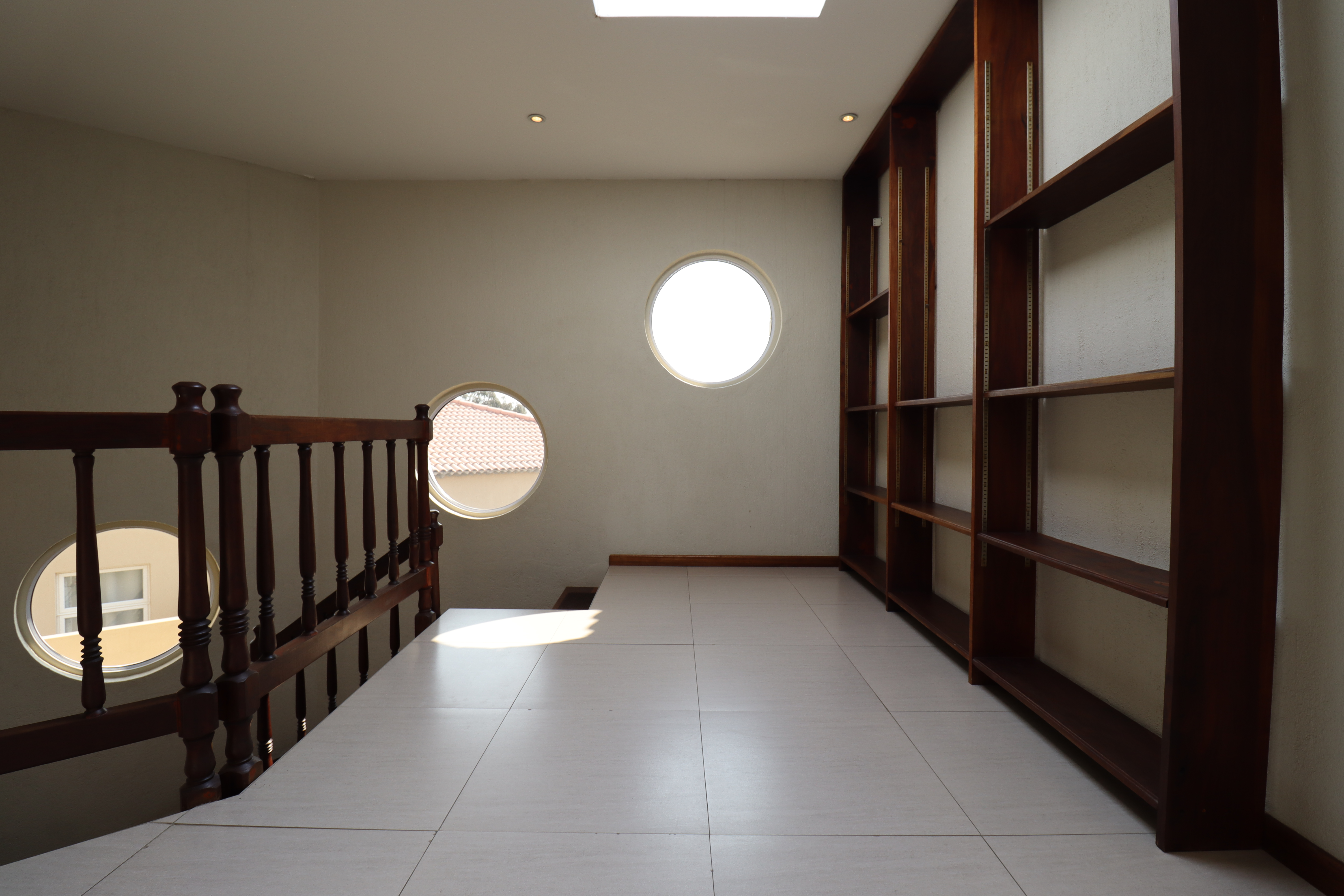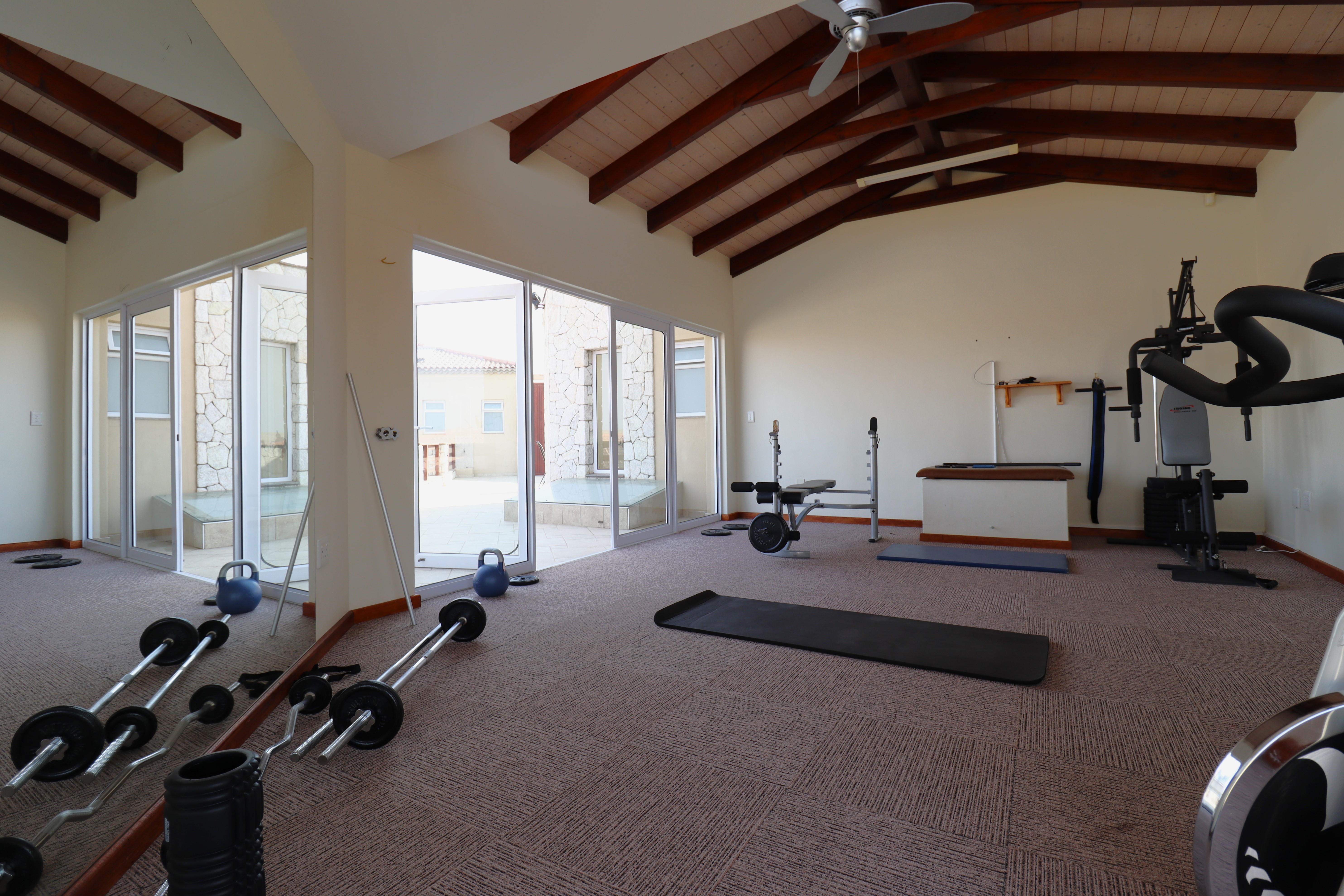 Upstairs, the spacious main ensuite bedroom includes a kitchenette, two basins, a sauna bath, shower, and private WC, along with ample built-in cupboards. It boasts a huge balcony with a private staircase leading to the ground floor. Adjacent to the balcony is a spacious gym, while the corridor opens onto a large entertainment area with an additional small balcony.